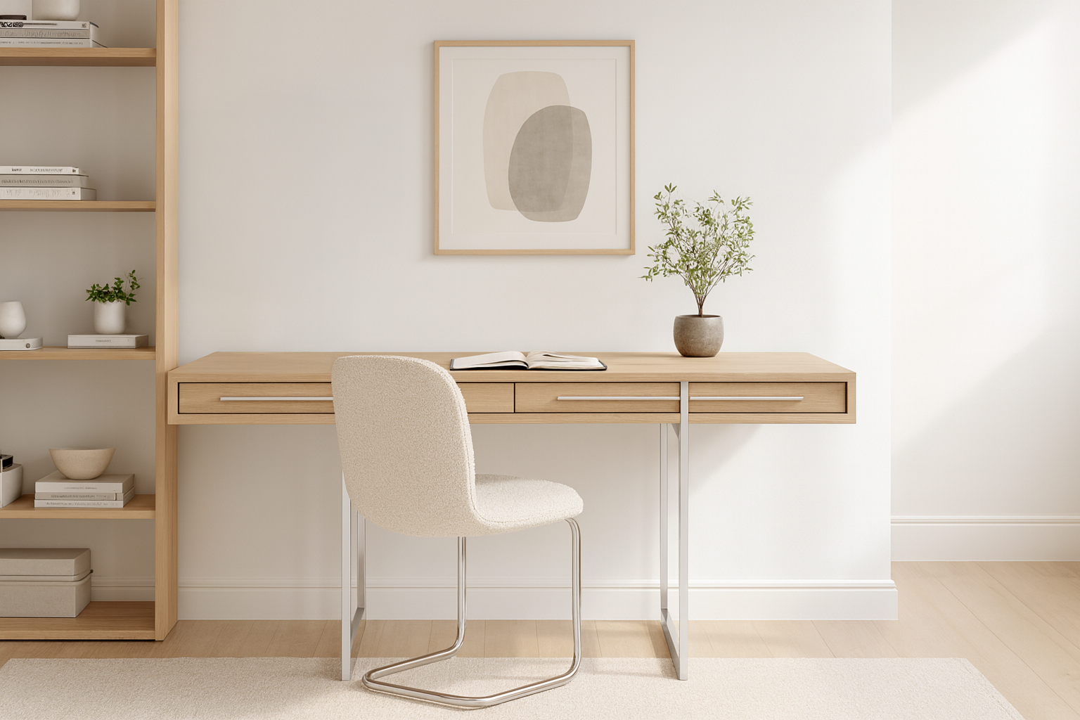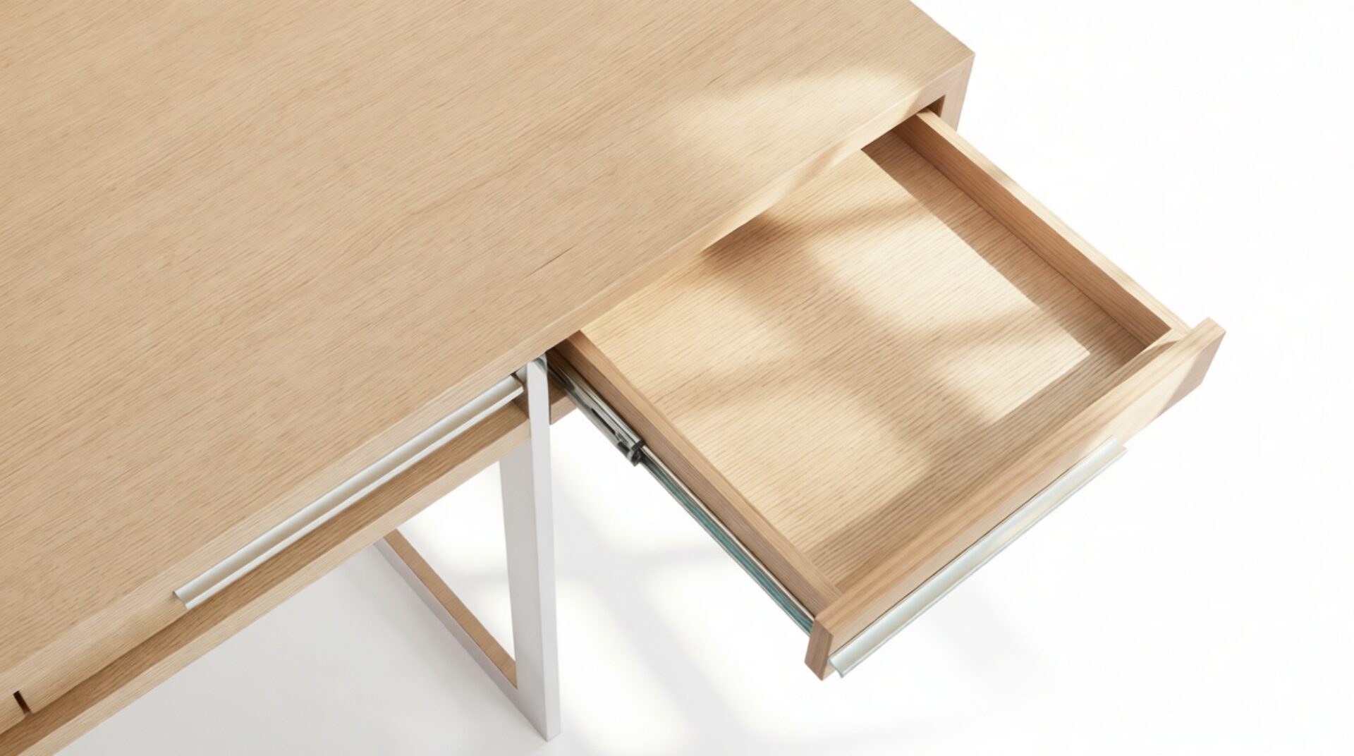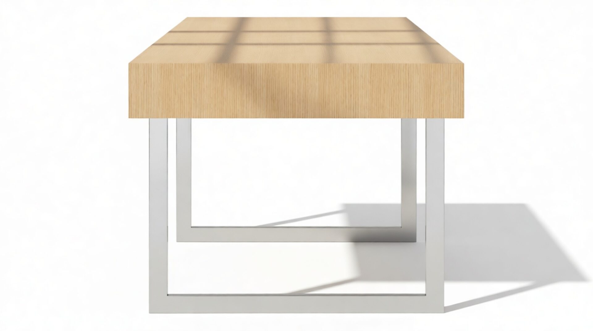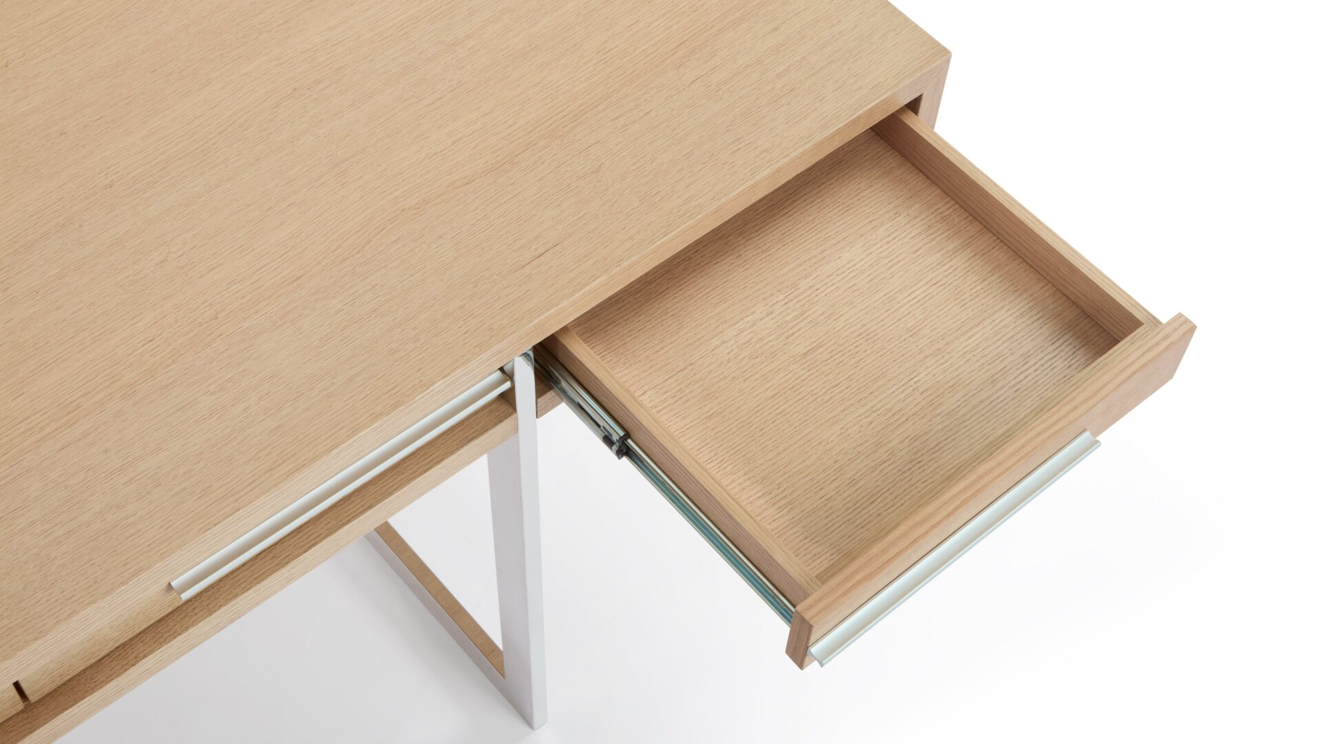 Enhance your workspace with the Naver Desk boasting a stunning natural oak veneer finish and seamlessly integrated stainless steel legs. The sleek and open design of the desk's base adds an airy touch, contributing to its light and modern aesthetic.