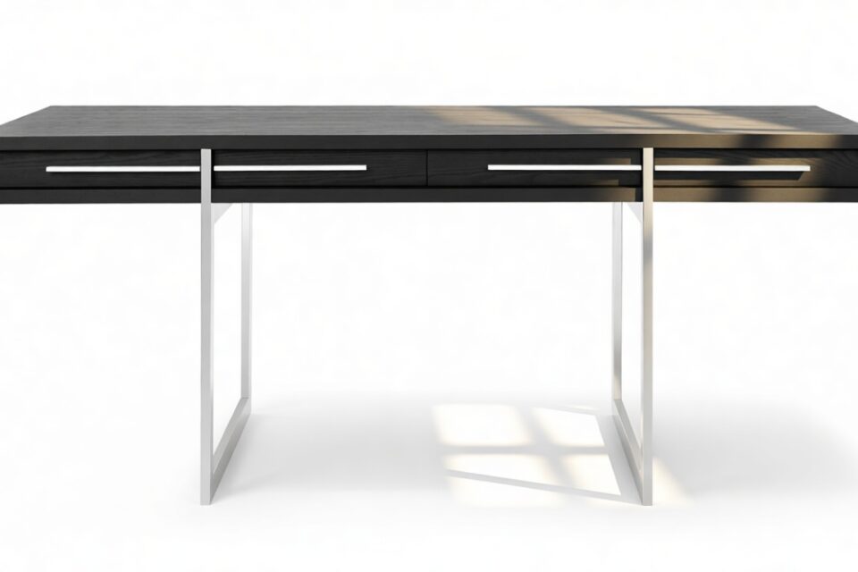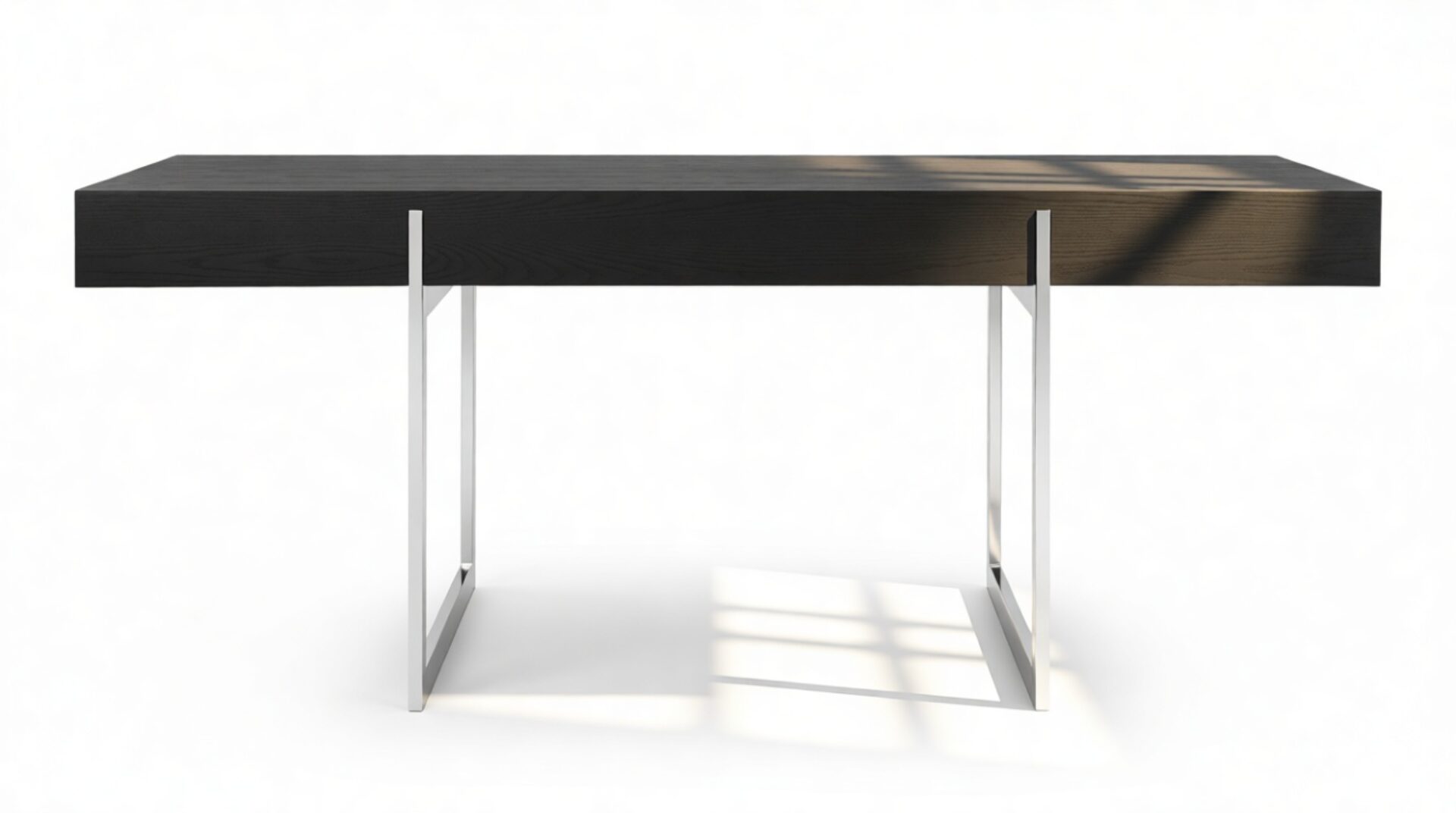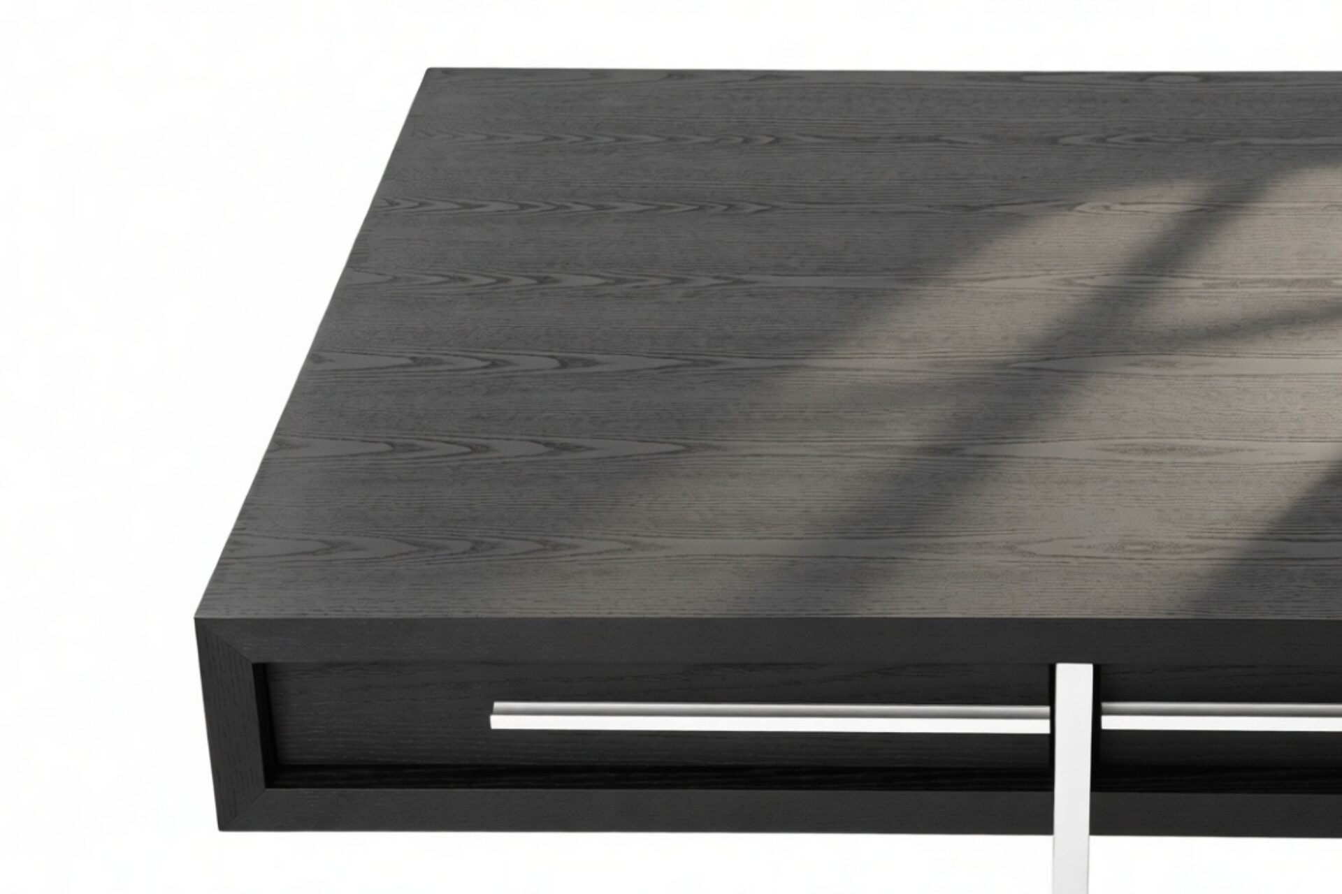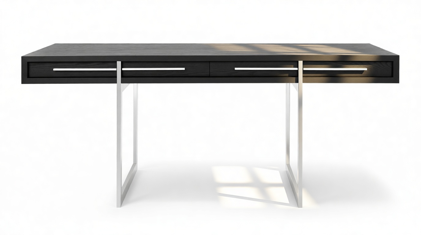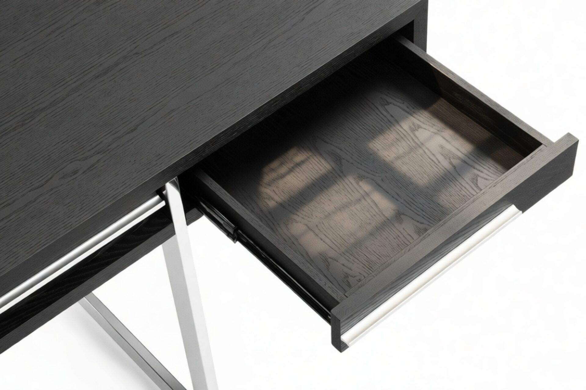 Enhance your workspace with the Naver Desk showcasing a stunning natural walnut veneer and sleek stainless steel legs seamlessly blended into its design. The airy and open base of this desk not only adds a modern touch but also contributes to its light and refreshing appeal.