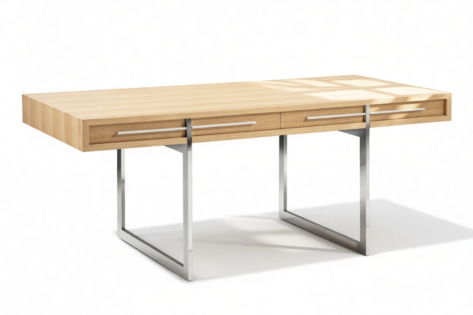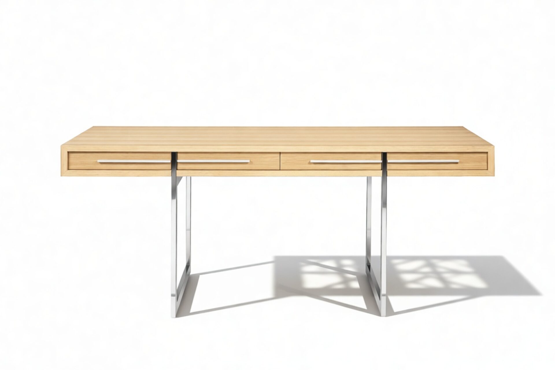 Introducing the Naver Desk, a mid-century modern masterpiece renowned for its sculptural elegance. Reflecting the enduring allure of mid-century aesthetics, this piece harmoniously blends form and function. Crafted from high-quality oak with stainless steel legs, it exudes timeless beauty. Elevate your workspace with this chic, oak-finished essential that promises both style and substance.