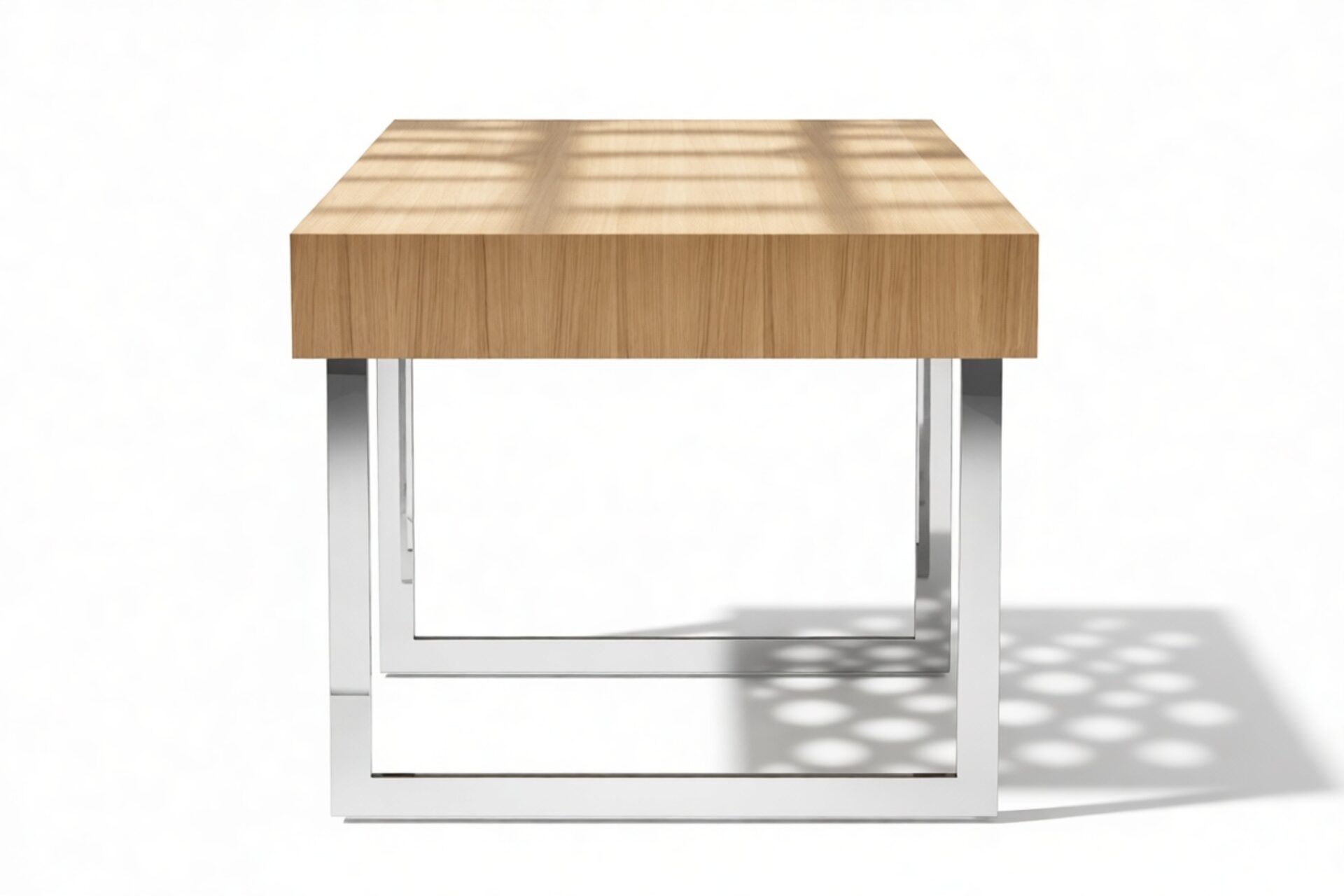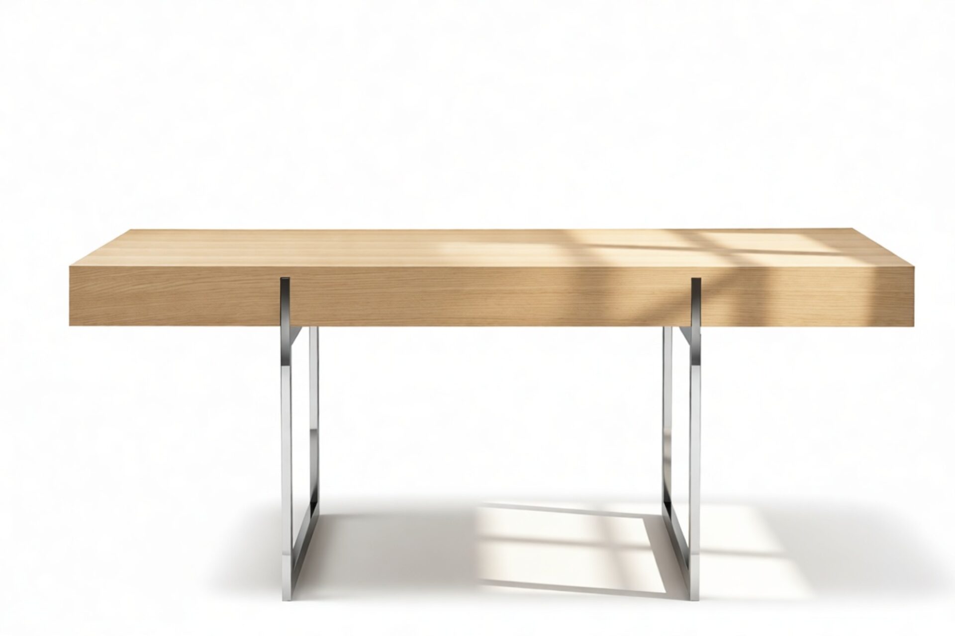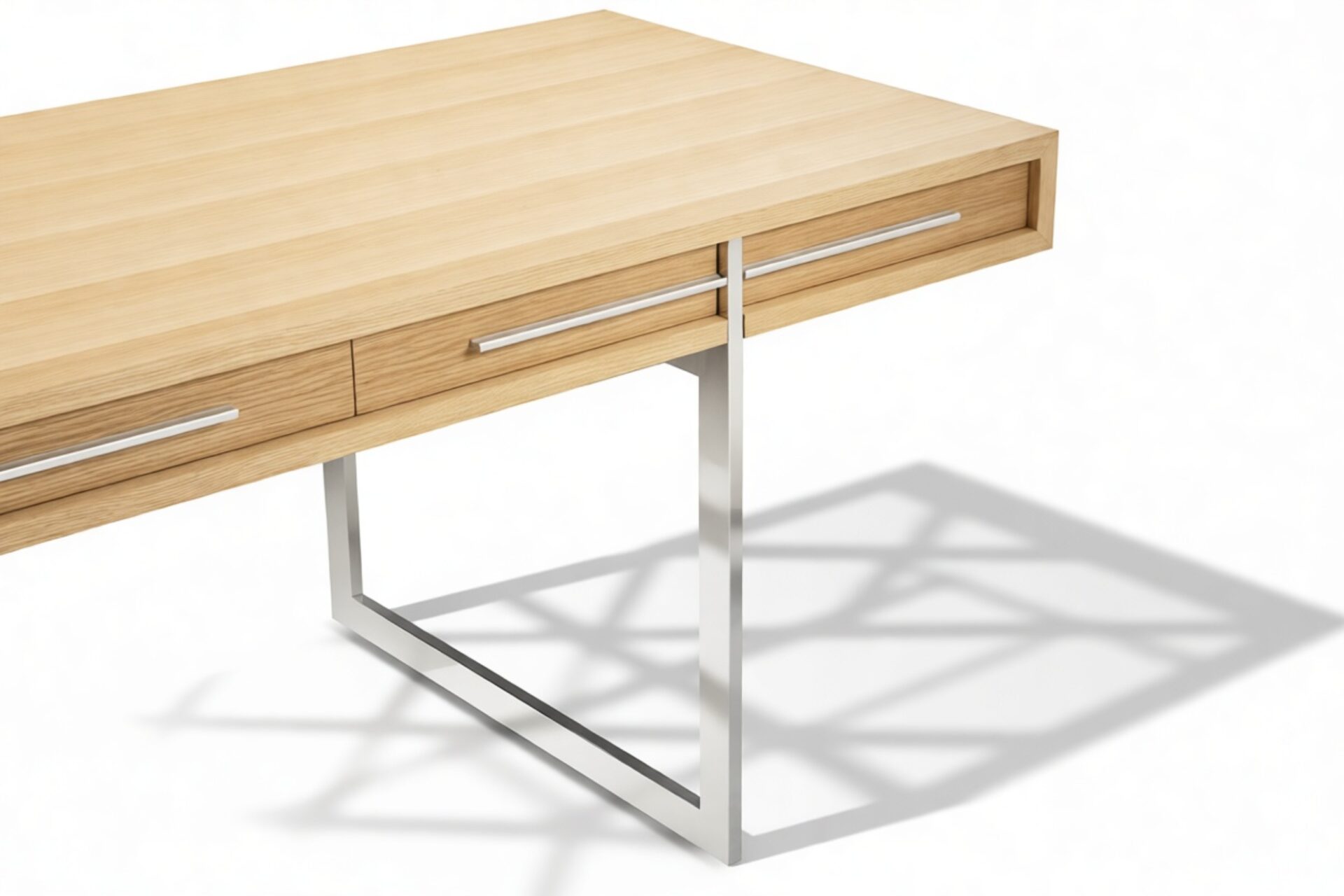 Enhance your workspace with the Naver Desk boasting a stunning natural oak veneer finish and seamlessly integrated stainless steel legs. The sleek and open design of the desk's base adds an airy touch, contributing to its light and modern aesthetic.