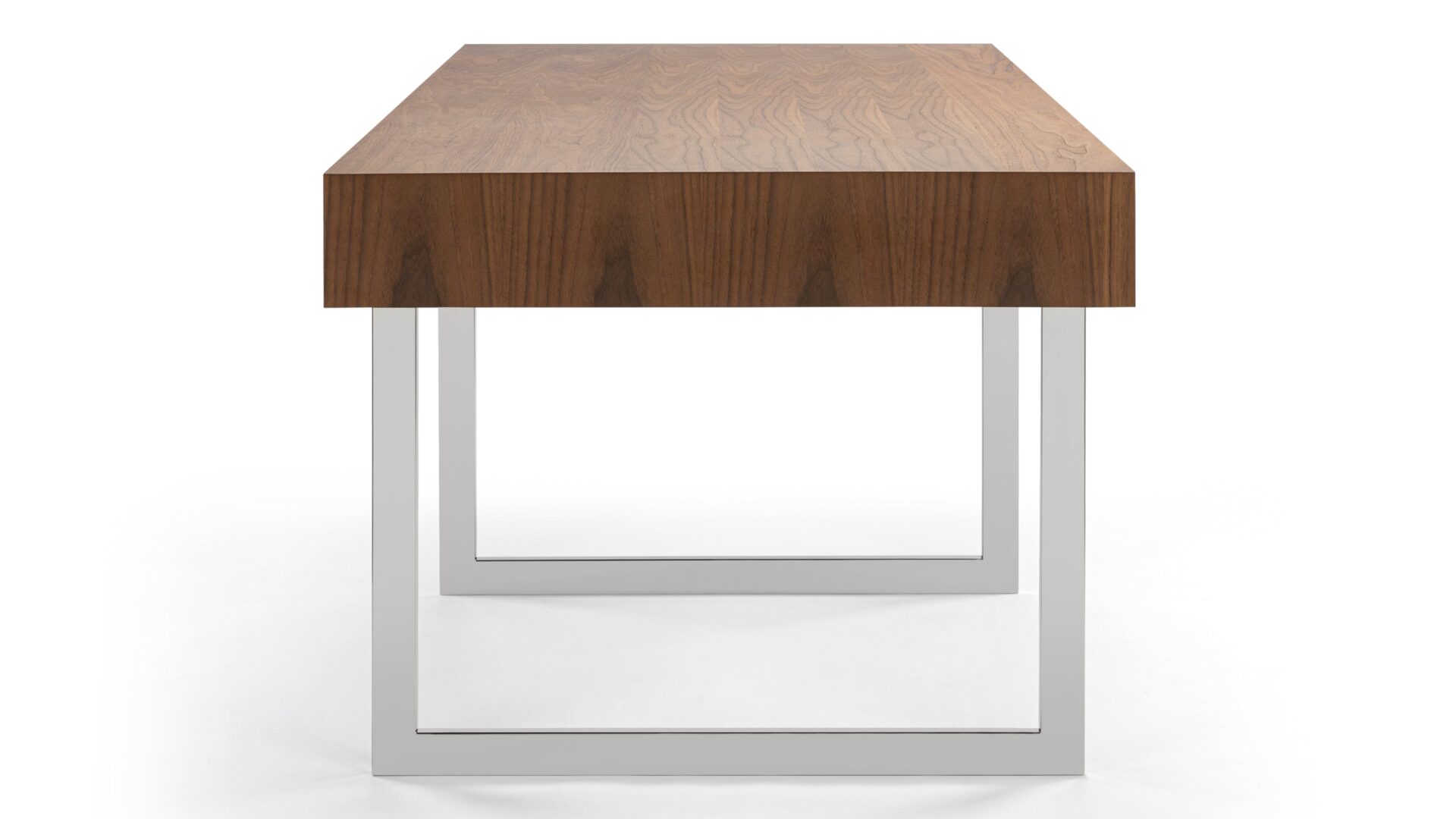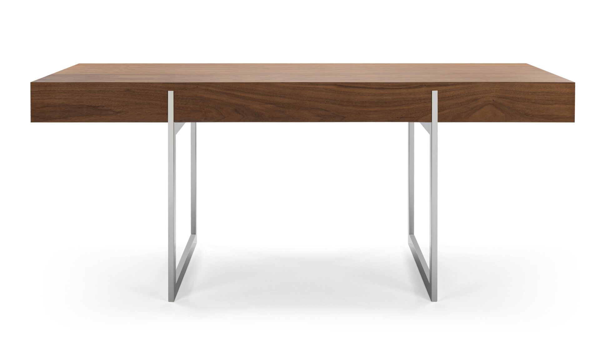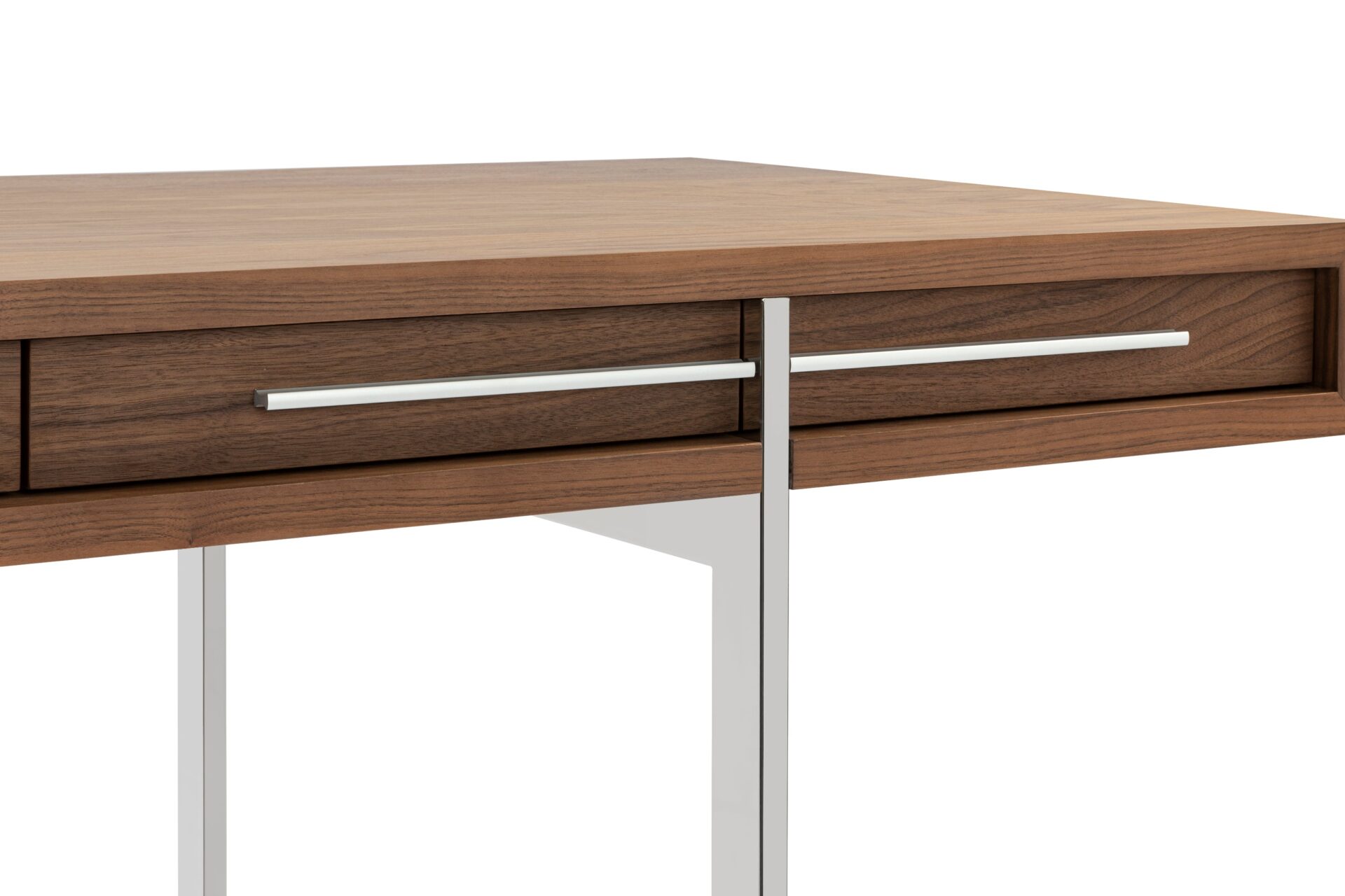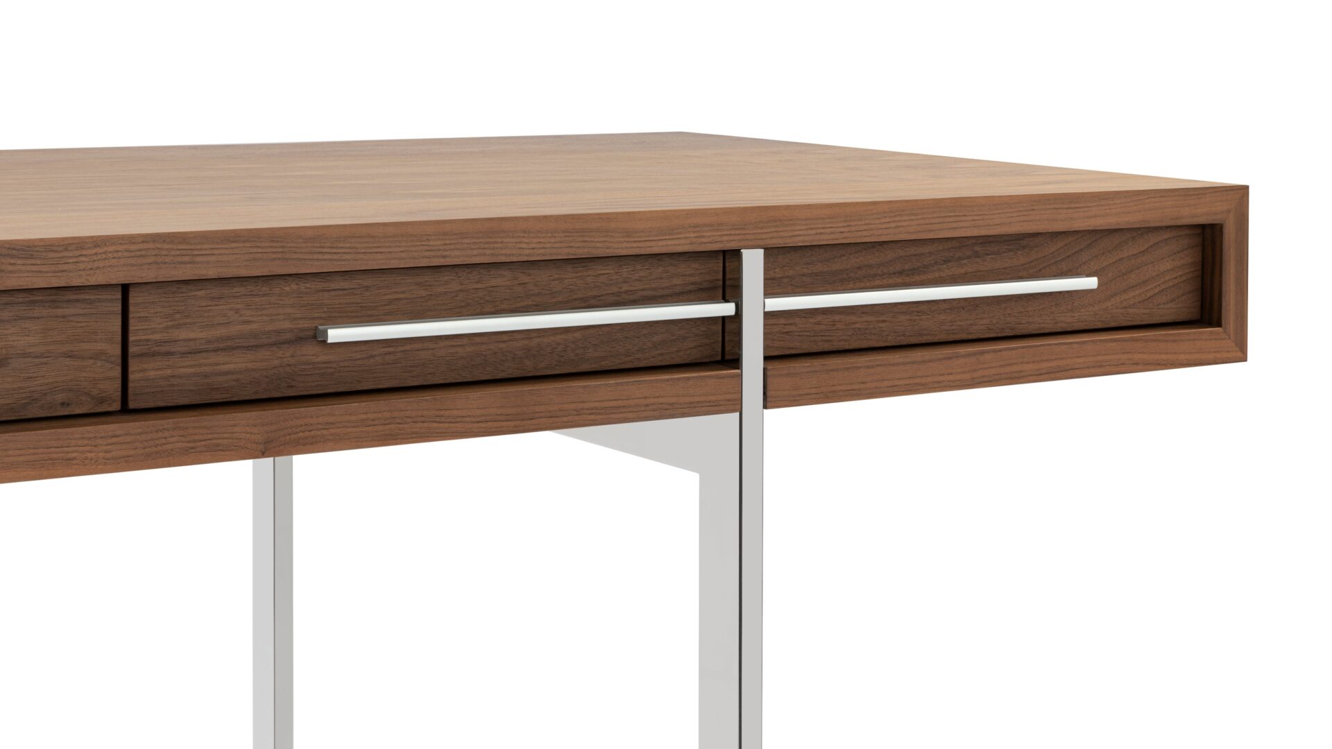 Enhance your workspace with the Naver Desk showcasing a stunning natural walnut veneer and sleek stainless steel legs seamlessly blended into its design. The airy and open base of this desk not only adds a modern touch but also contributes to its light and refreshing appeal.