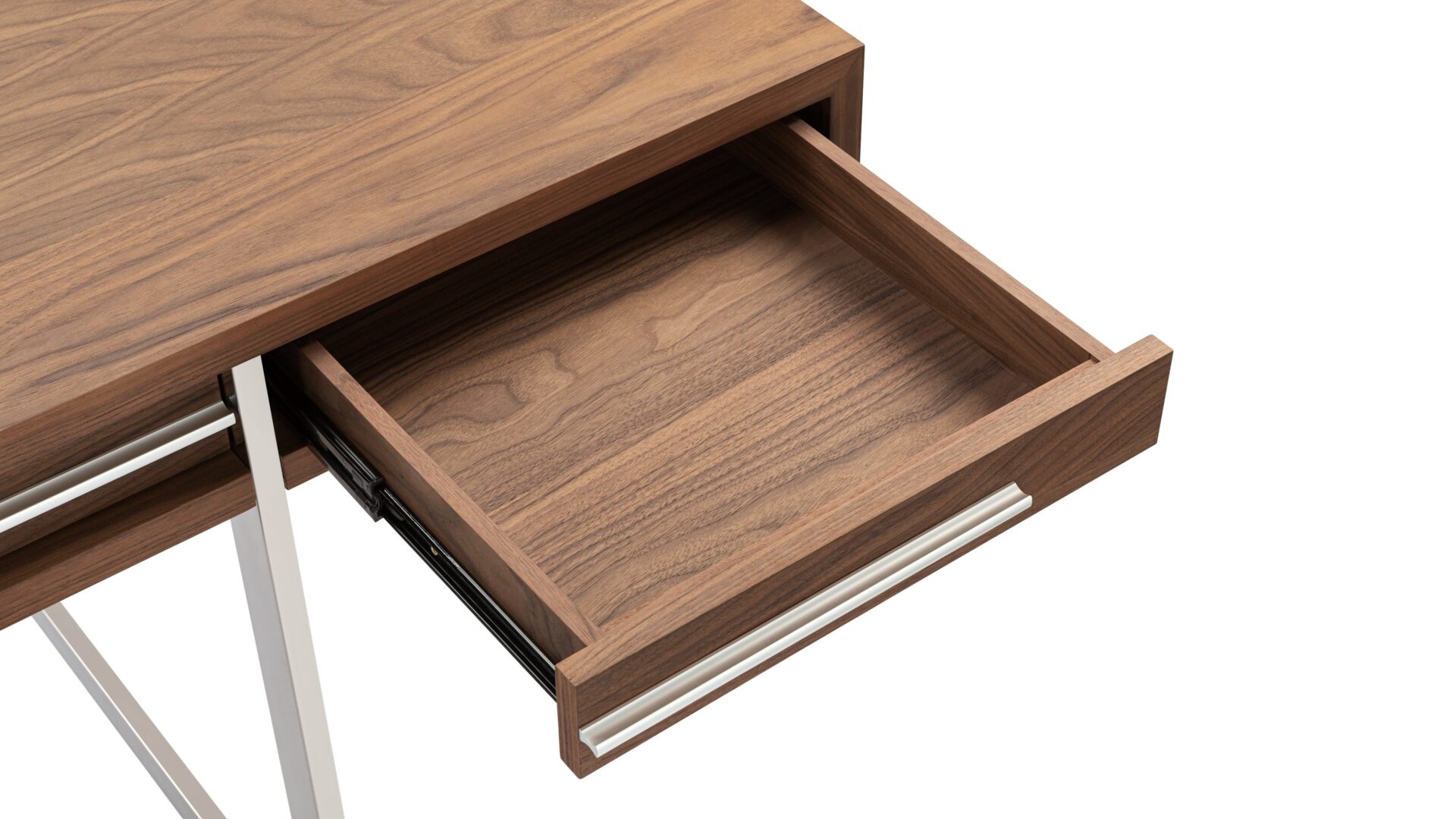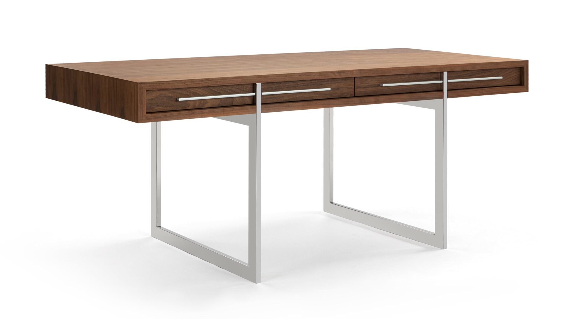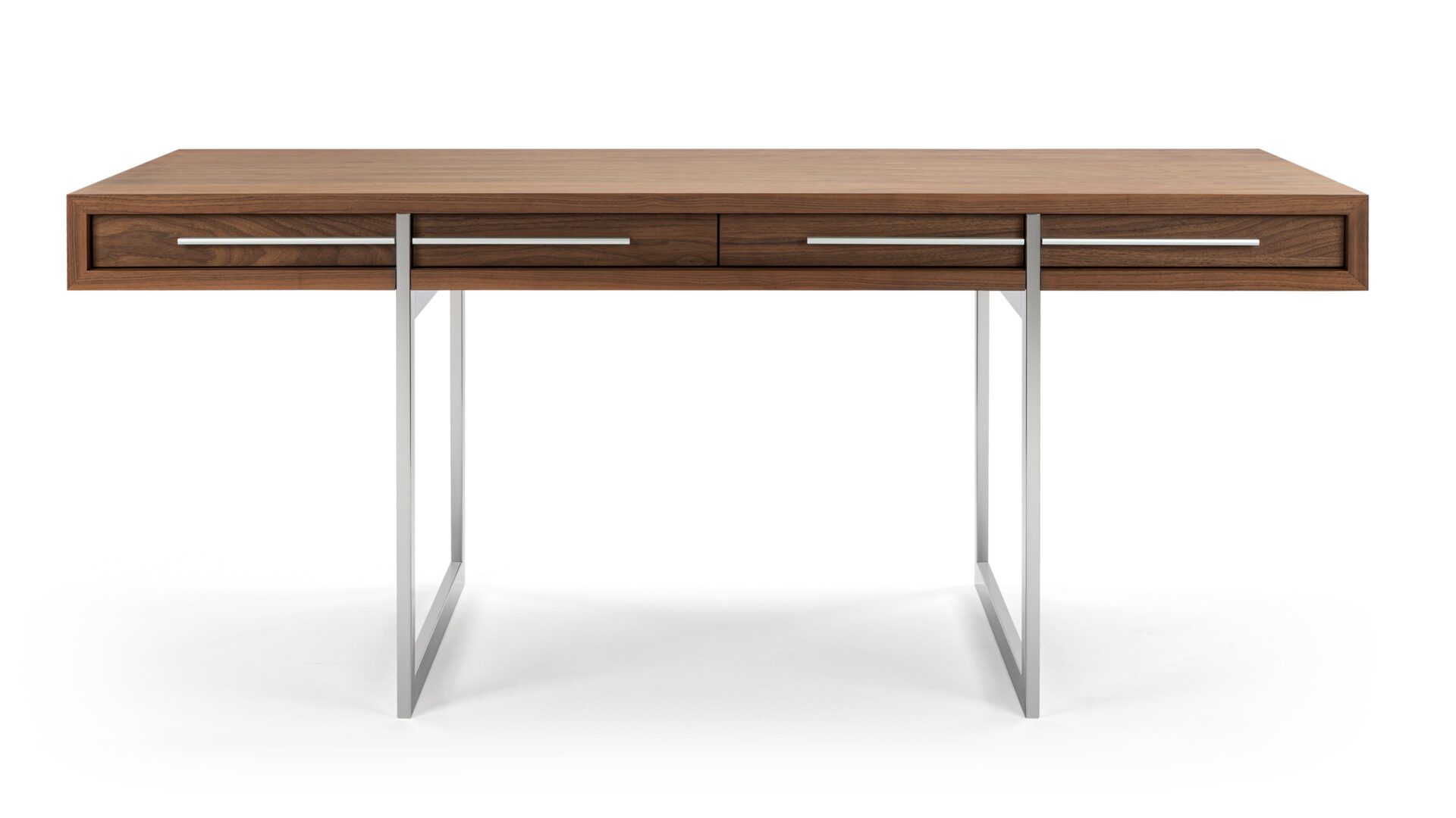 Enhance your workspace with the Naver Desk showcasing a stunning natural walnut veneer and sleek stainless steel legs seamlessly blended into its design. The airy and open base of this desk not only adds a modern touch but also contributes to its light and refreshing appeal.
