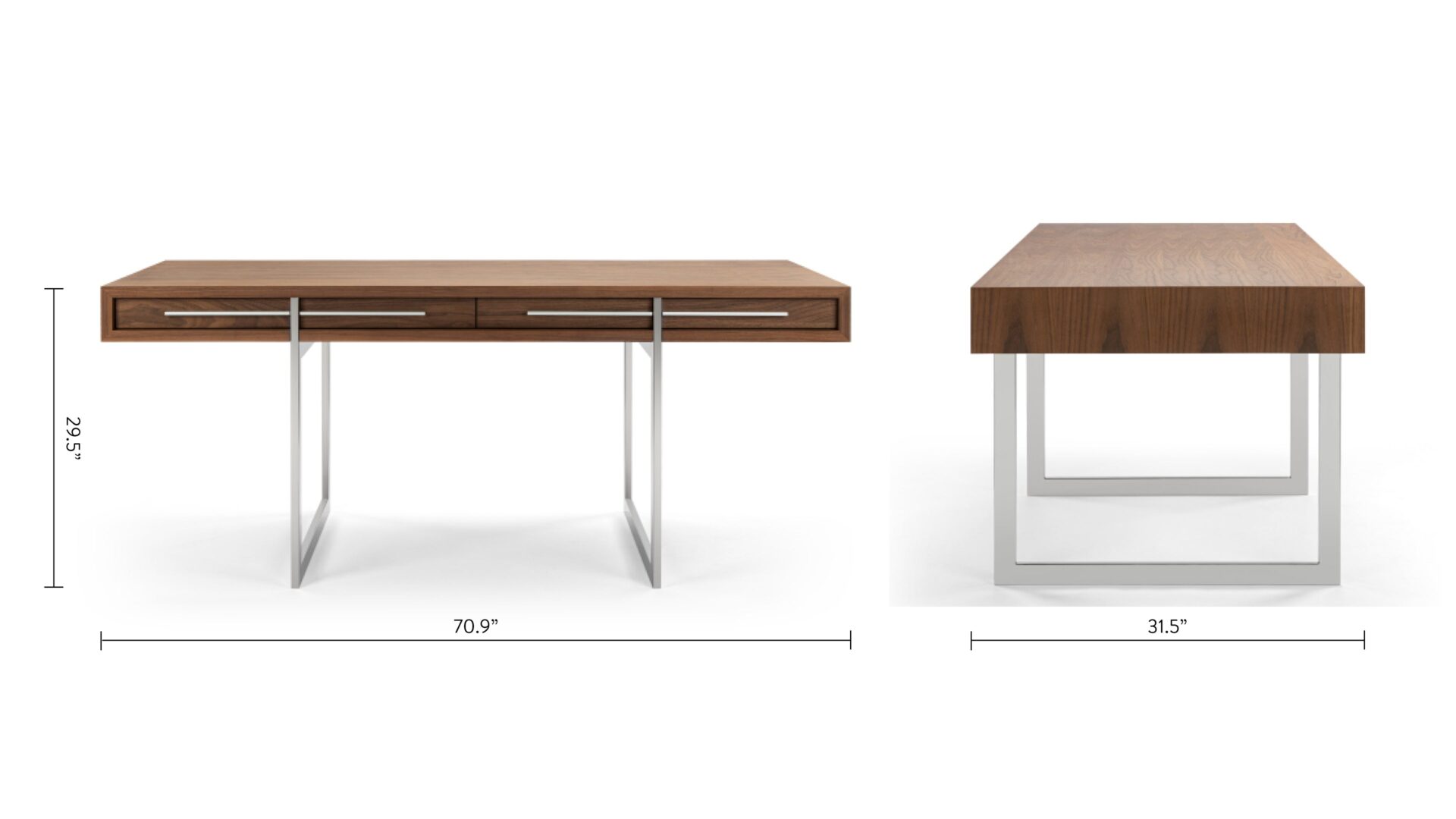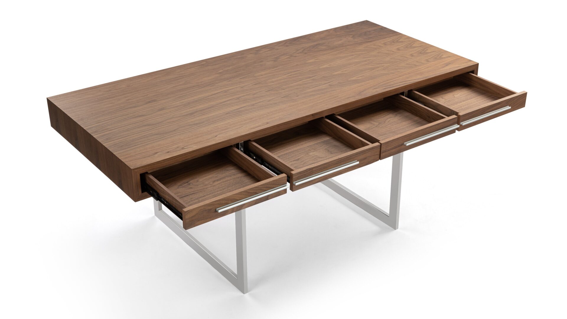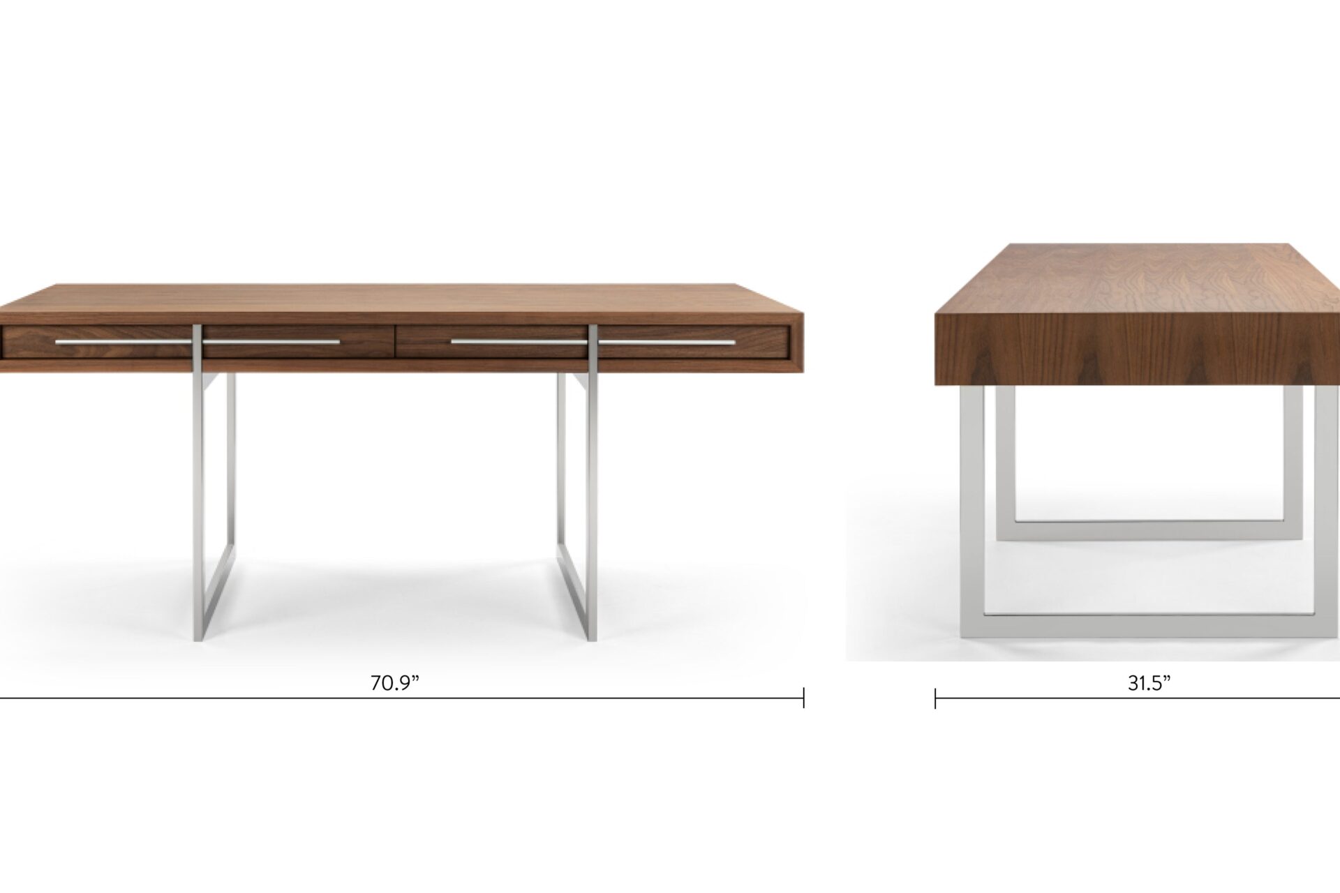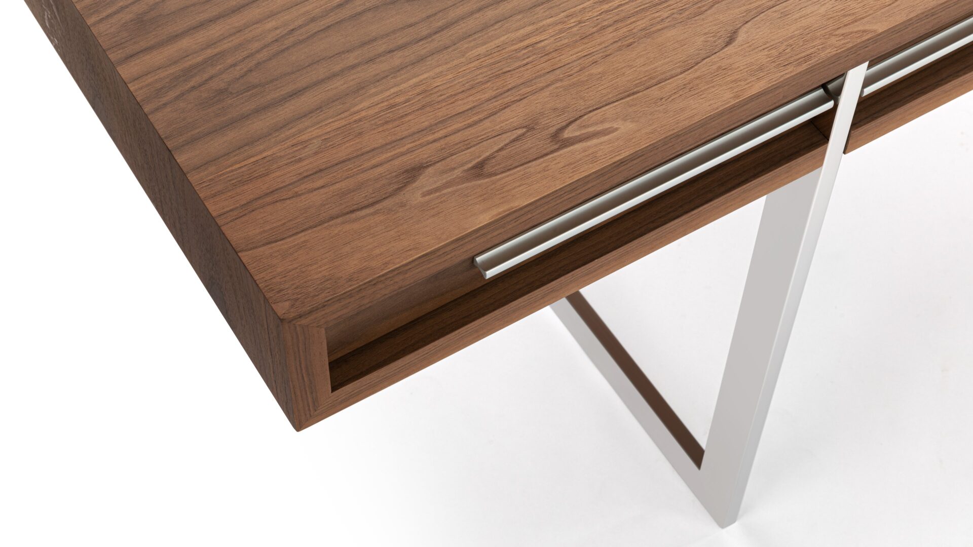 Enhance your workspace with the Naver Desk showcasing a stunning natural walnut veneer and sleek stainless steel legs seamlessly blended into its design. The airy and open base of this desk not only adds a modern touch but also contributes to its light and refreshing appeal.