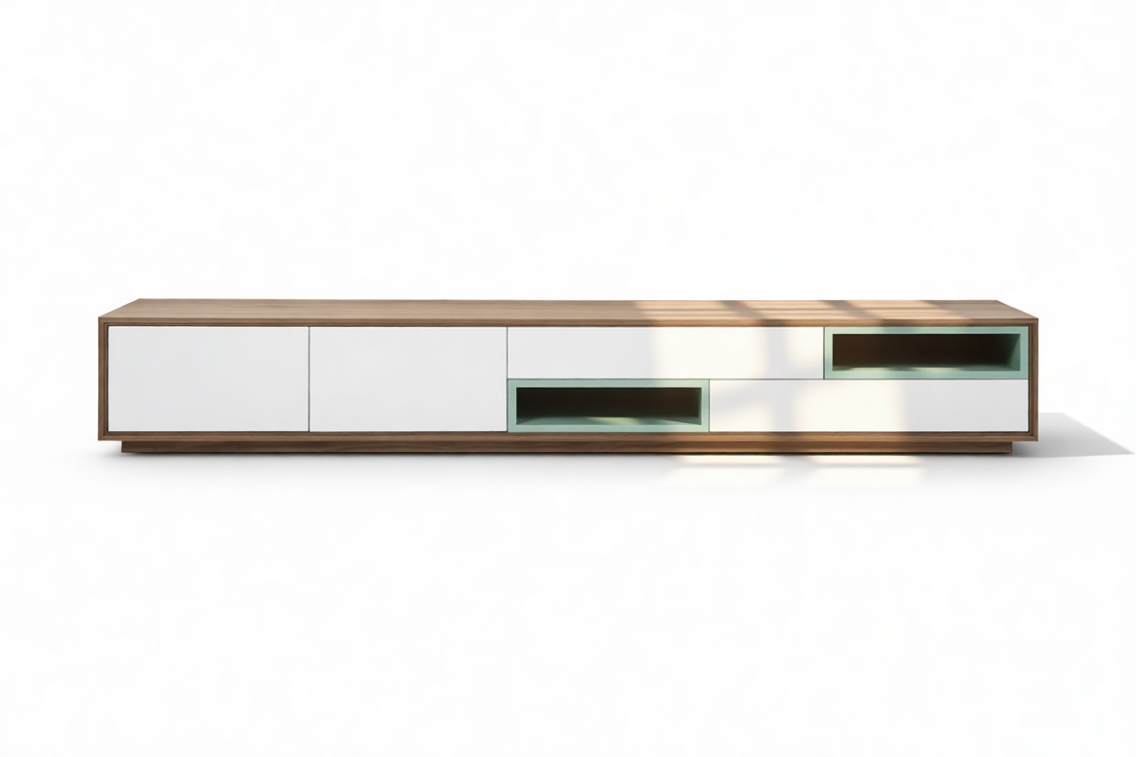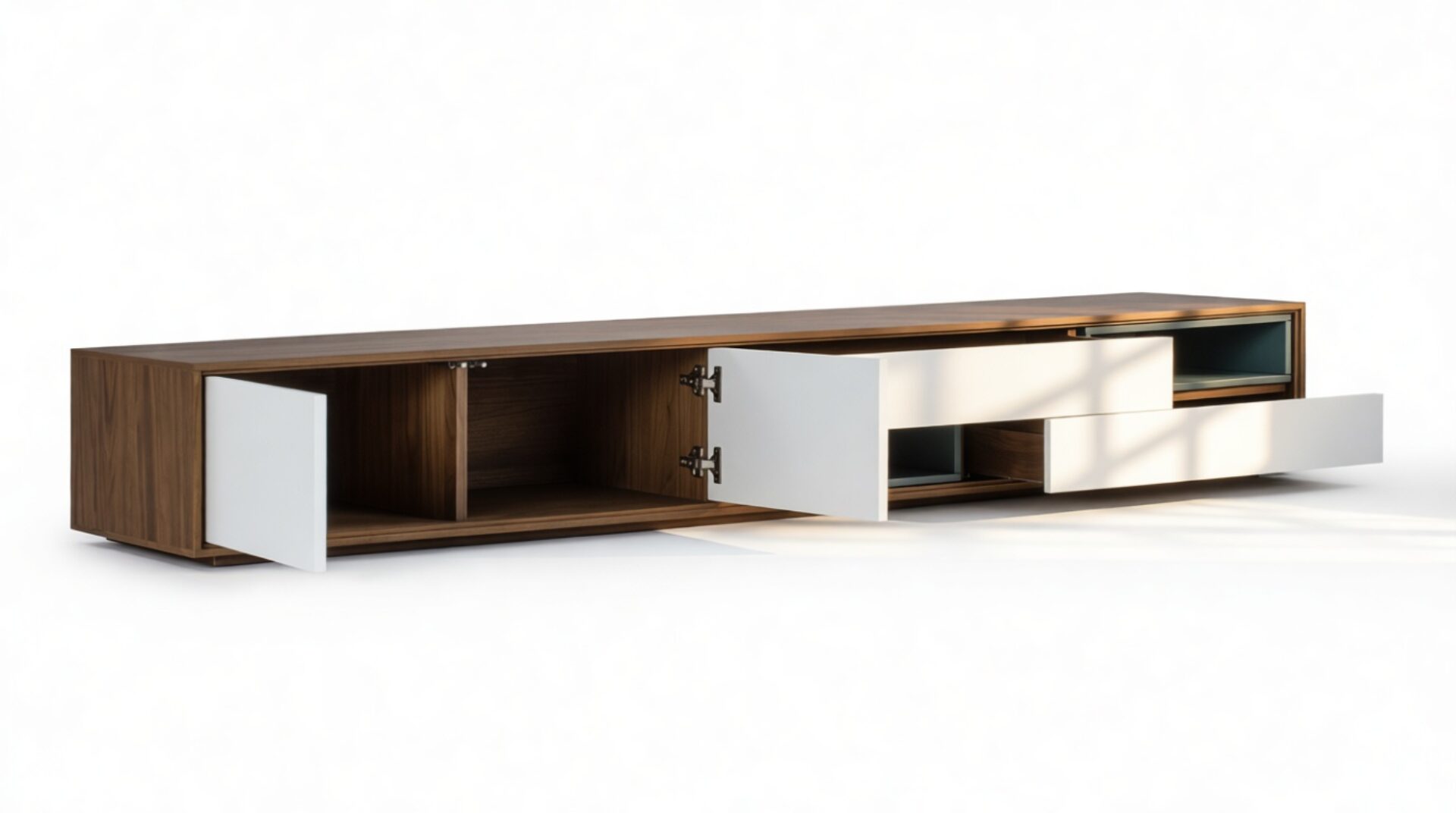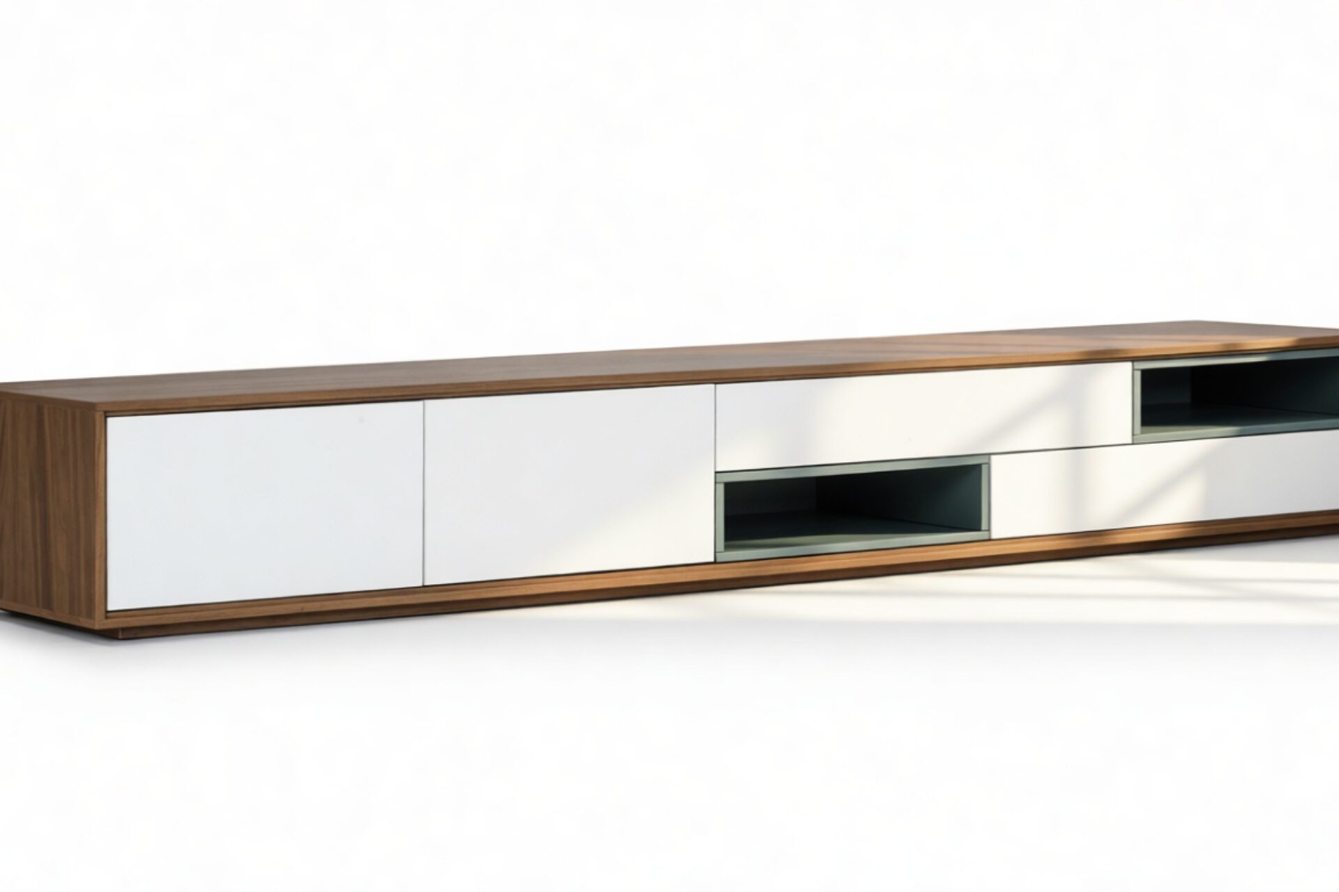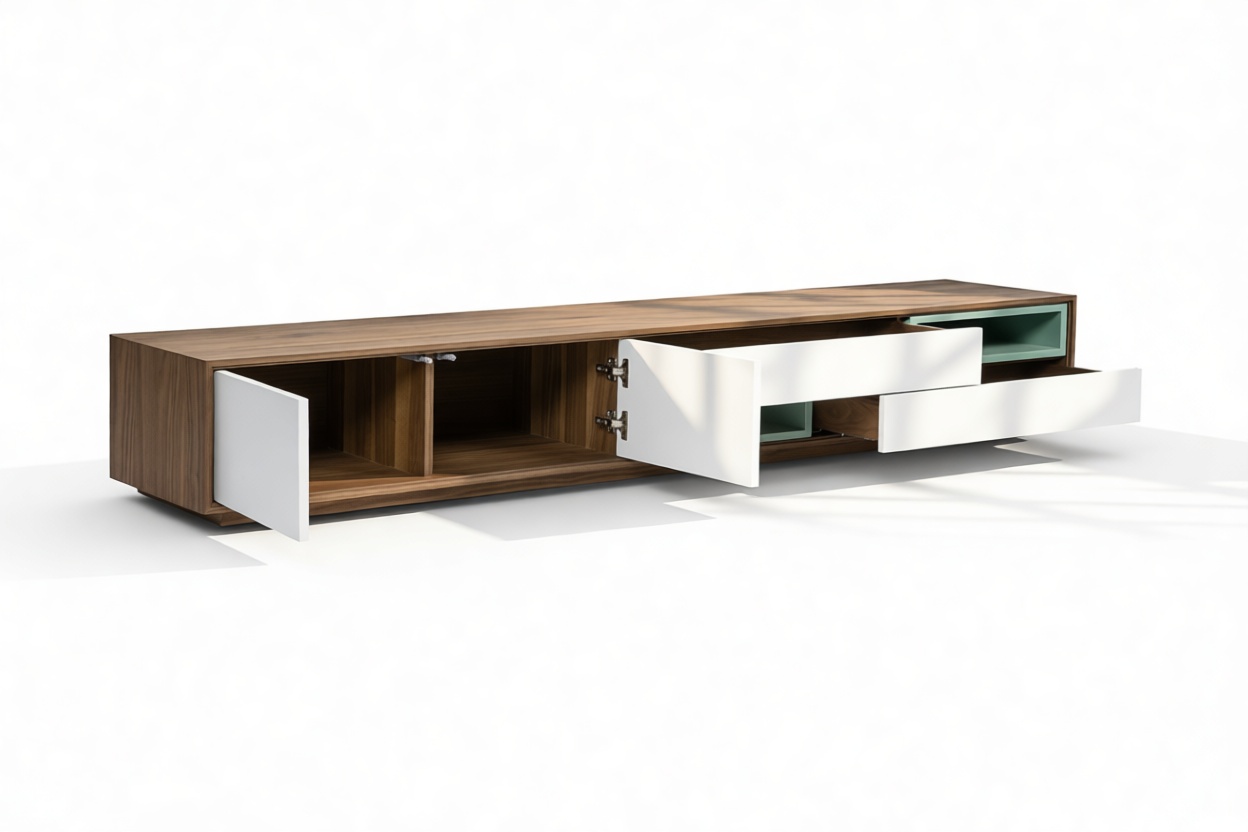 Introducing a console featuring enclosed cabinets, smooth drawers, and open shelving, designed to assist in organizing, displaying, and supporting electronic devices while ensuring proper ventilation.