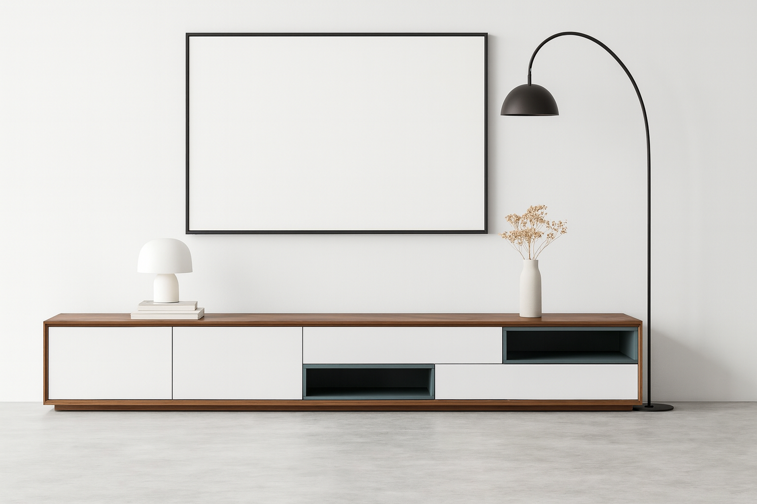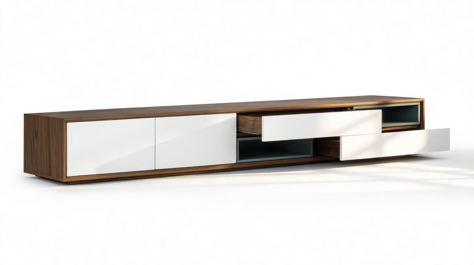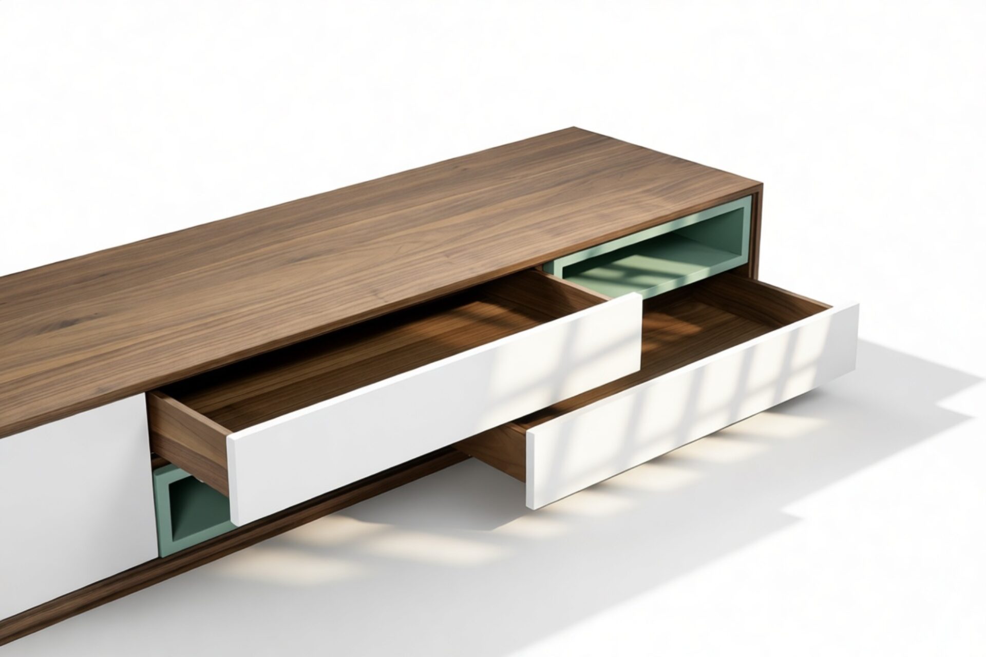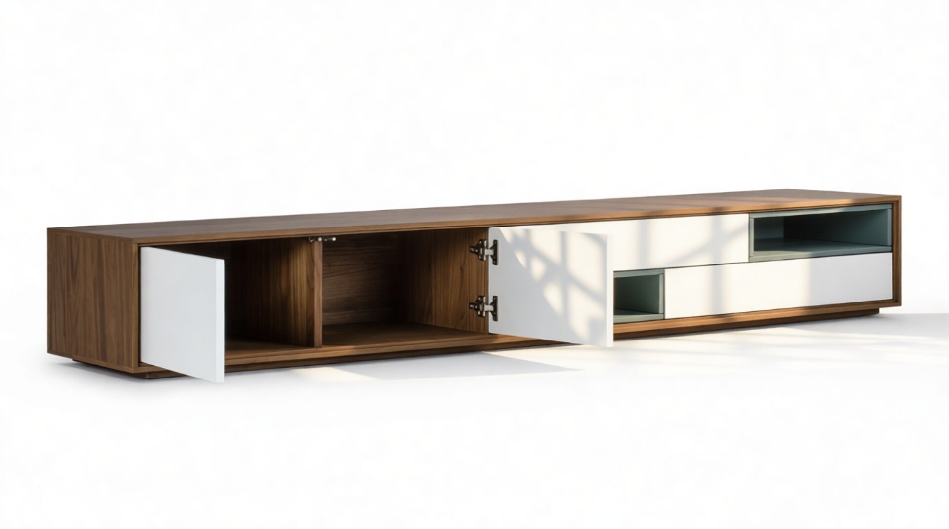 Introducing a console featuring enclosed cabinets, smooth drawers, and open shelving, designed to assist in organizing, displaying, and supporting electronic devices while ensuring proper ventilation.