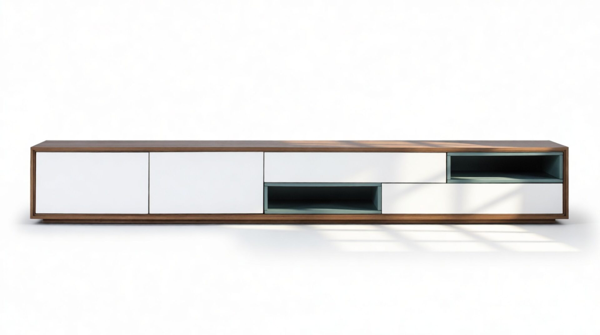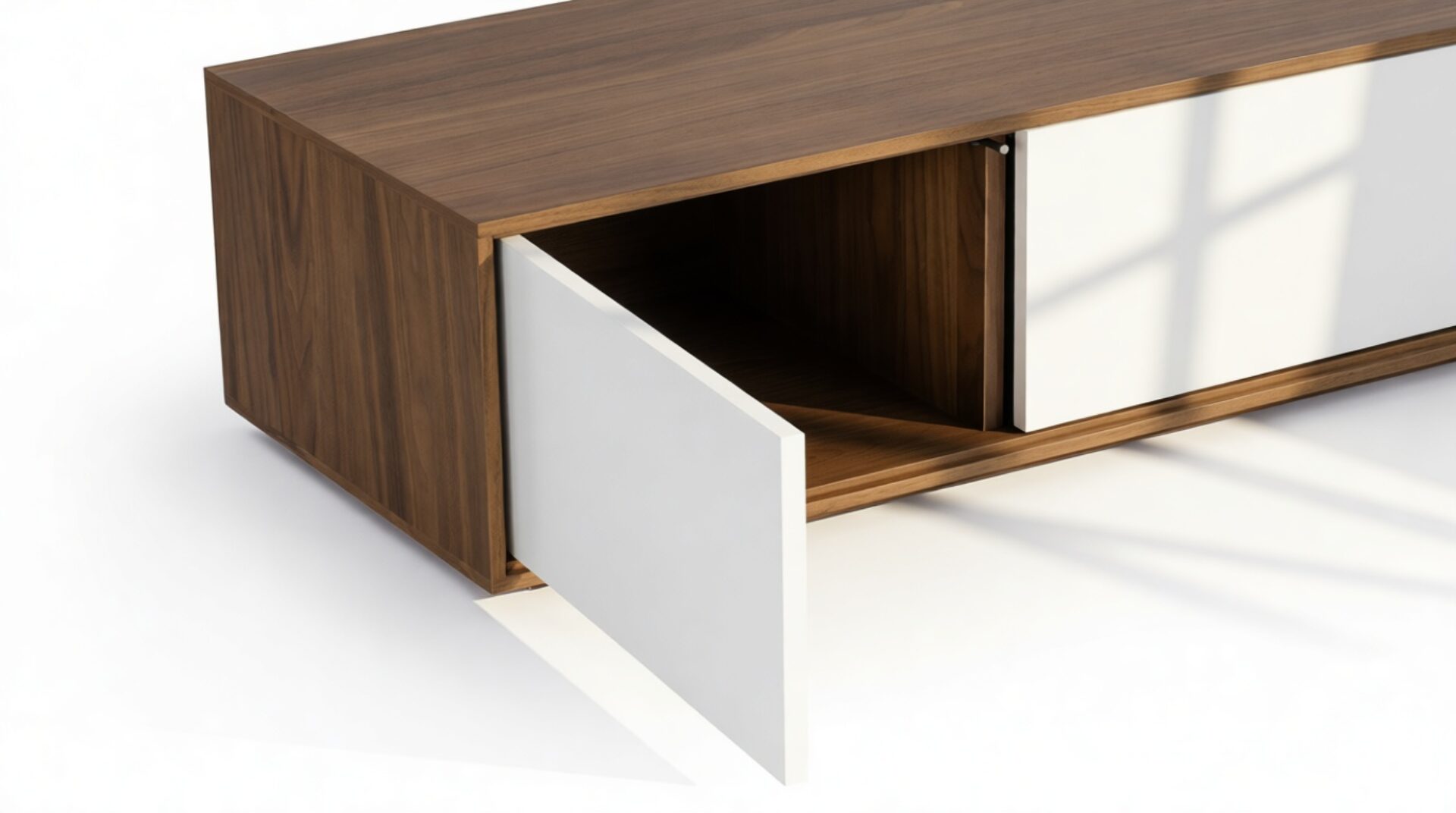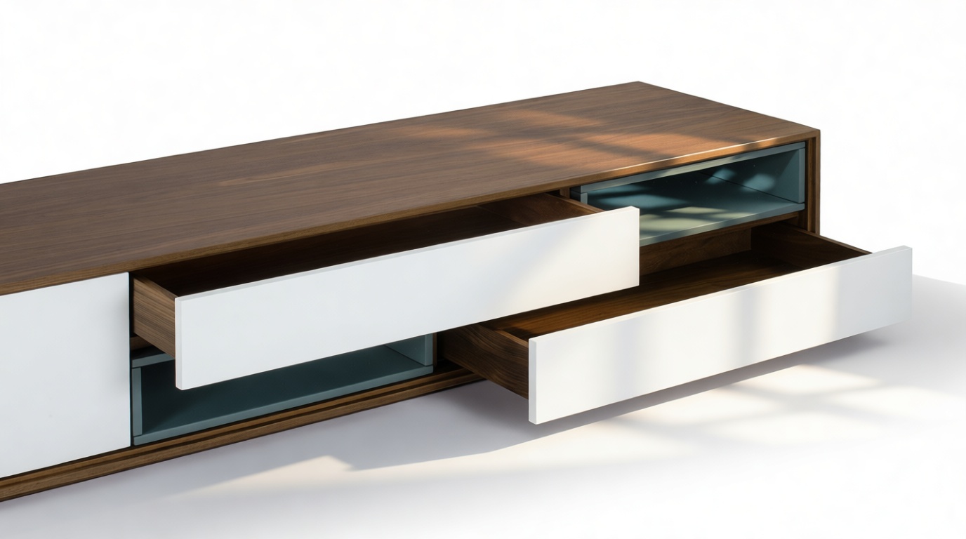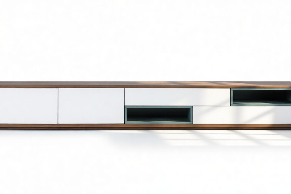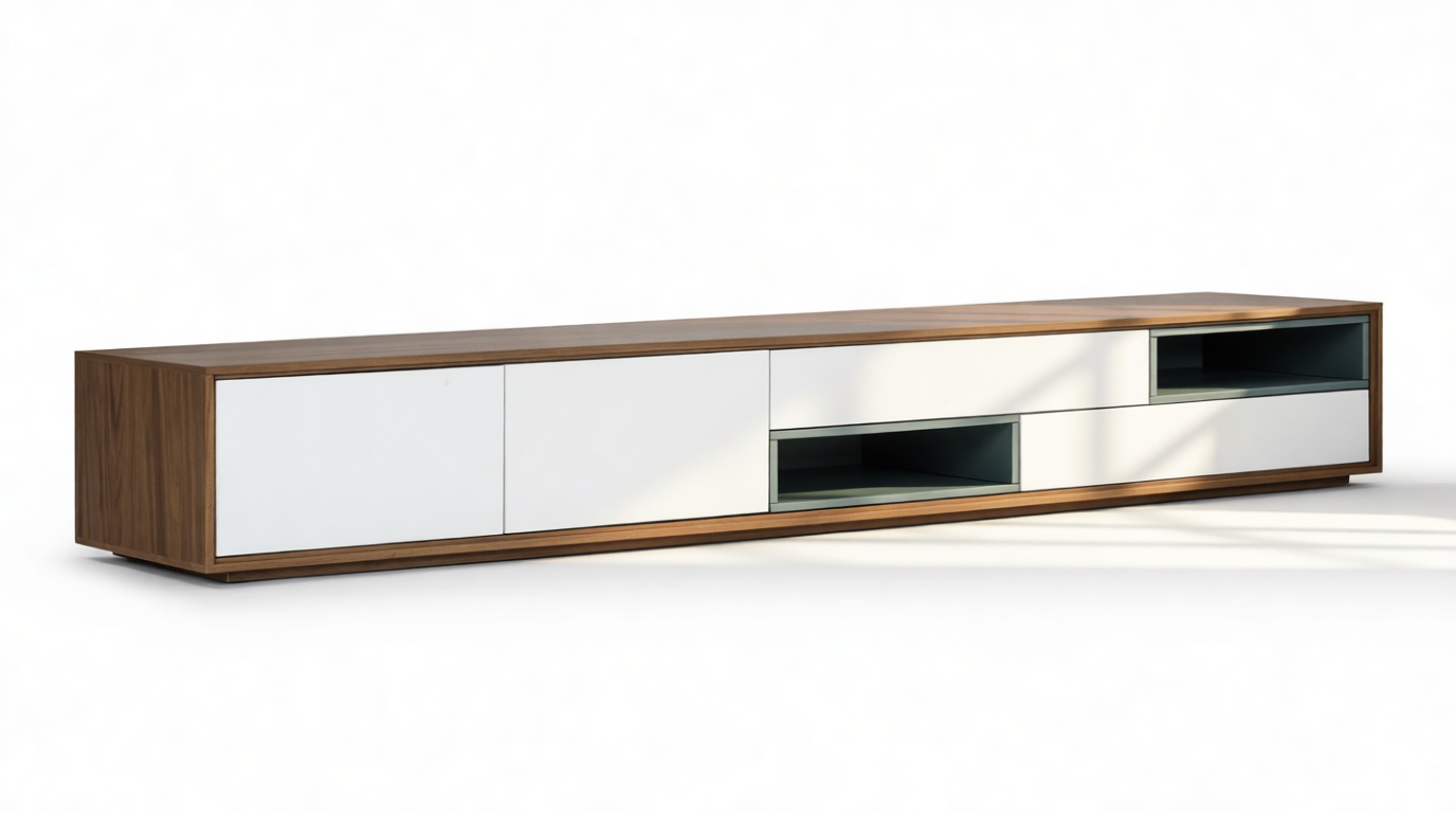 Introducing a console featuring enclosed cabinets, smooth drawers, and open shelving, designed to assist in organizing, displaying, and supporting electronic devices while ensuring proper ventilation.