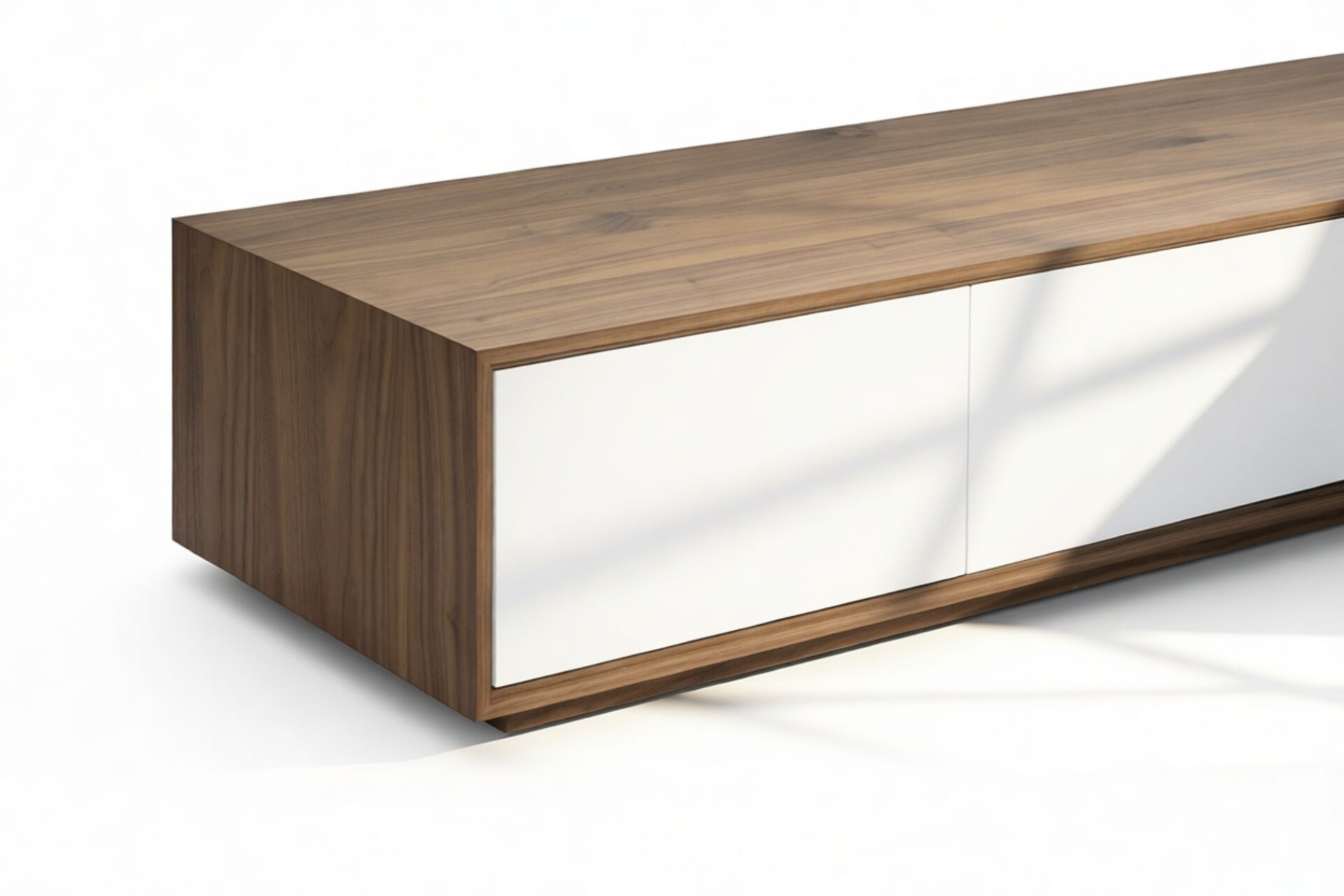 Elevate your modern interiors with the sleek Nederland Media Console. Crafted with a walnut veneer finish and white panels, this piece offers versatile storage solutions with hinged cabinets, sliding drawers, and open shelving. Its low profile design makes it perfect as a TV stand or entertainment center, blending style and functionality seamlessly.