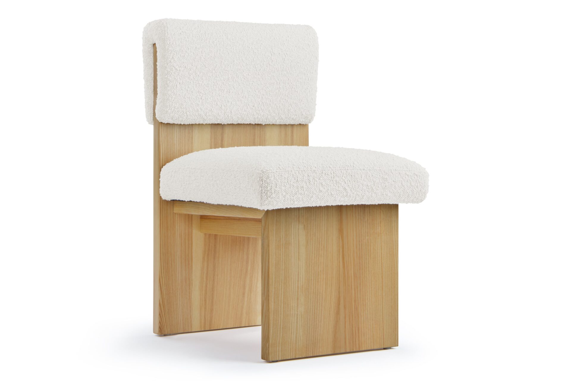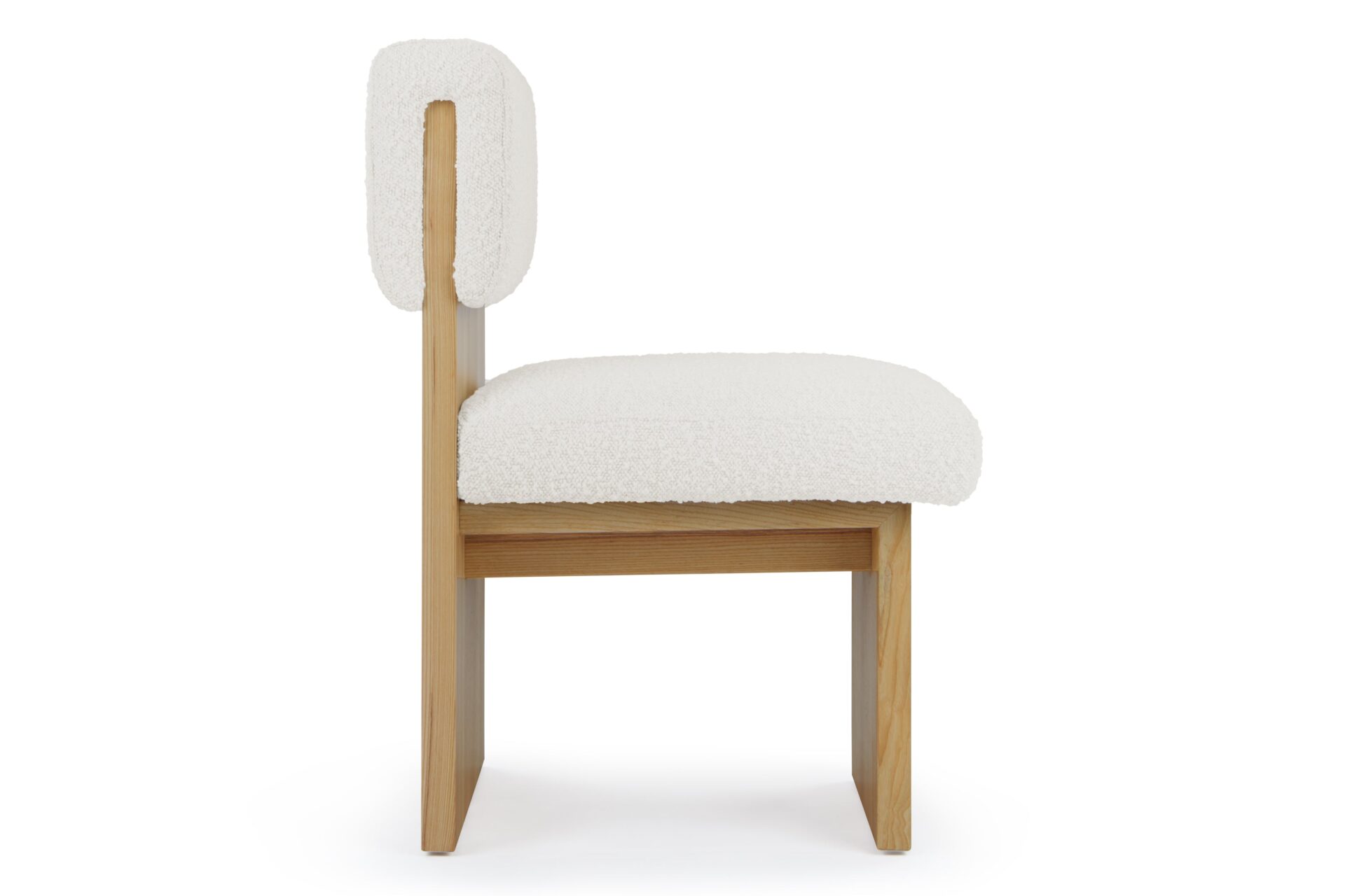 Discover the allure and comfort of the Nina Dining Chair, a superb addition to your dining ensemble. With its inviting warm white boucle upholstery, this chair delivers a soft and tactile seating experience. Enhanced with foam padding in the seat and backrest, it ensures lasting comfort during extended meals or gatherings. Crafted with a sturdy solid wood frame, its sophisticated design is accentuated by the elegantly folded backrest over the frame.