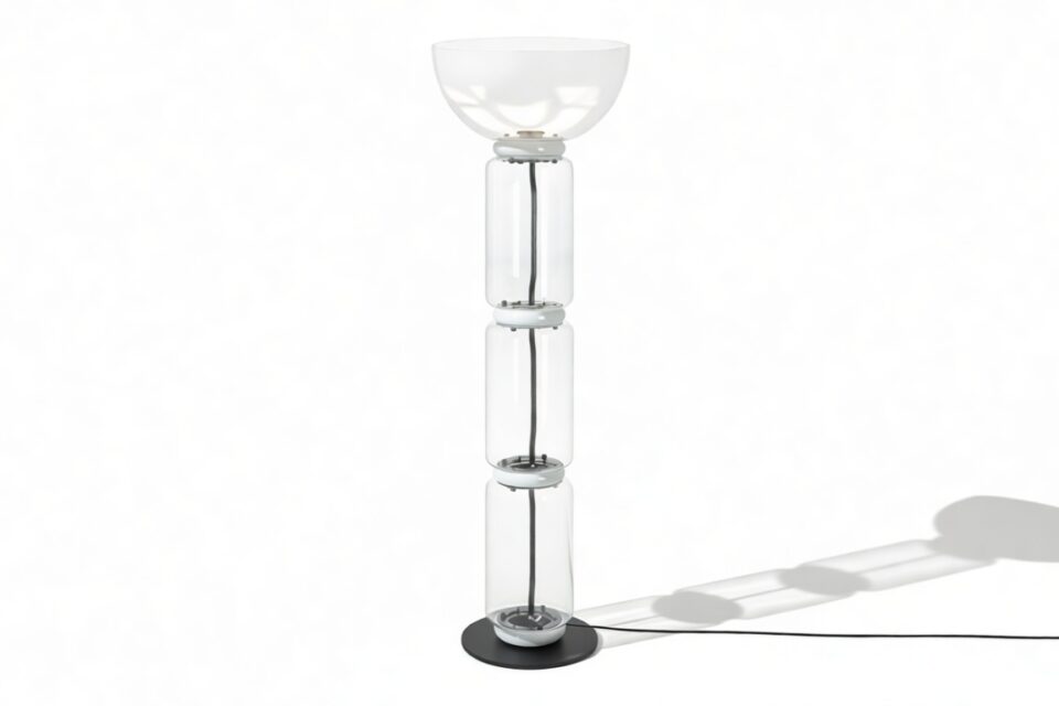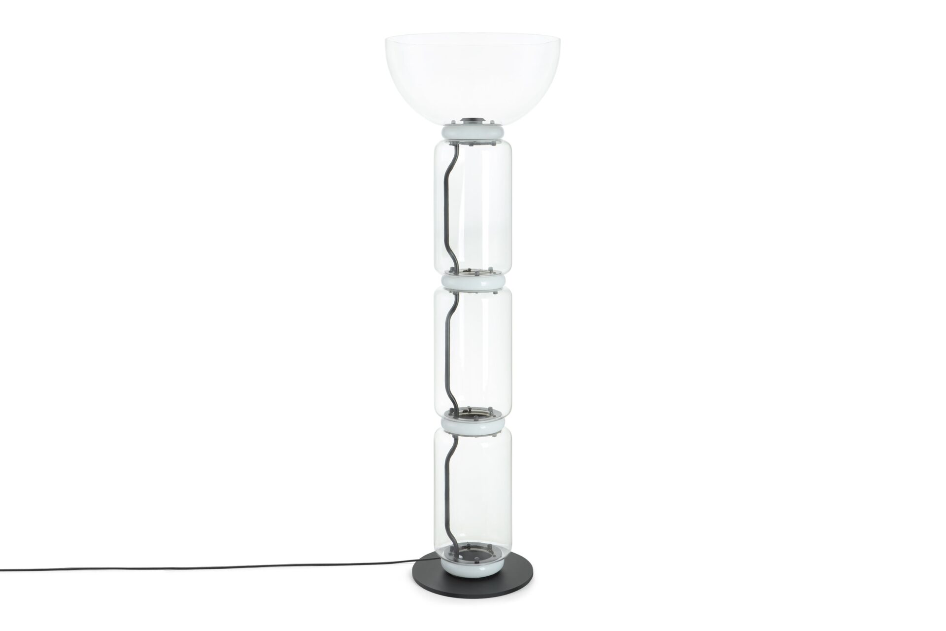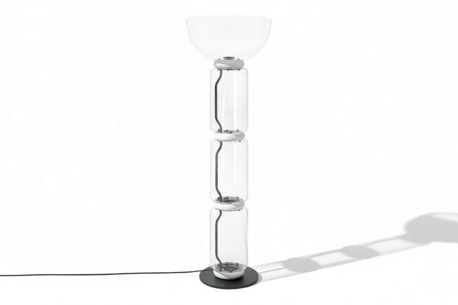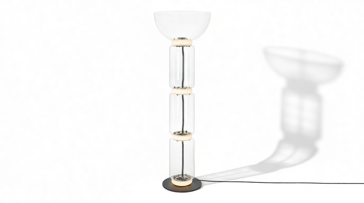 Fashioned predominantly from gracefully stacked glass tubes, the Noctambule Floor Lamp features inconspicuous LED rings and internal wiring cleverly concealed within a sculpted central frame. The exposed glass bowl crowning the design infuses a handcrafted charm.