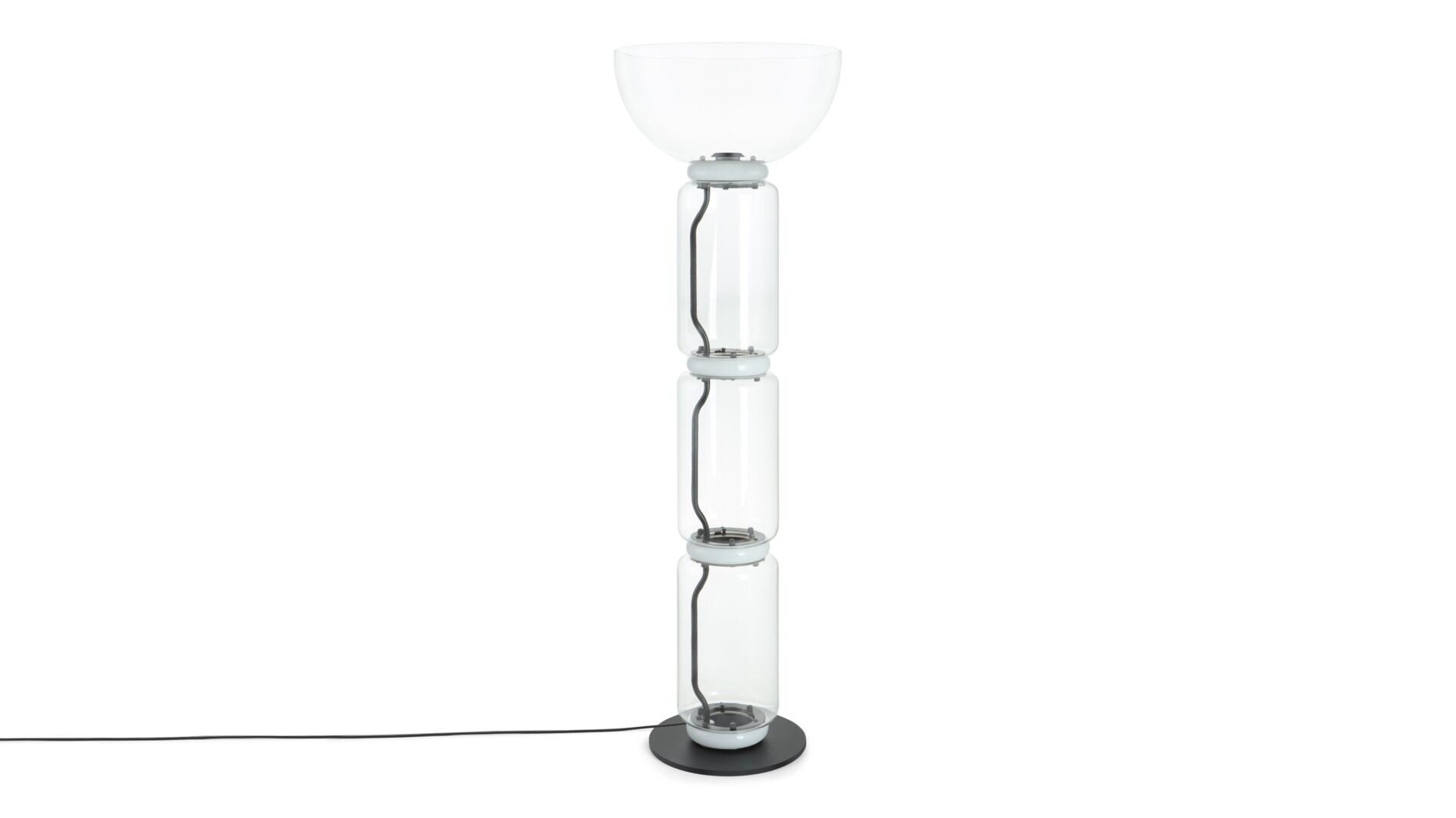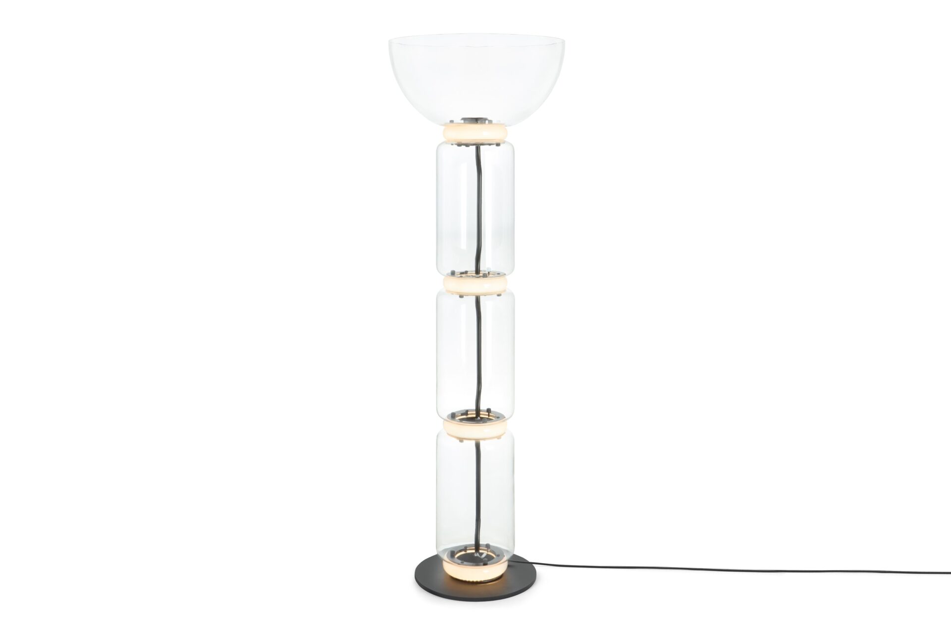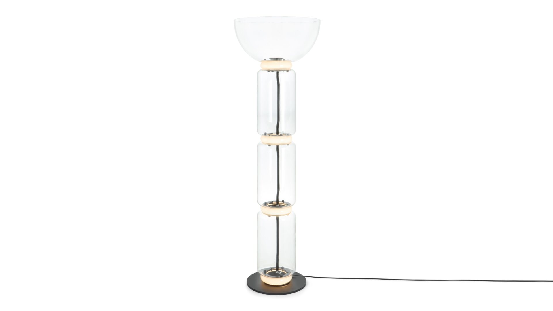 Experience the captivating allure of the Noctambule Floor Lamp, characterized by gracefully stacked glass tubes and discreet LED rings that softly illuminate each tube, creating a subtle yet impactful ambiance. This tall floor lamp, with its modern silhouette and open glass bowl top, exudes refinement and sophistication, making it a practical and attention-grabbing addition to elevate any modern interior.