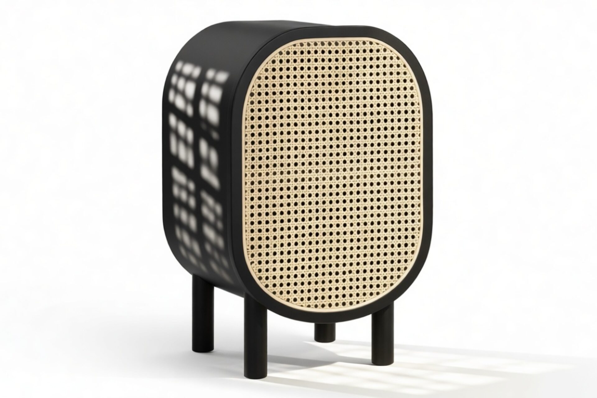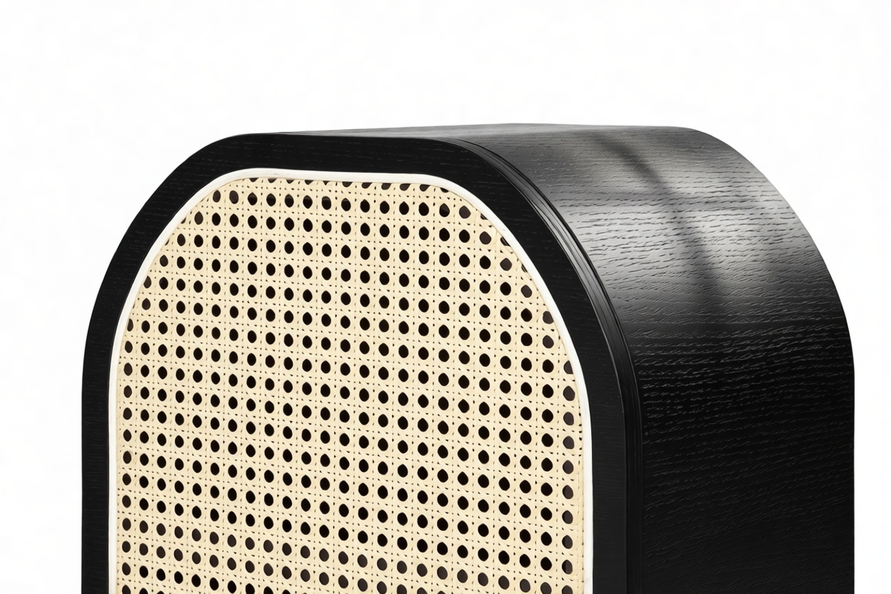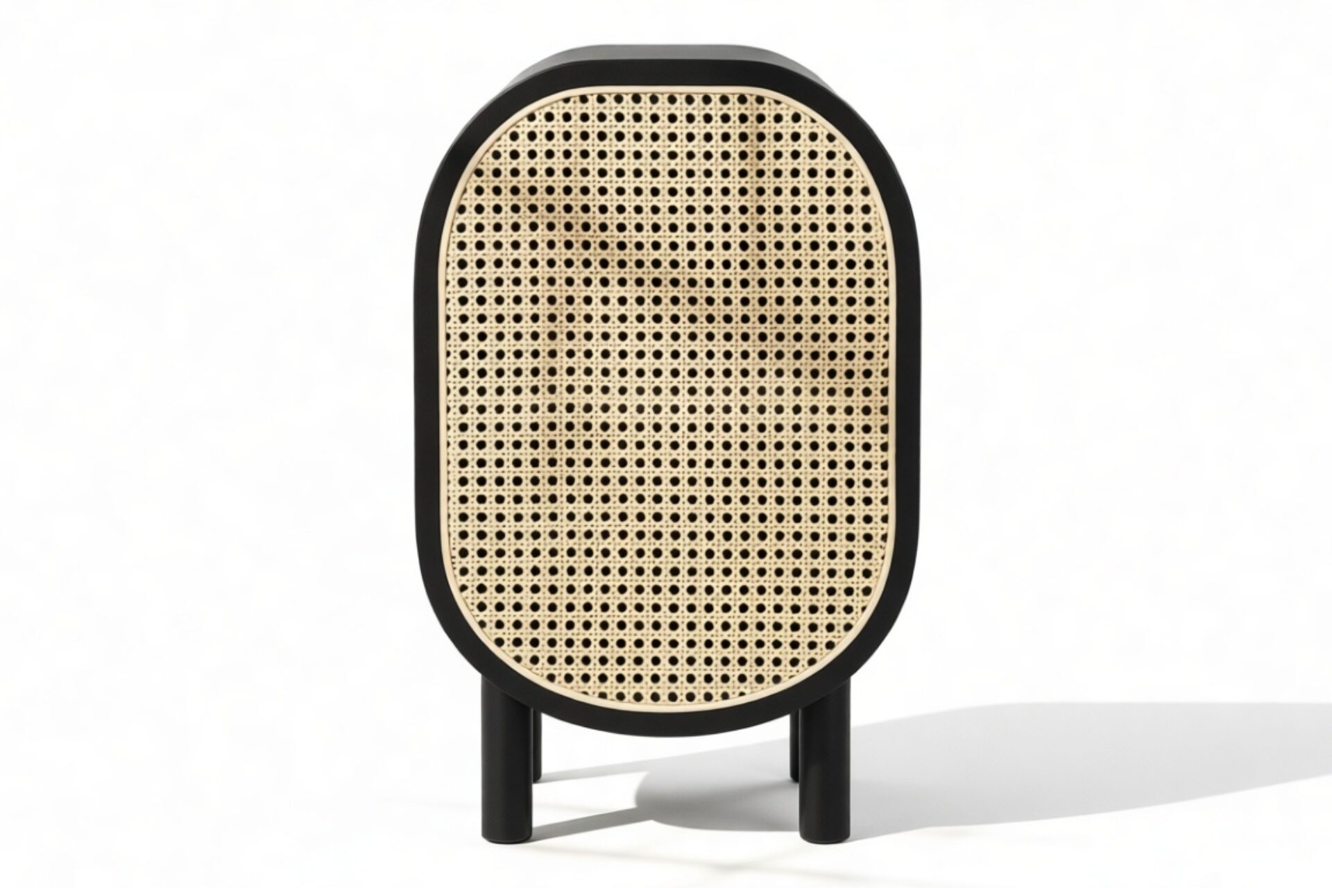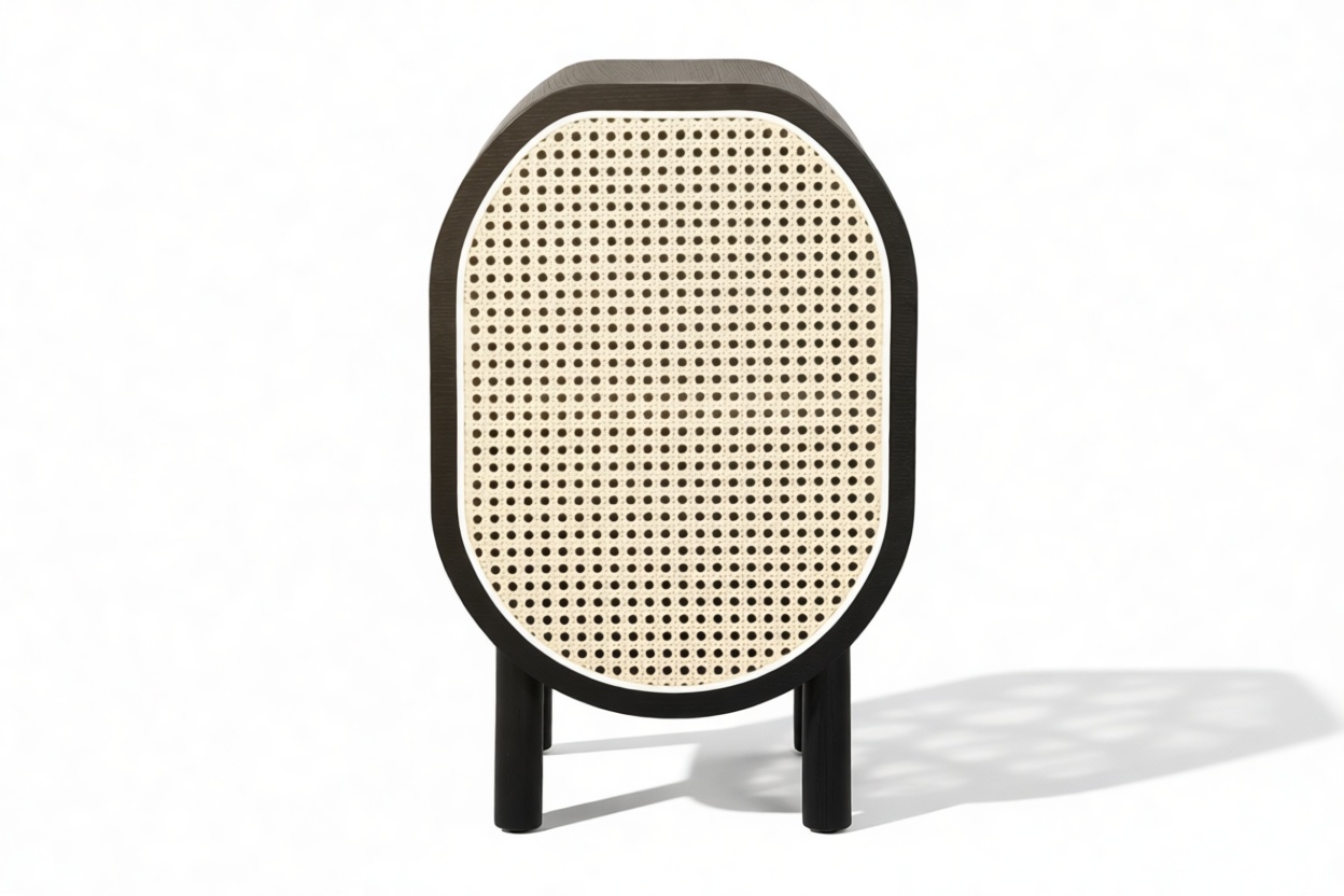 Discover the Nonna Side Table showcasing a modern design that effortlessly combines natural elements like rattan with a sleek matte black ash frame. The warm wood tones harmoniously complement the dark frame and brass accents within. The table's incorporation of natural rattan evokes memories of post-war French aesthetics, harmonized with a contemporary rounded silhouette.