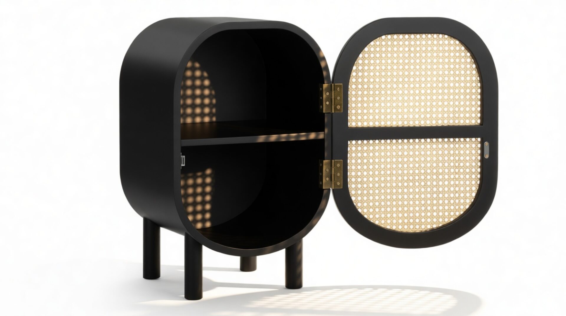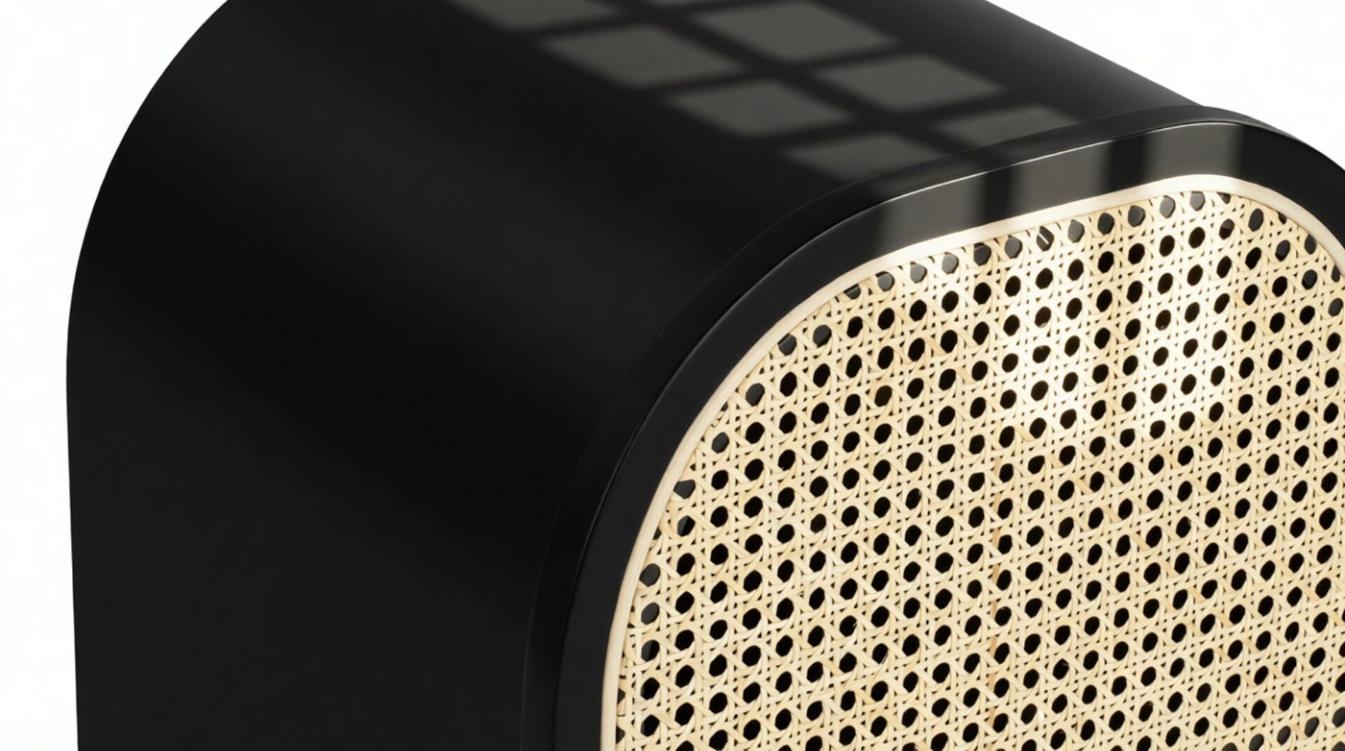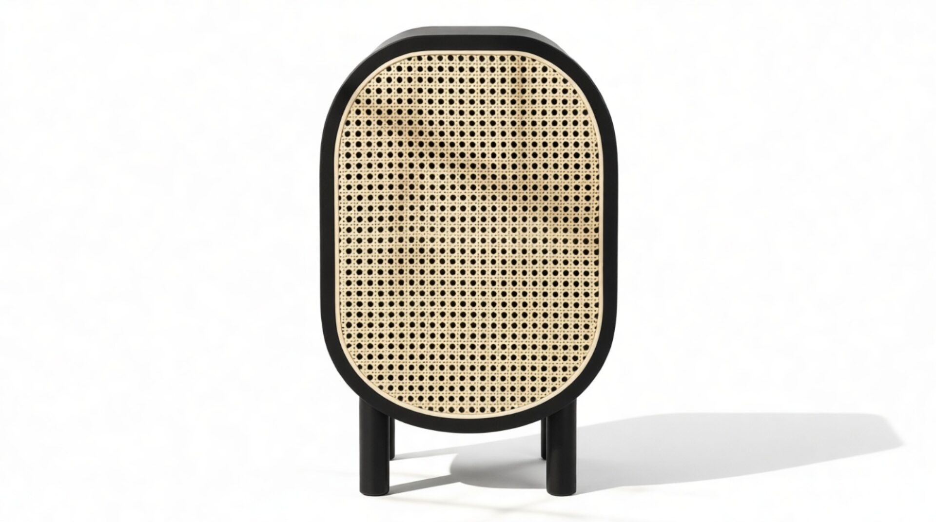 Discover the Nonna Side Table showcasing a modern design that effortlessly combines natural elements like rattan with a sleek matte black ash frame. The warm wood tones harmoniously complement the dark frame and brass accents within. The table's incorporation of natural rattan evokes memories of post-war French aesthetics, harmonized with a contemporary rounded silhouette.
