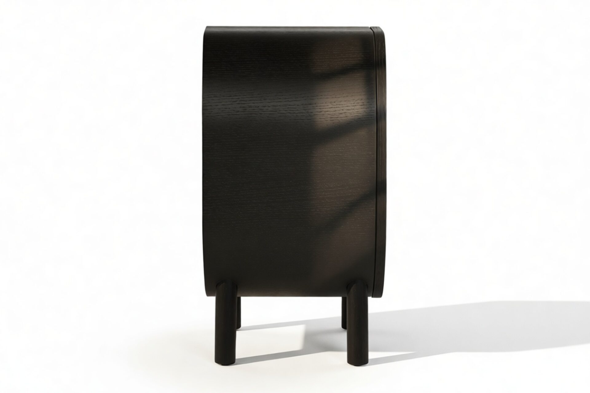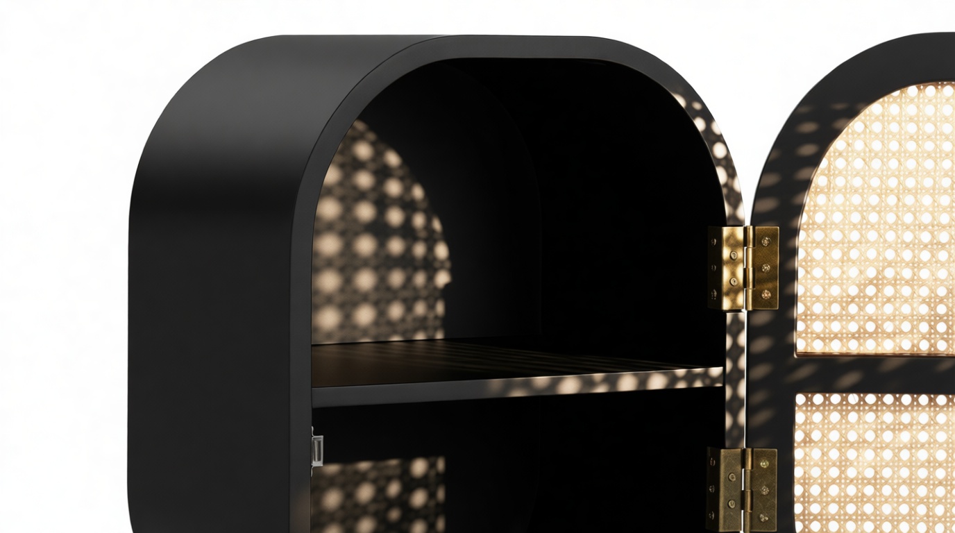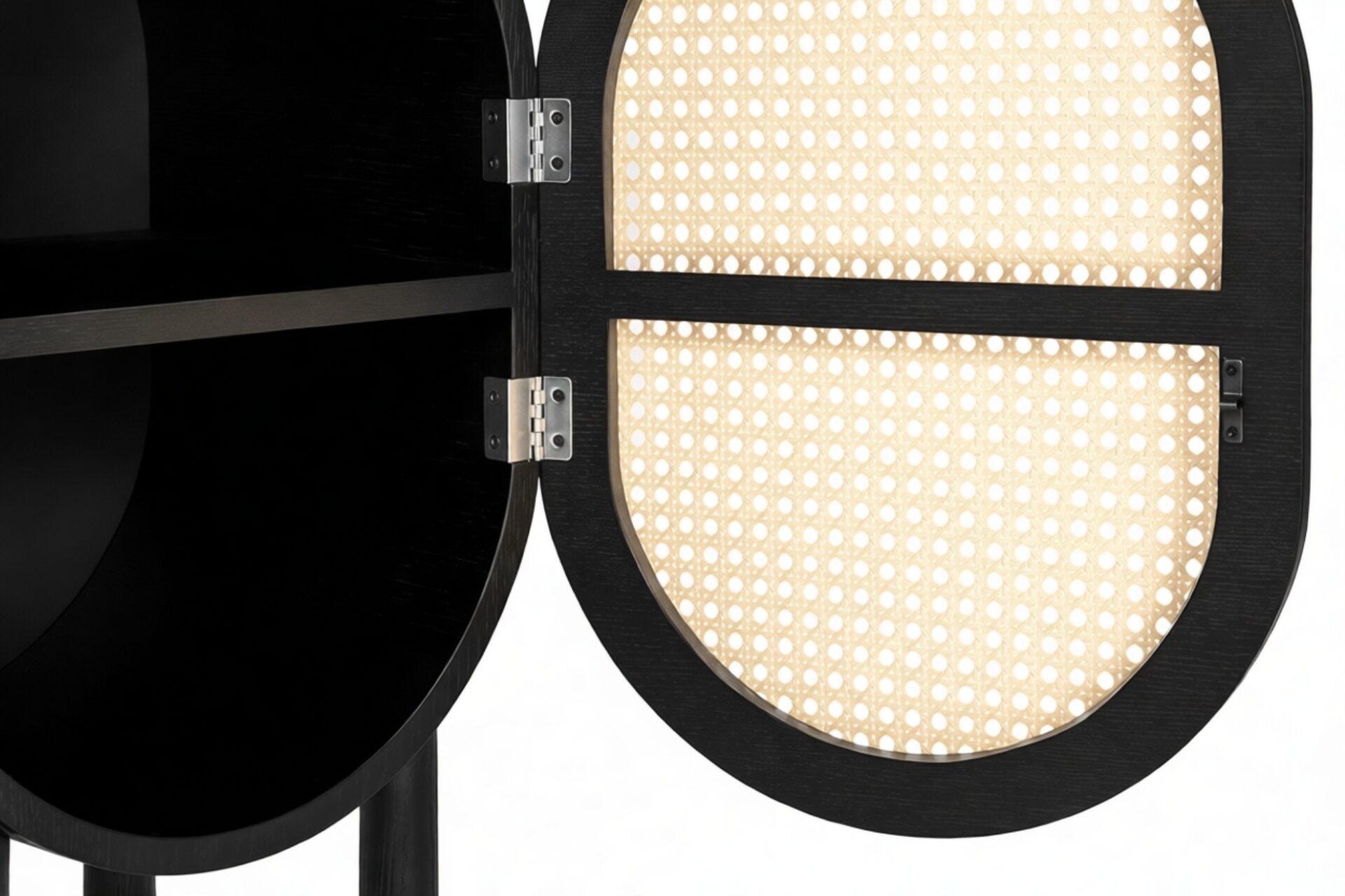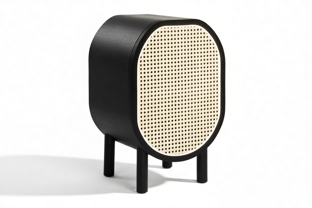 Discover the Nonna Side Table showcasing a modern design that effortlessly combines natural elements like rattan with a sleek matte black ash frame. The warm wood tones harmoniously complement the dark frame and brass accents within. The table's incorporation of natural rattan evokes memories of post-war French aesthetics, harmonized with a contemporary rounded silhouette.