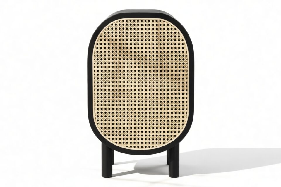 Experience the timeless allure of rattan in our collection of furniture pieces inspired by French post-war designs. Each piece features a contemporary rounded body, juxtaposing warm wood tones with a dark frame and brass detailing.