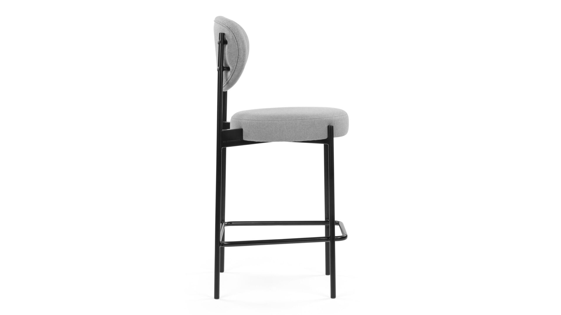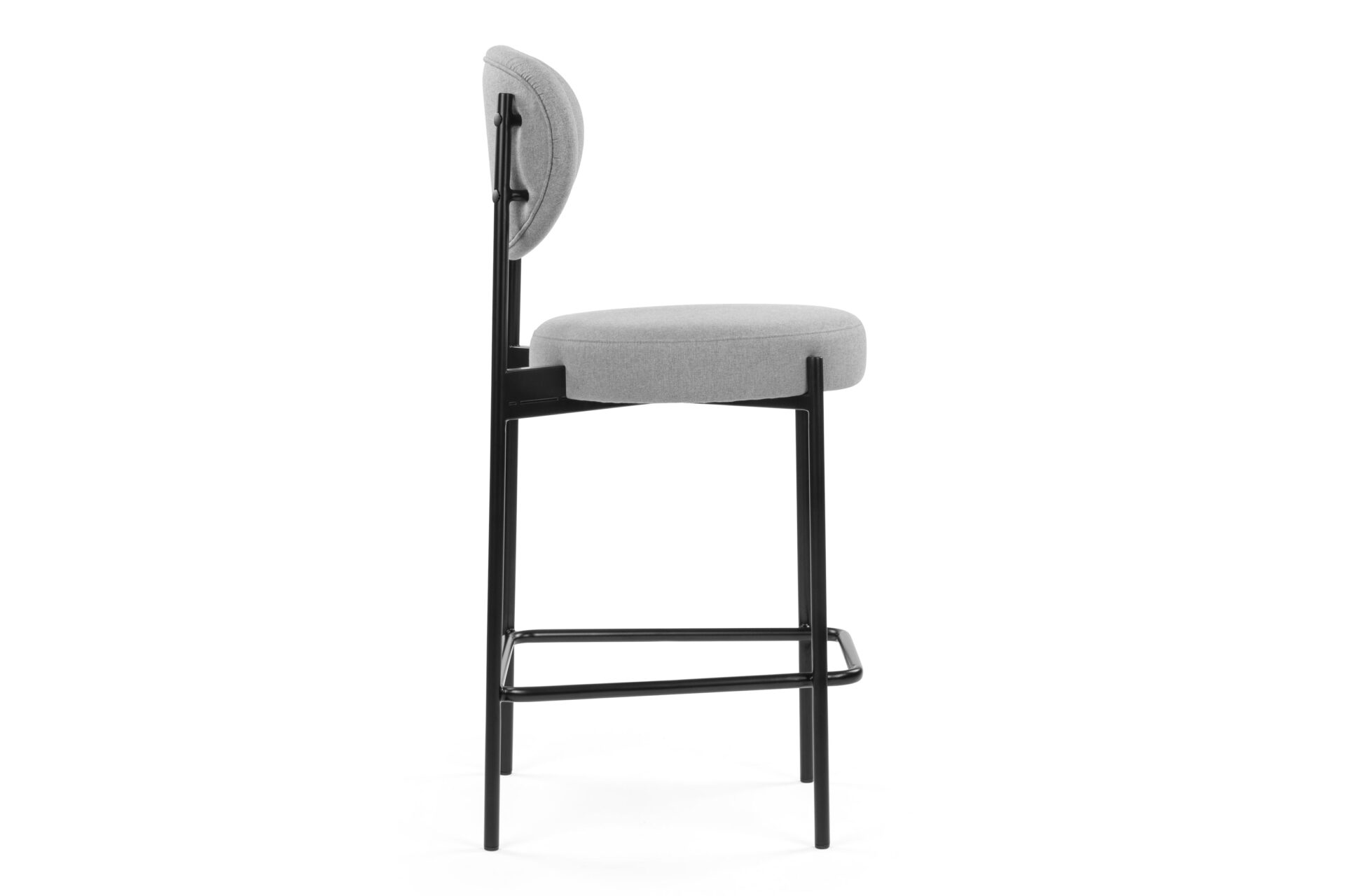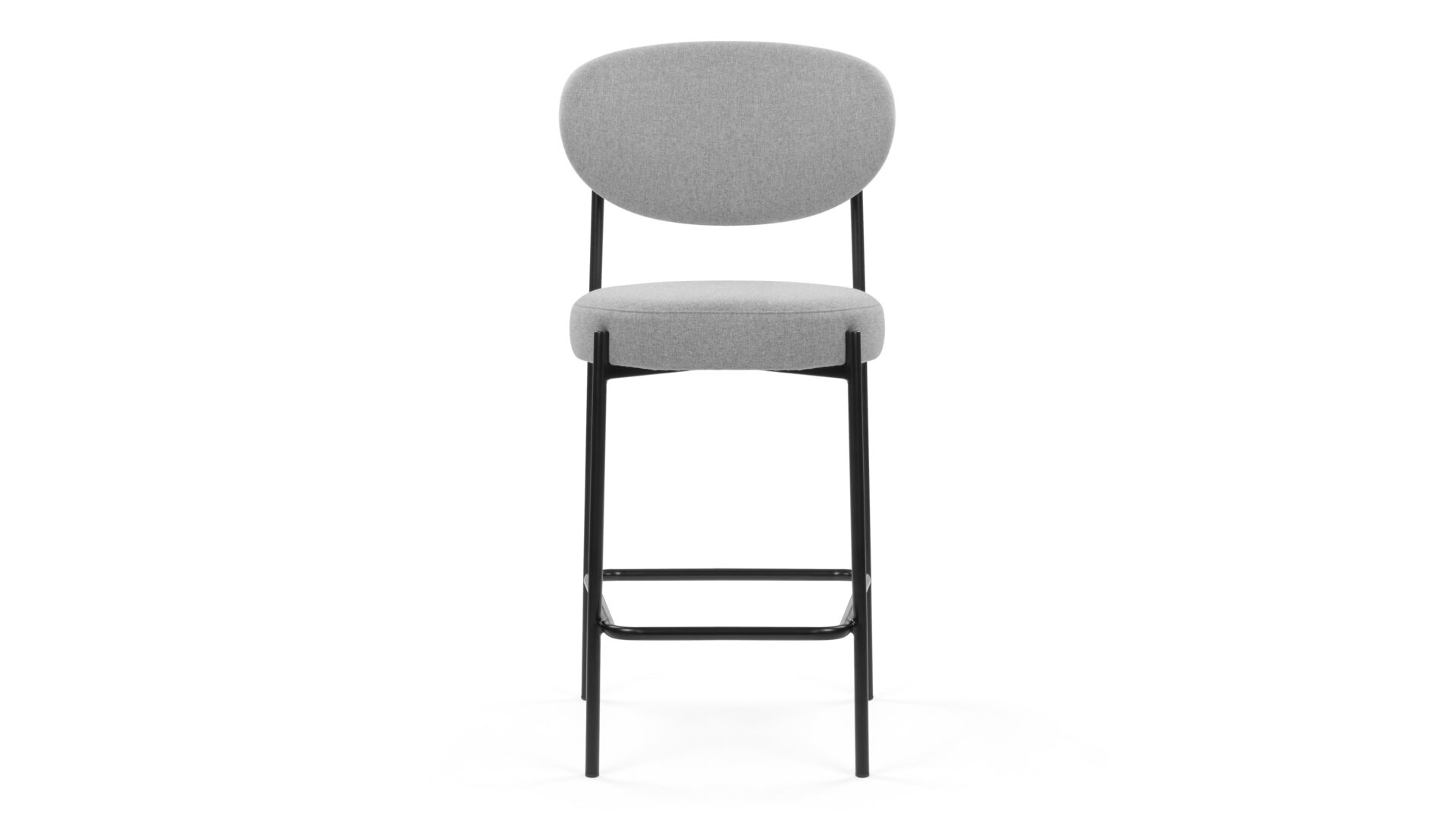 Enhance any modern kitchen or counter space with the Nyx Counter Stool, a sophisticated and practical furniture piece. It boasts high-density foam padding on the seat and oval-shaped backrest for optimal comfort. This stool is bolstered by a robust black metal frame and adorned with light grey fabric for a touch of refinement. The round seat, coupled with a footrest bar, not only increases comfort but also reinforces the stool's weight capacity, ensuring durability and dependability.