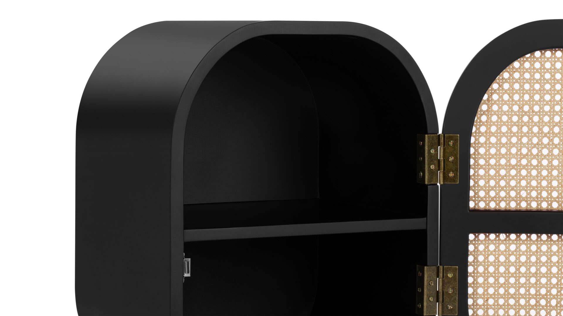 Discover the Oma Side Table showcasing a modern design that effortlessly combines natural elements like rattan with a sleek matte black ash frame. The warm wood tones harmoniously complement the dark frame and brass accents within. The table's incorporation of natural rattan evokes memories of post-war French aesthetics, harmonized with a contemporary rounded silhouette.