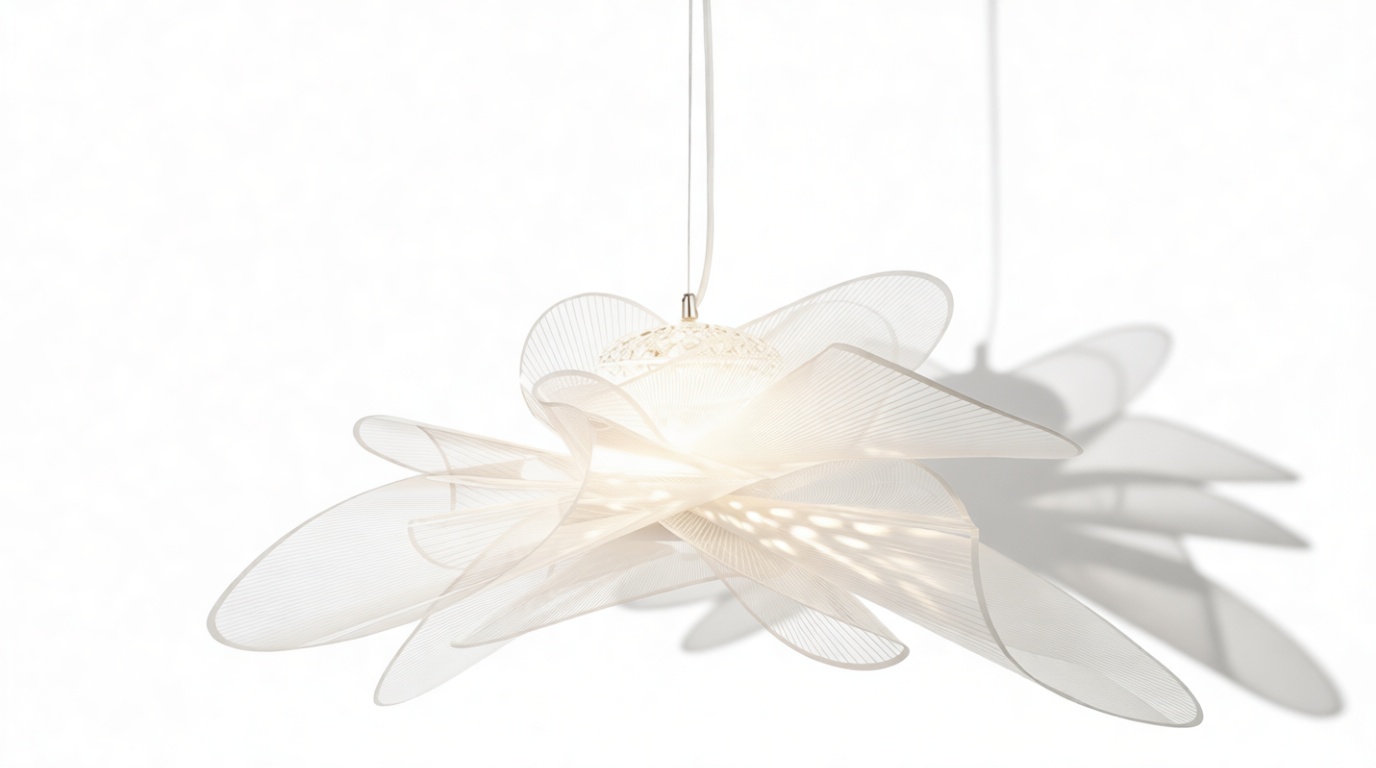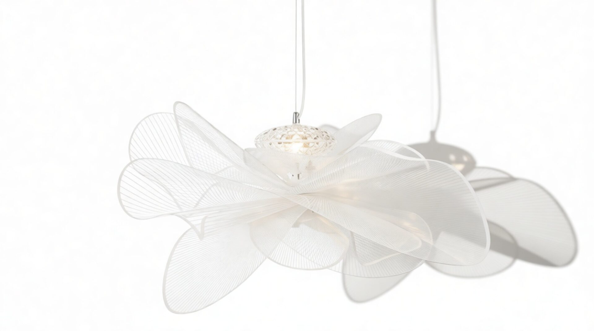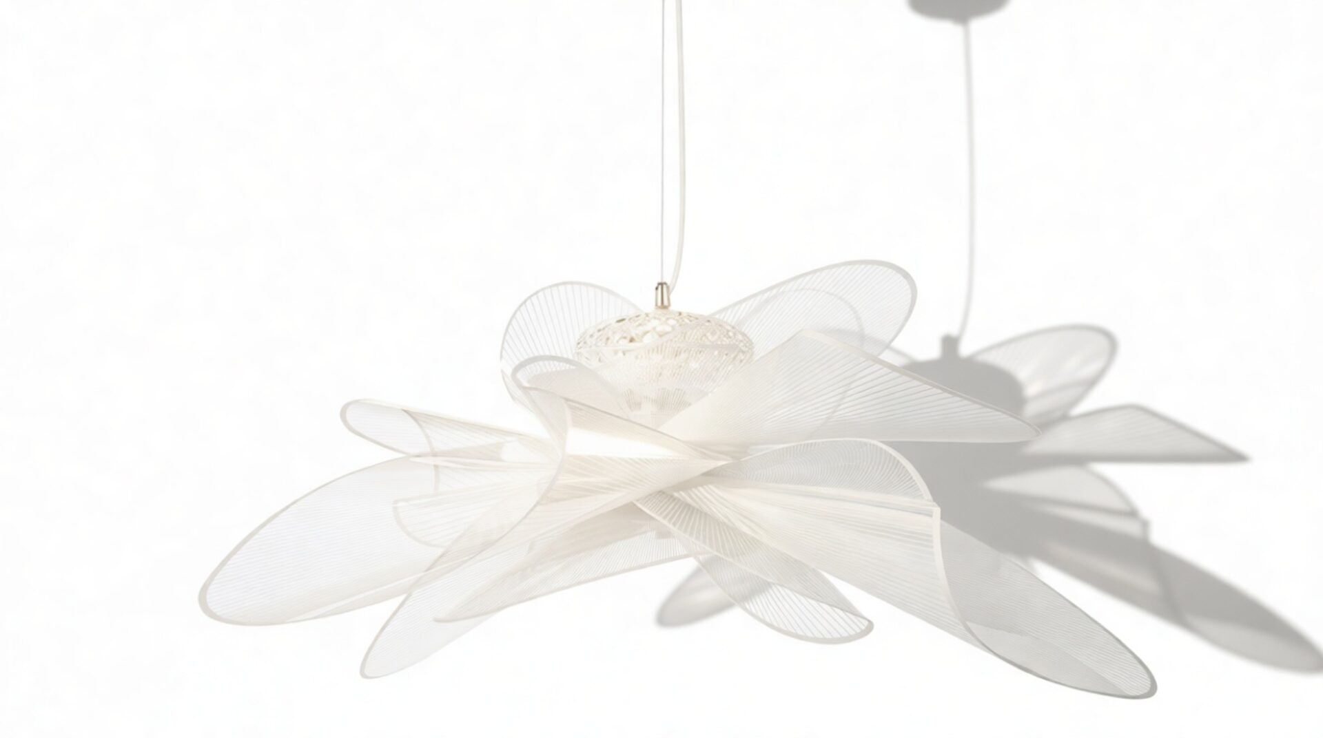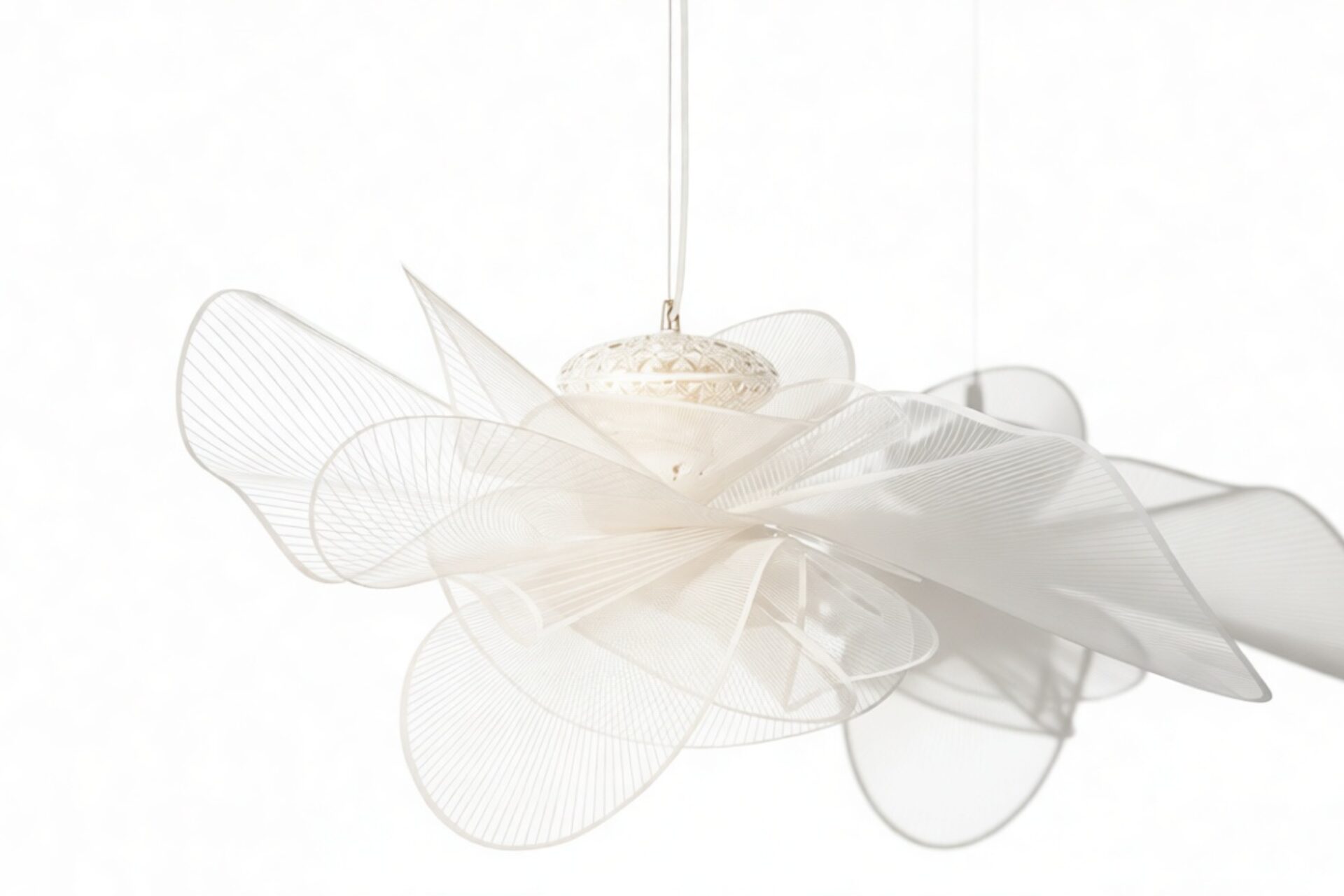 Experience the contemporary elegance of the Organza Ceiling Lamp, a stunning fixture composed of wide, curved acrylic pieces that evoke the movement of undulating waves. Illuminated by an internal LED system encased in a crystal-like compartment, this lamp emits a soft, warm white glow that elevates the atmosphere of any space. Drawing inspiration from the texture and light diffusion qualities of tulle fabric, and suspended by a slender cord, this lamp boasts a remarkably lightweight presence.