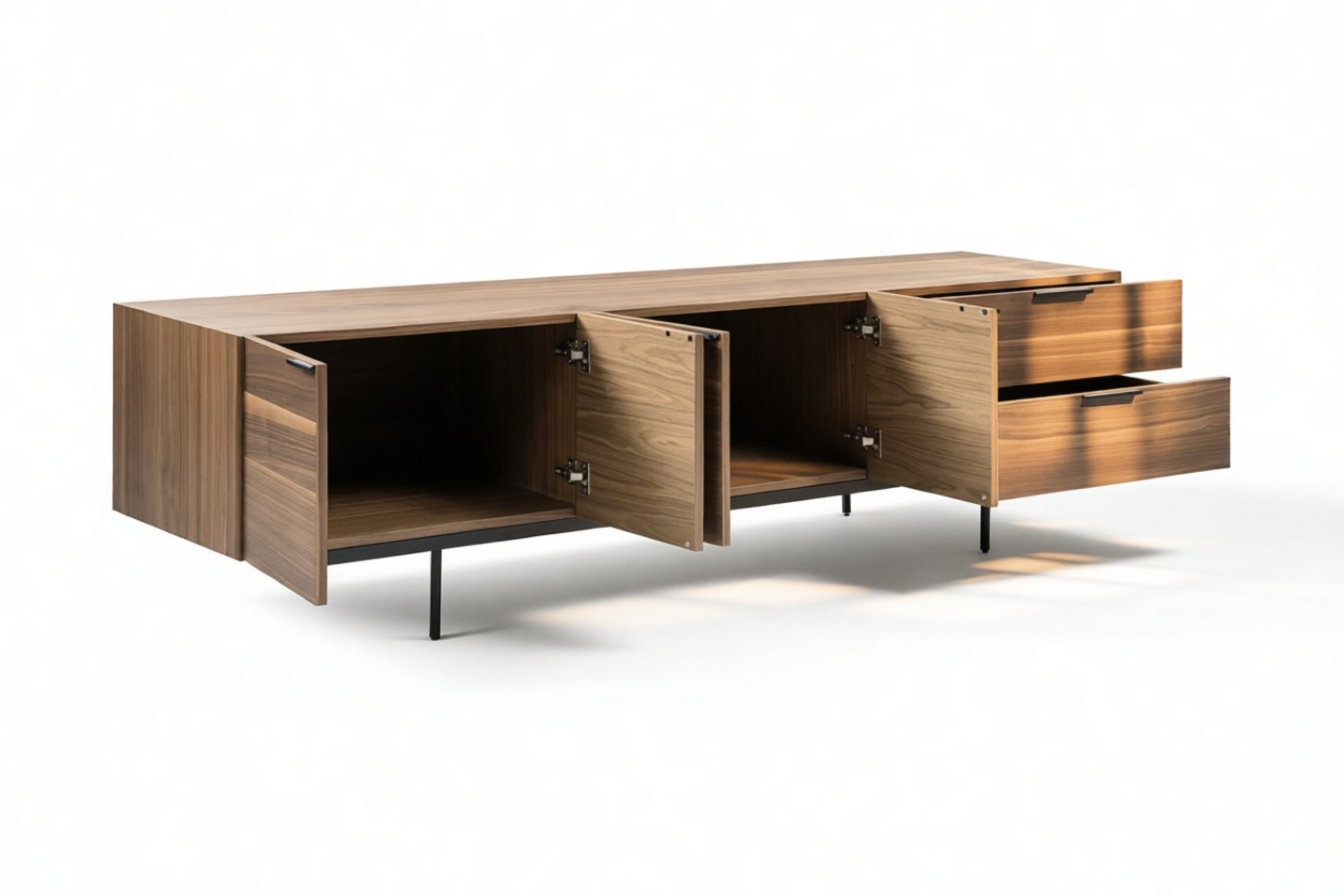 Uncover the multifunctional elegance of the Pastoe Frame-Style Sideboard, crafted from premium walnut veneer and durable steel. Embrace its chic design with clean lines and minimal metal accents. This versatile piece serves as a buffet, media console table, or TV stand while providing ample hidden storage for glassware, china, linens, and more. Elevate your space with the refined Pastoe Sideboard featuring the timeless charm of walnut veneer and a robust steel base, designed to seamlessly blend into any setting from casual to formal.