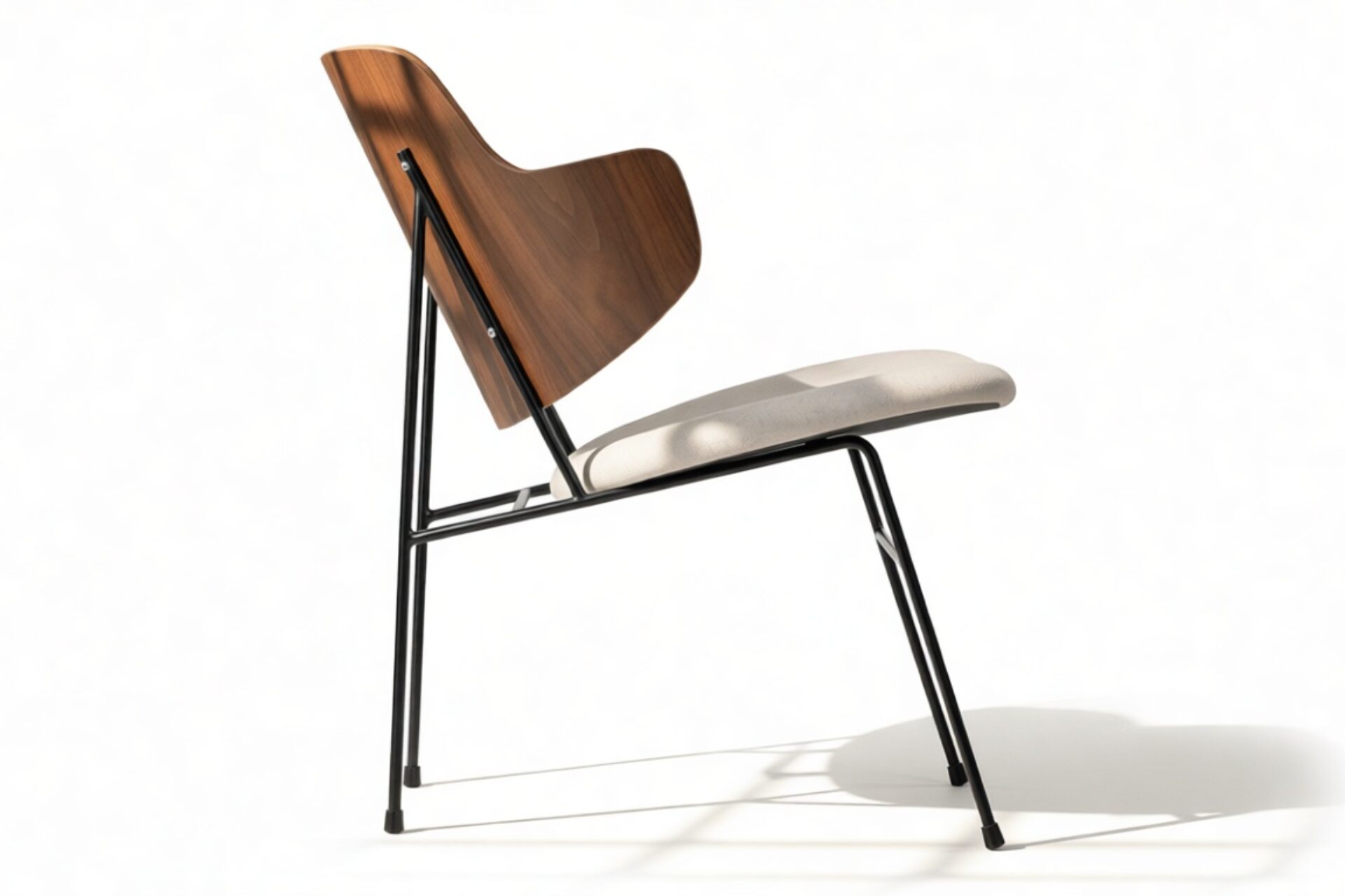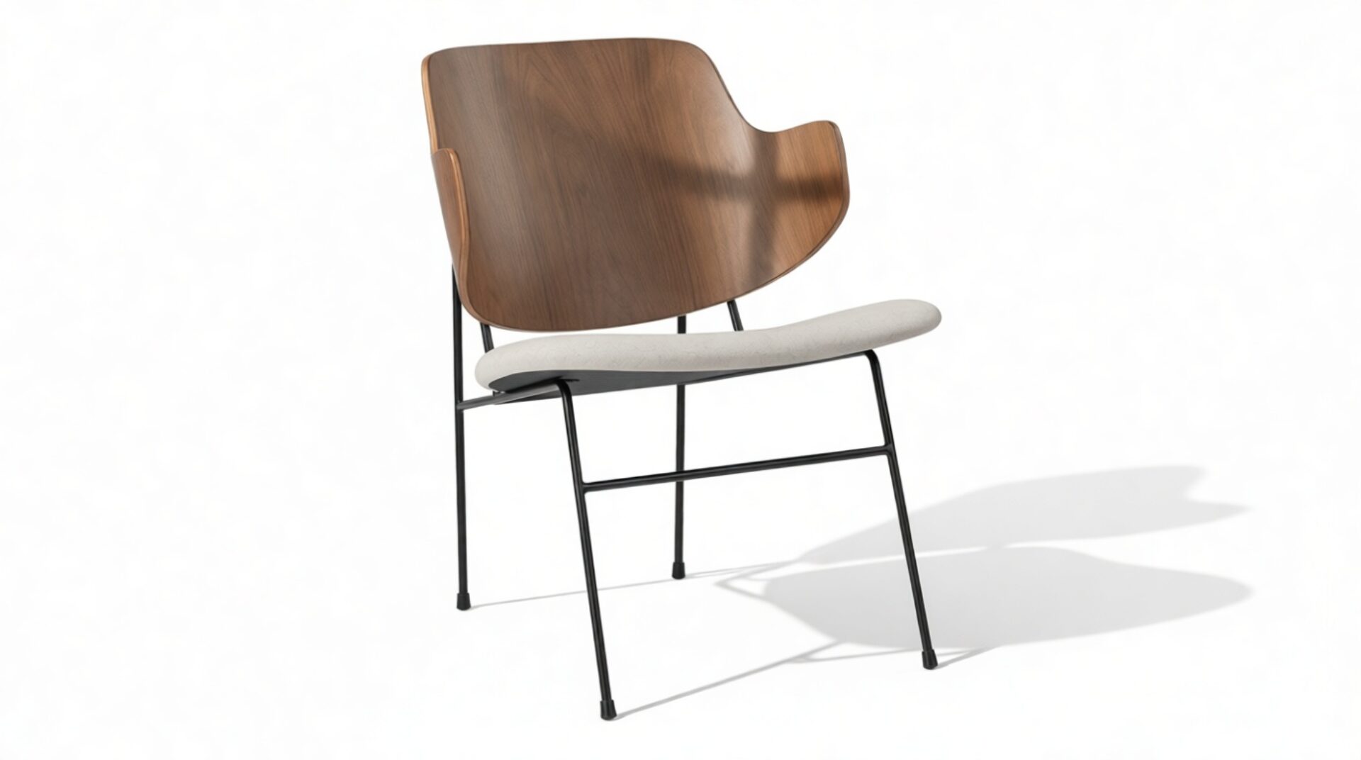 Introducing the Penguin Lounge Chair, a fusion of contemporary and mid-century styles crafted to deliver comfort and elegance. The gracefully curved walnut backrest offers aesthetic appeal and ergonomic support. With a plush, light-colored upholstered seat and sleek metal frame, this chair is a timeless focal point for modern interiors.