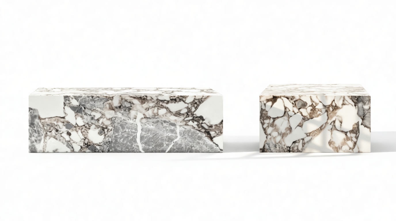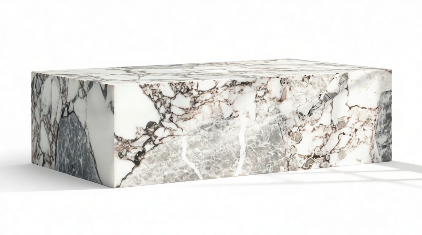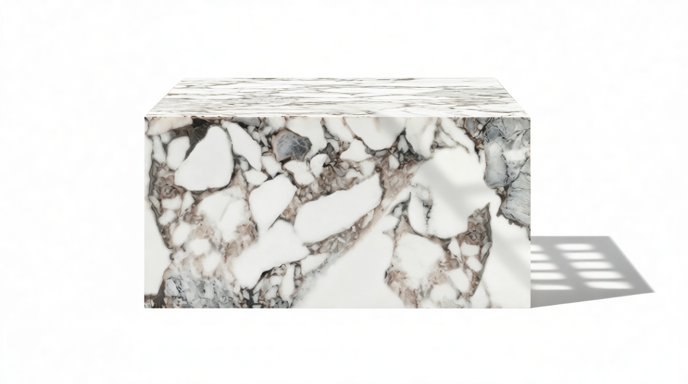 Crafted with a deliberately modest silhouette, the Plinth coffee table is crafted to showcase the inherent beauty of marble in its purest form. Its simple, unassuming profile puts the stone's character at the forefront. Transforming the traditional plinth concept, this modern Danish design presents the pedestal not only as a display piece but as a work of art in itself. Constructed from exquisite Italian modellato marble, each Plinth table is a one-of-a-kind piece, displaying subtle gray and neutral veining, delightful variations in color, and unique distinctive features.