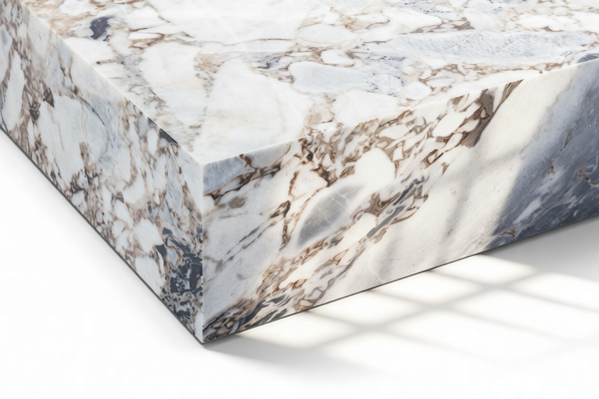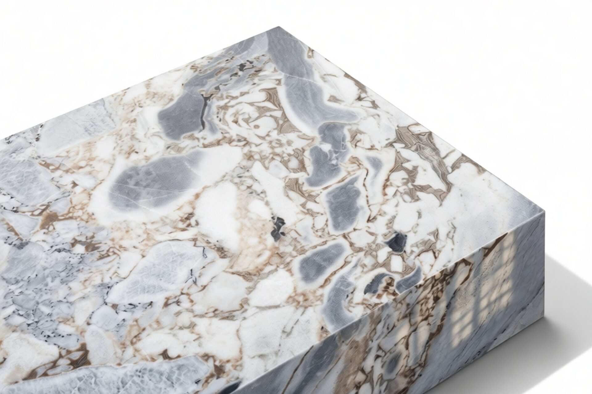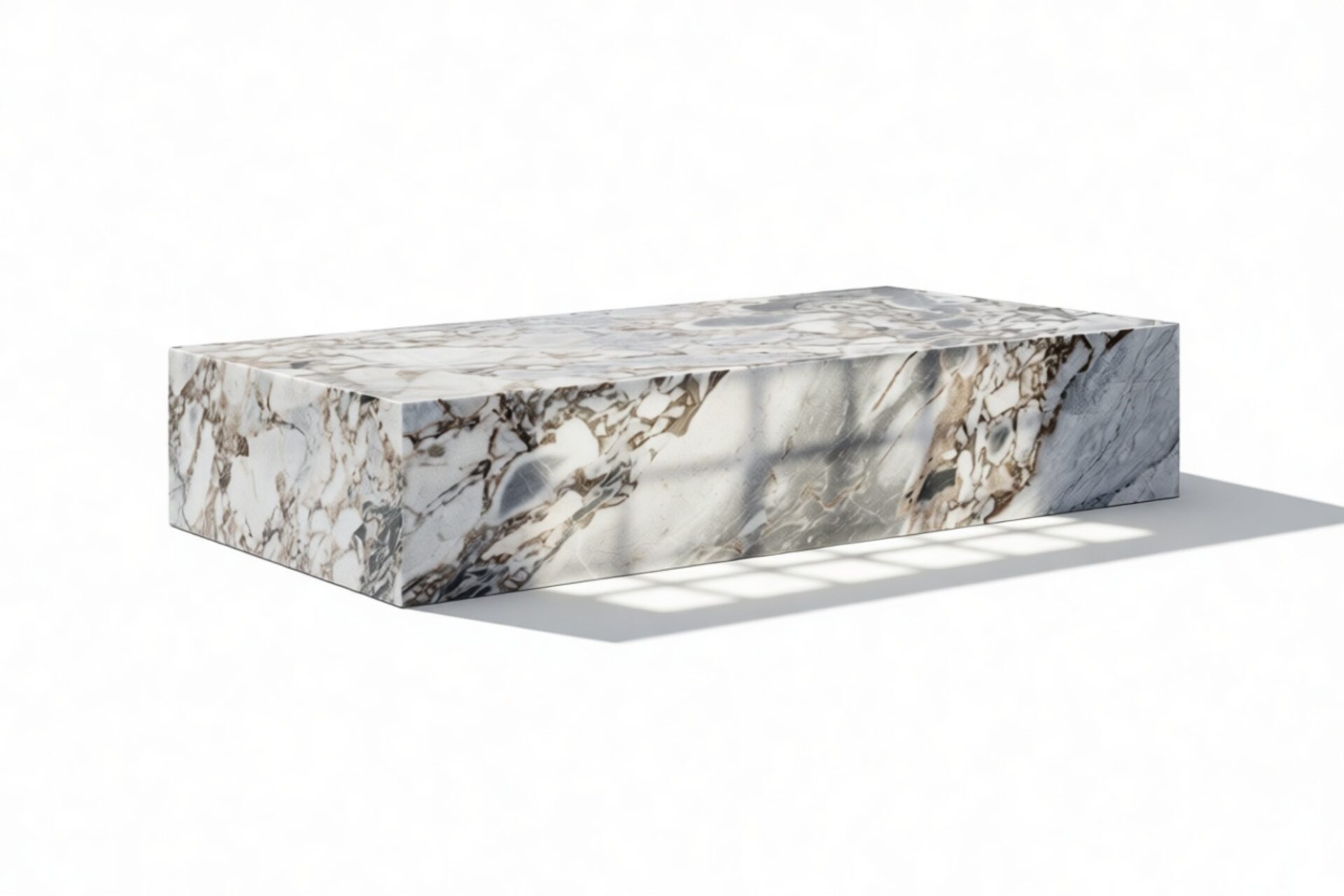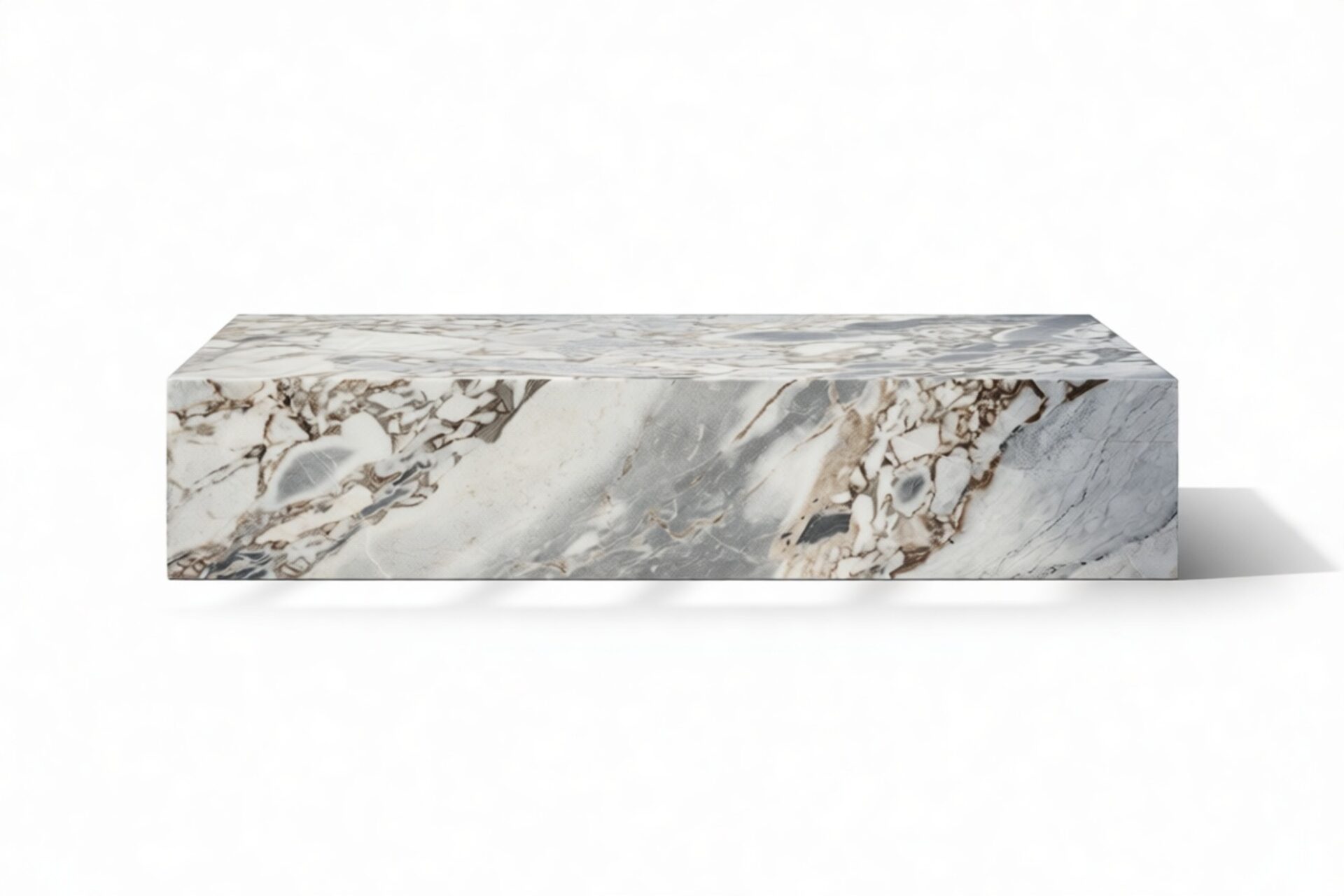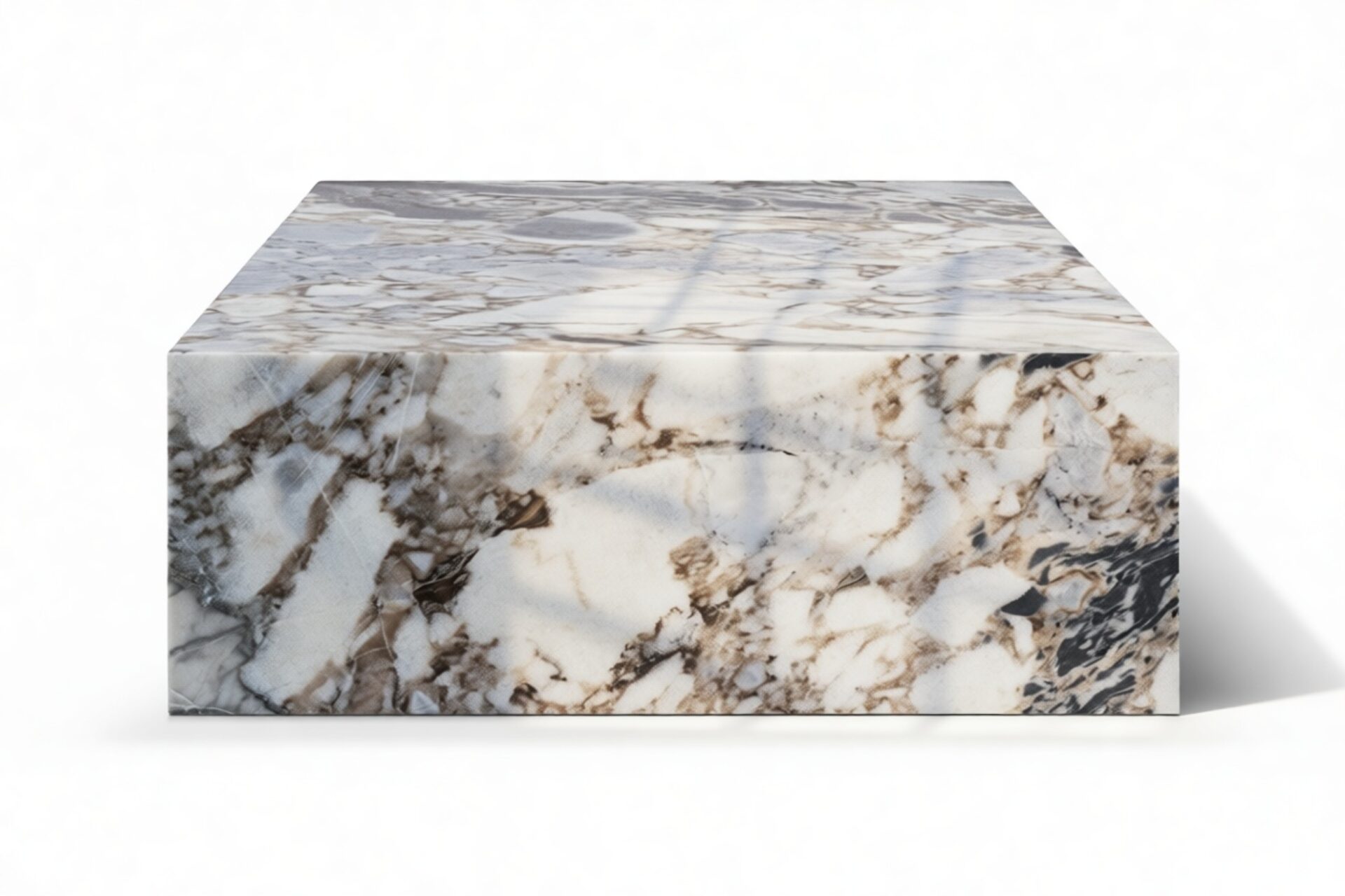 Crafted with a deliberately modest silhouette, the Plinth coffee table is crafted to showcase the inherent beauty of marble in its purest form. Its simple, unassuming profile puts the stone's character at the forefront. Transforming the traditional plinth concept, this modern Danish design presents the pedestal not only as a display piece but as a work of art in itself. Constructed from exquisite Italian modellato marble, each Plinth table is a one-of-a-kind piece, displaying subtle gray and neutral veining, delightful variations in color, and unique distinctive features.