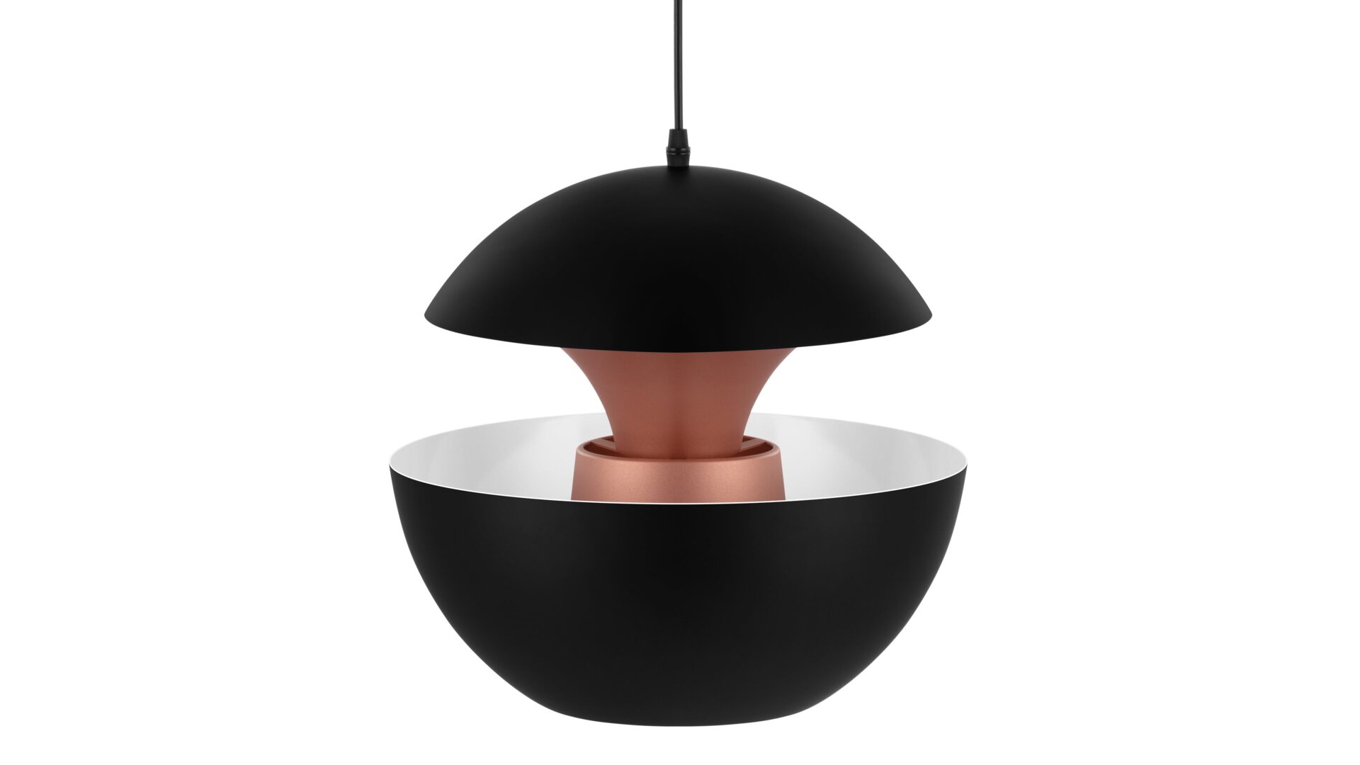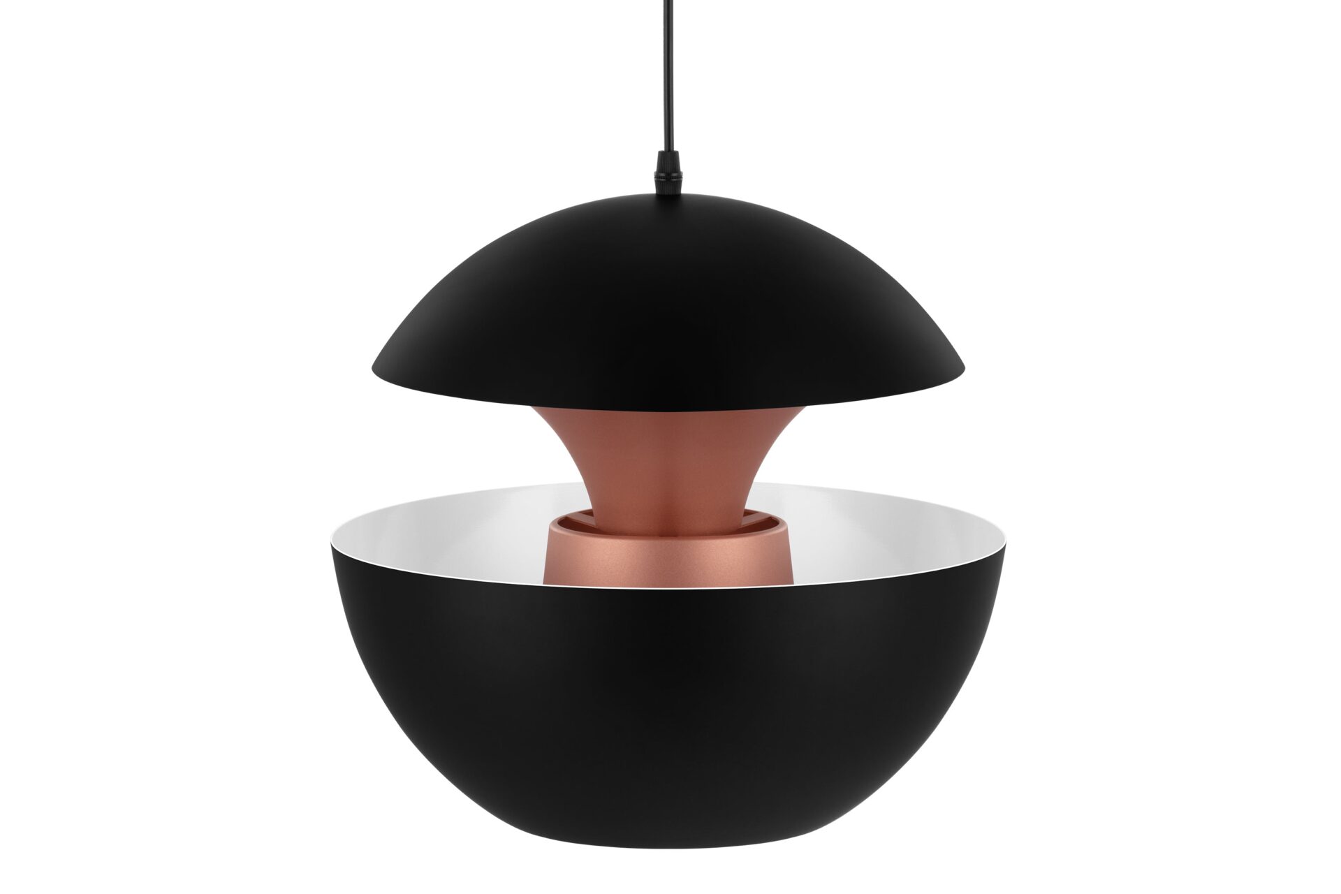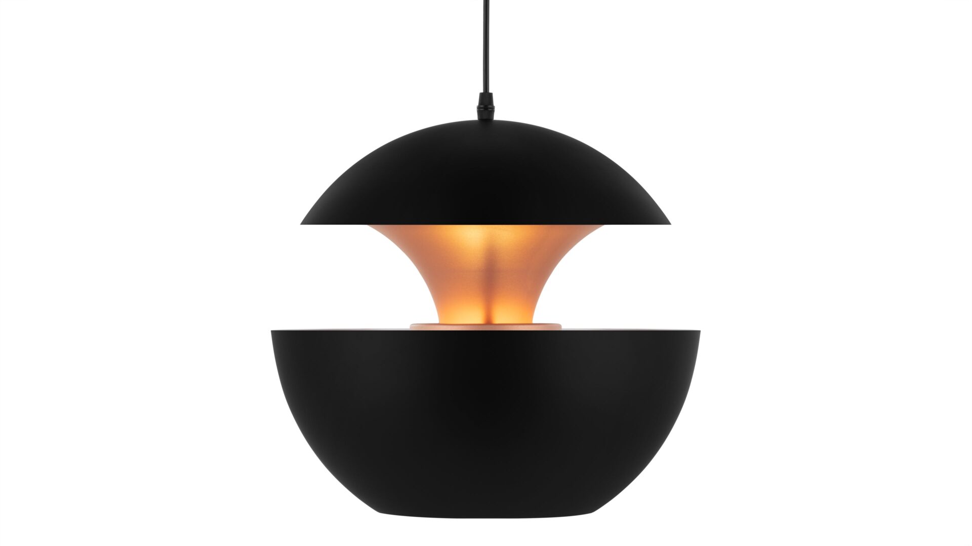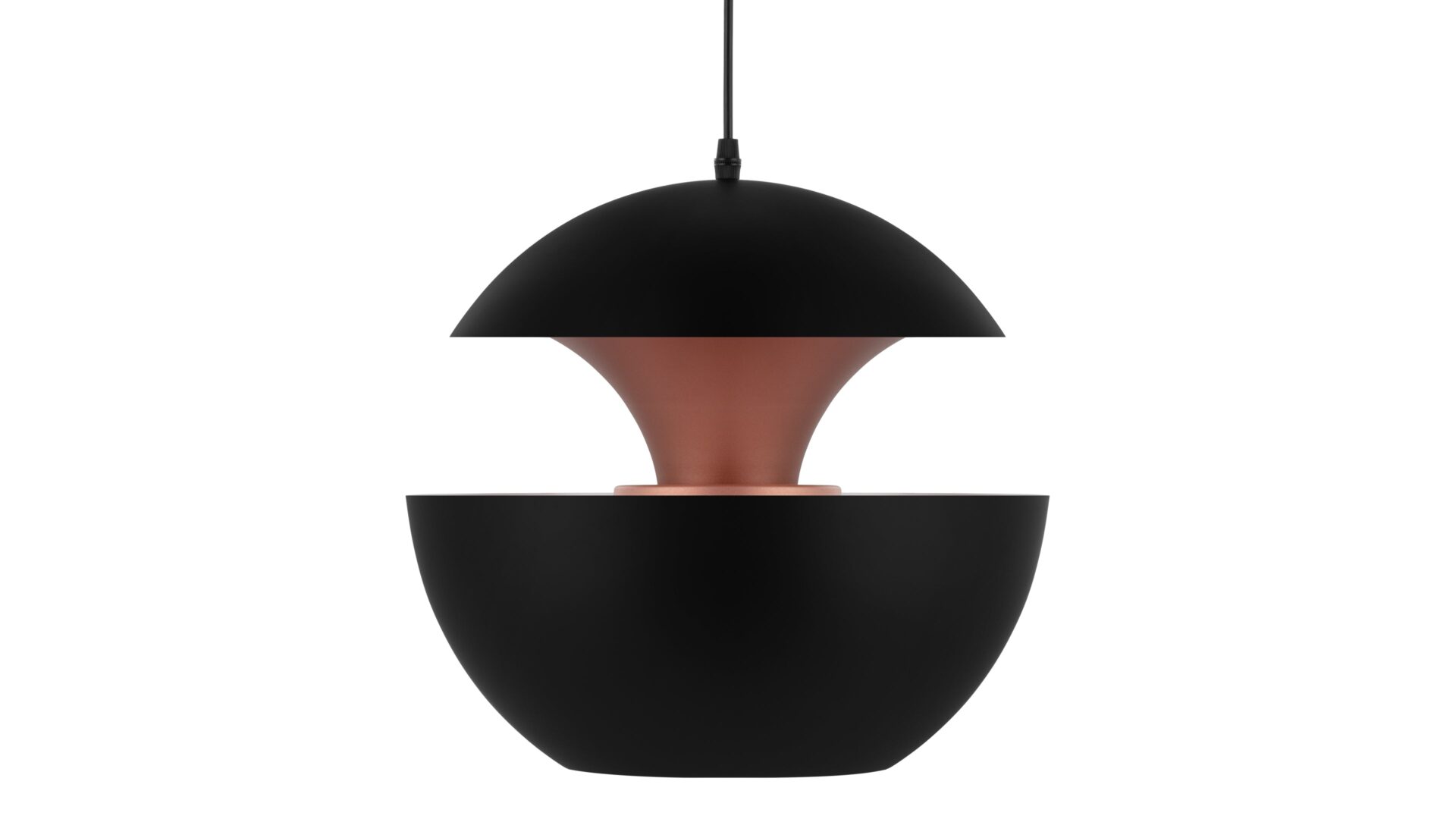 Embodying vintage elegance with a modern twist, the Pomme Pendant Light is a tribute to 1970s design sensibilities. Its spherical silhouette, finished in sleek black lacquered aluminum with a reflective copper interior, diffuses a warm and inviting glow. This statement piece creates a nostalgic ambiance, transforming any space into a chic and stylish retreat.