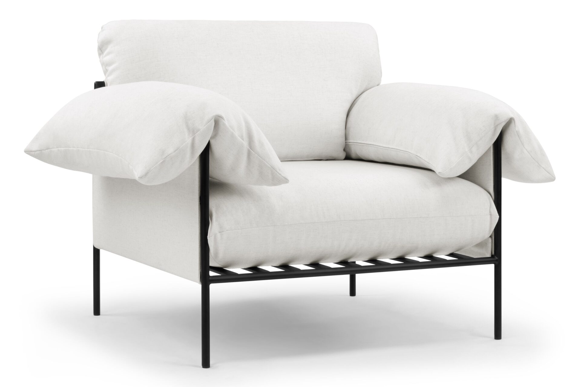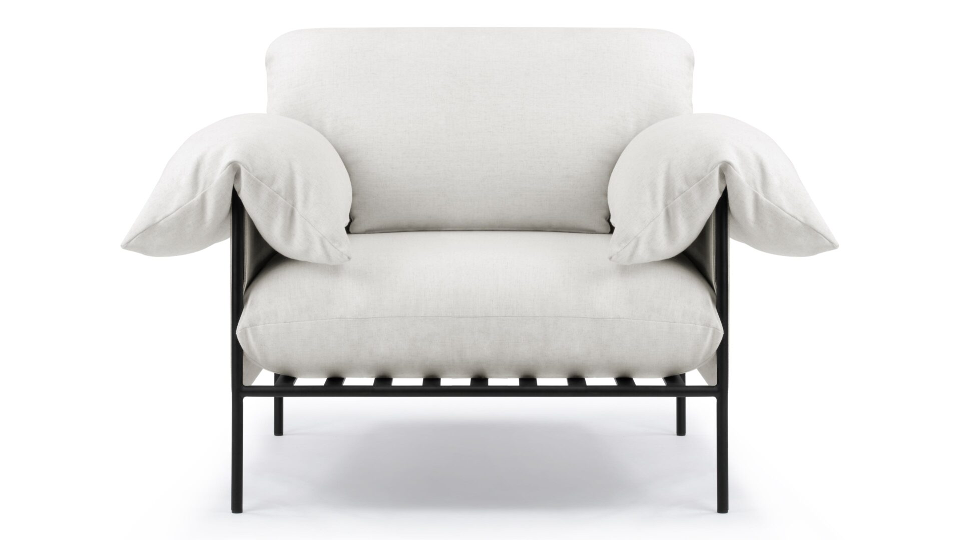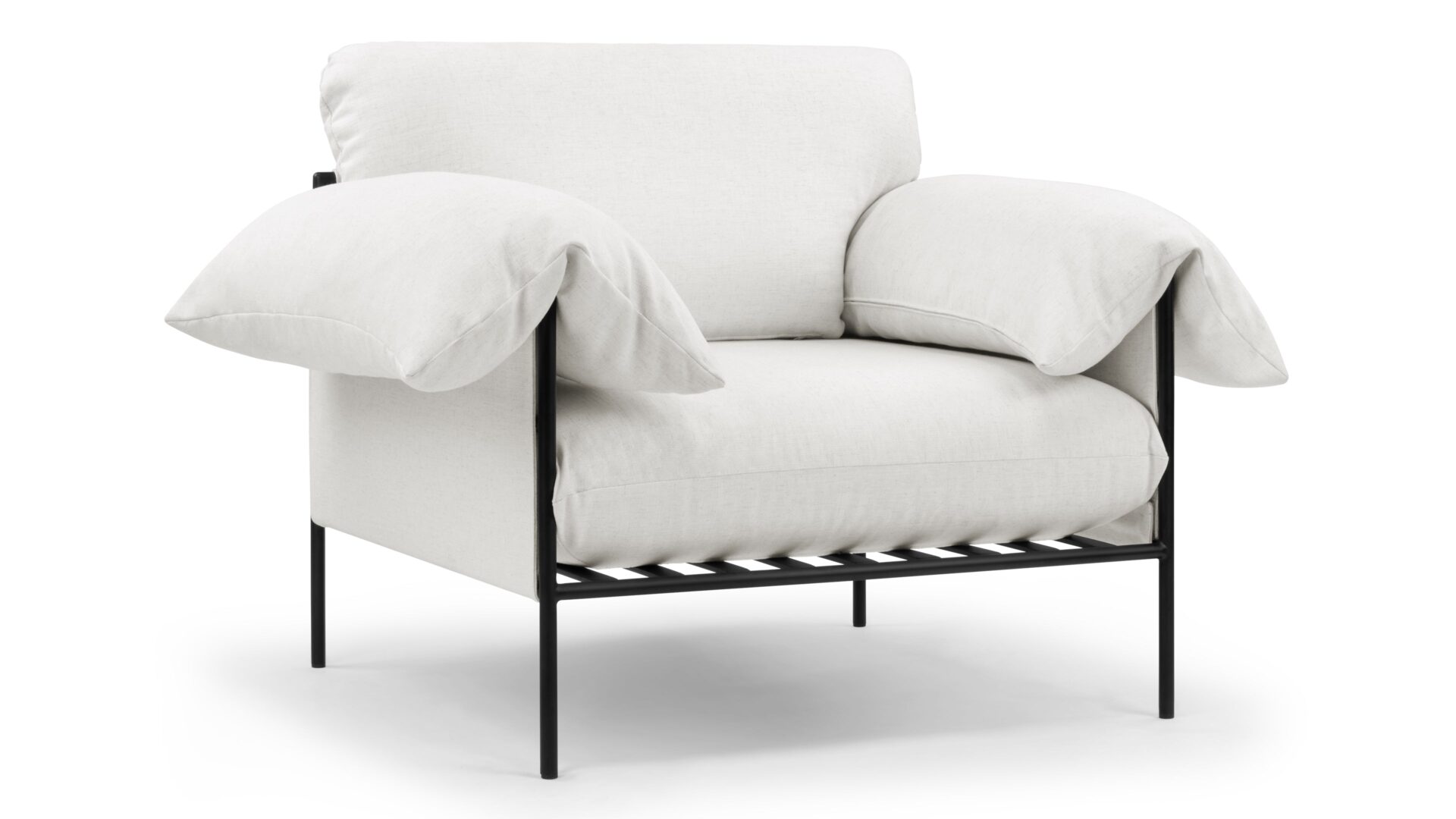 Experience cloud-like seating with the Positano Lounge Chair. This chair features a black powder-coated metal frame that provides durable support for plush foam cushions and pillow-like armrests. Its suspended seat design and neutral off-white upholstery make it a versatile piece for both modern and cozy interiors.