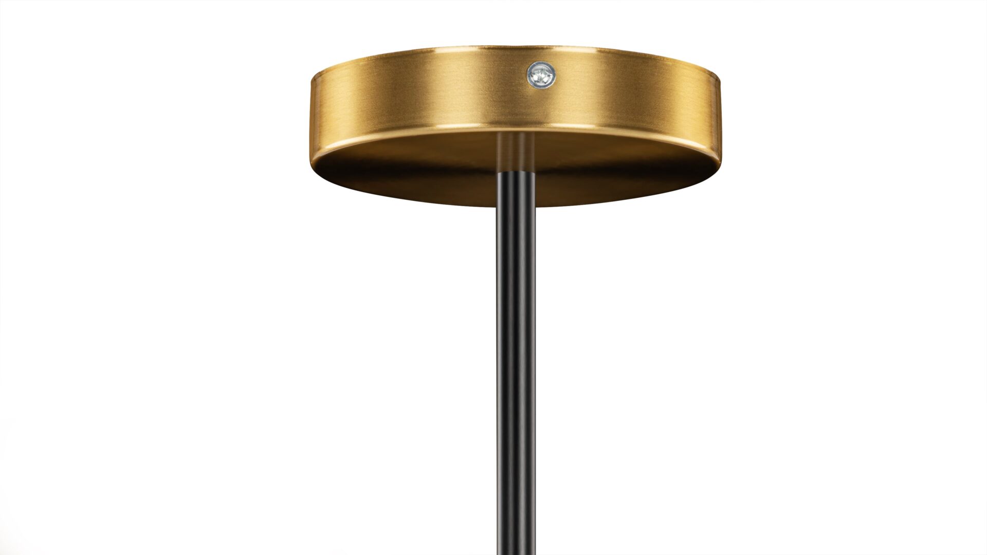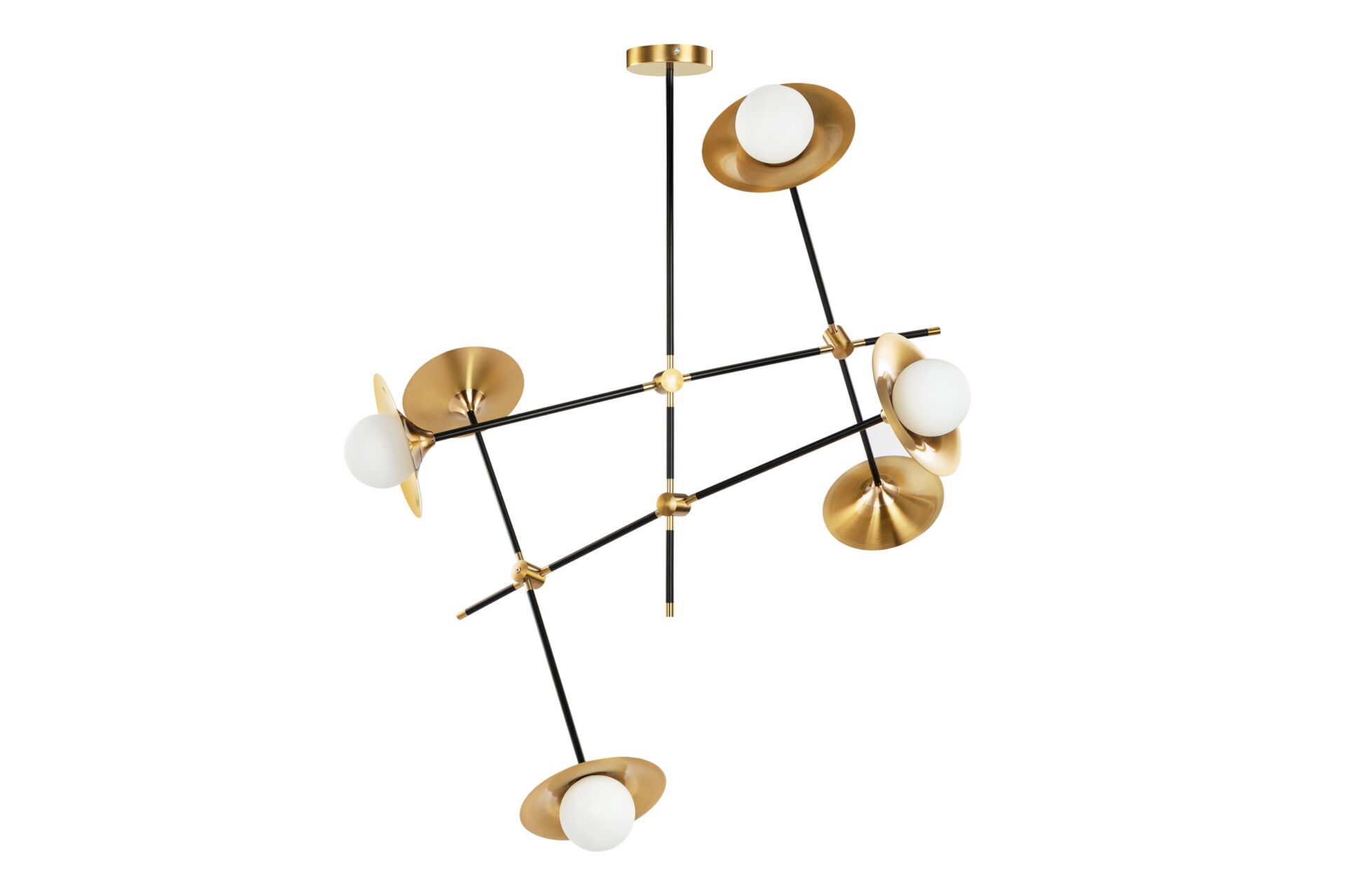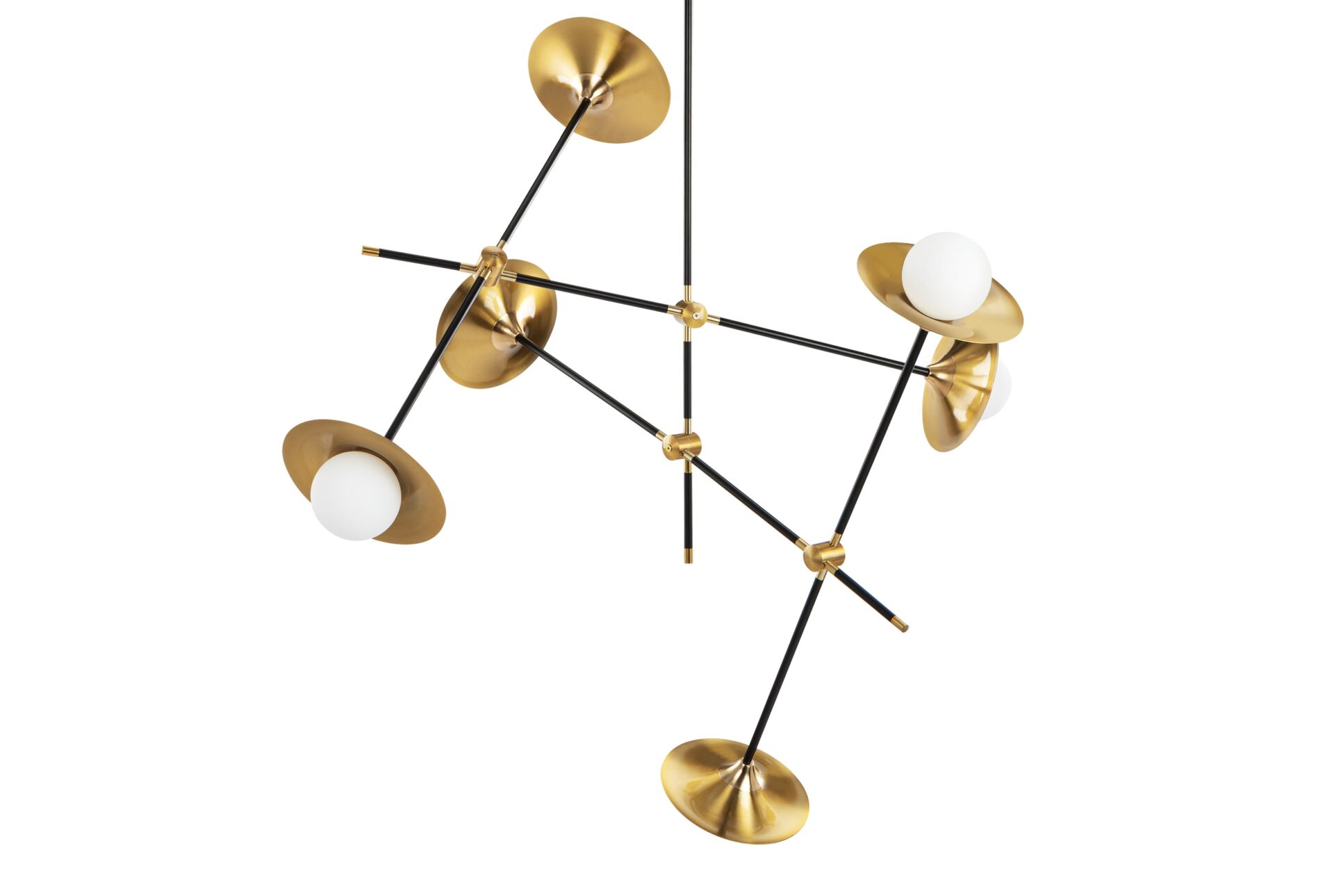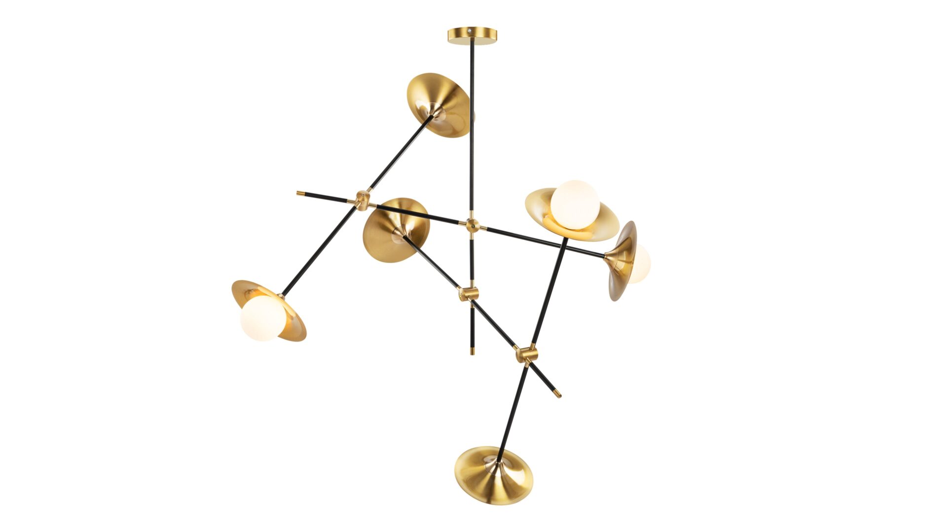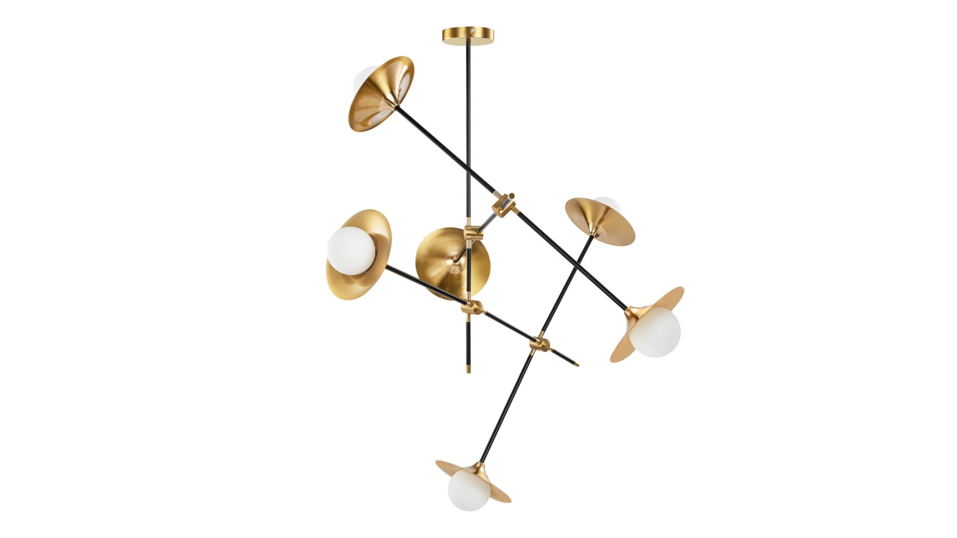 Crafted from sturdy iron, this exquisite chandelier showcases a brass finish on the shades and pivot points, elegantly contrasted by sleek black poles and a striking brass-colored ceiling mount. The use of premium materials guarantees both durability and a touch of opulence.