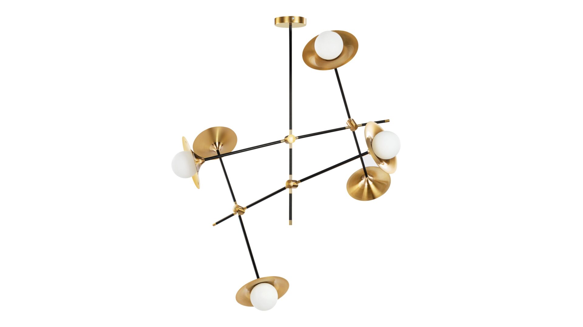 Experience modern elegance with the Prater Chandelier, showcasing a stylish metal construction with a unique and contemporary flair. Its adjustable poles offer flexibility to direct light, while the black finish creates a striking contrast with the bright brass finish on the shades, pivot points, and ceiling mount. The standout trumpet-like shades enhance the chandelier's distinctive and captivating look. Perfect for modern interiors, this statement lighting piece seamlessly combines functionality with a memorable visual appeal.