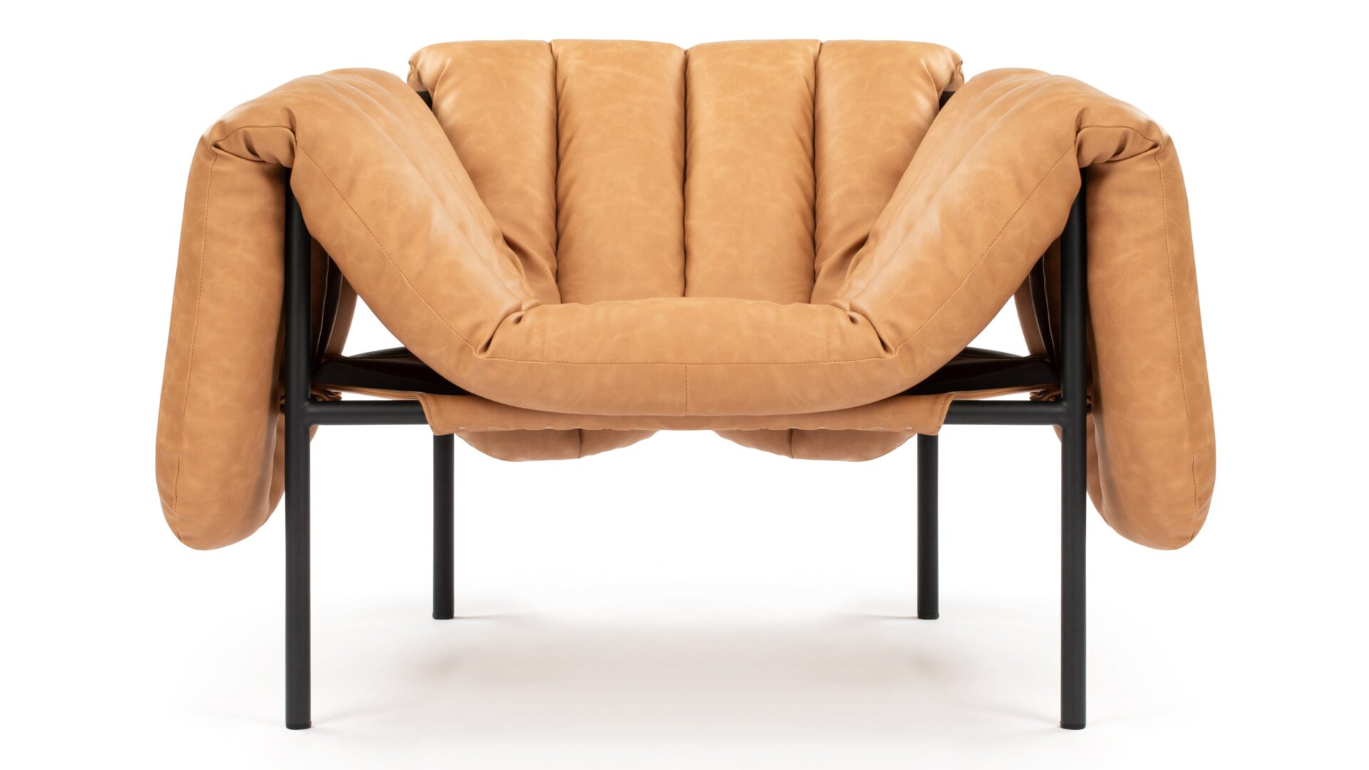 Elevate your living space with the modernist charm of the Puffy Lounge Chair in luxurious tan vegan leather. The plush quilted cushioning promises ultimate comfort, while the sturdy silver tubular frame ensures durability. Its Bauhaus-style design adds a sophisticated touch, making this lounge chair a stylish and inviting addition to your home.