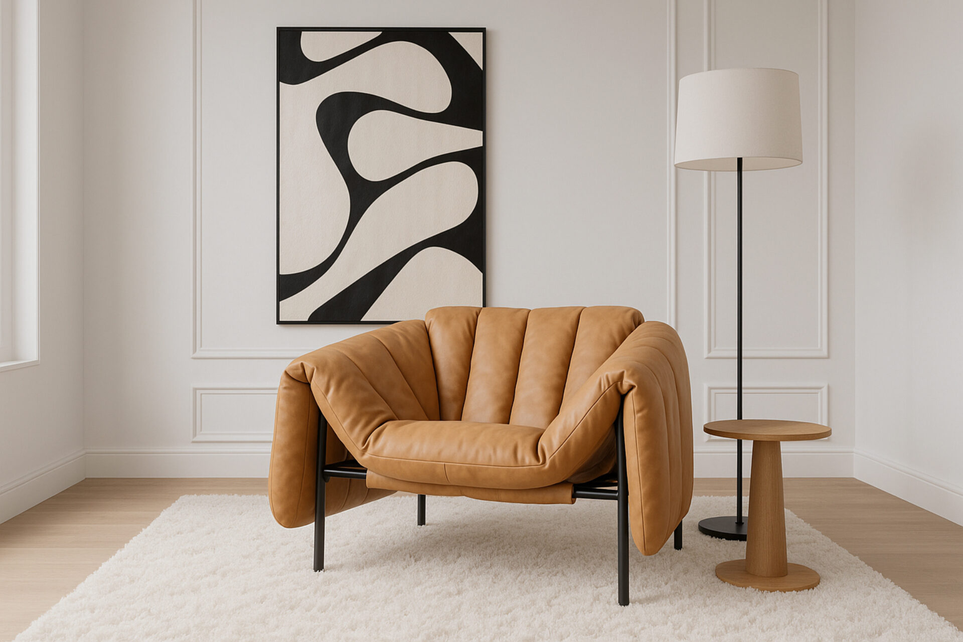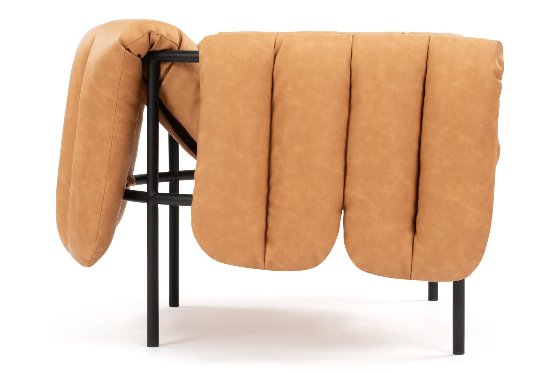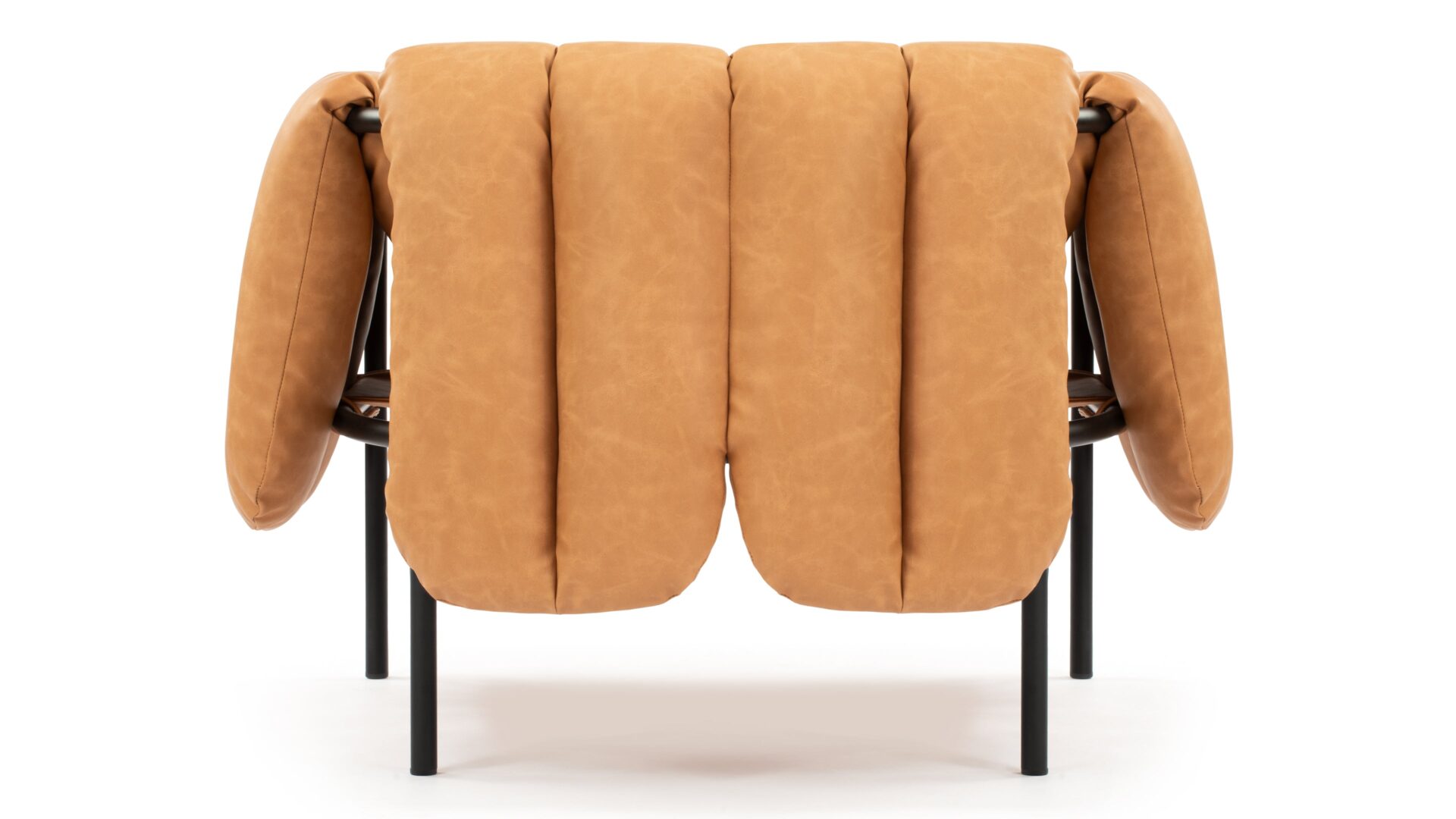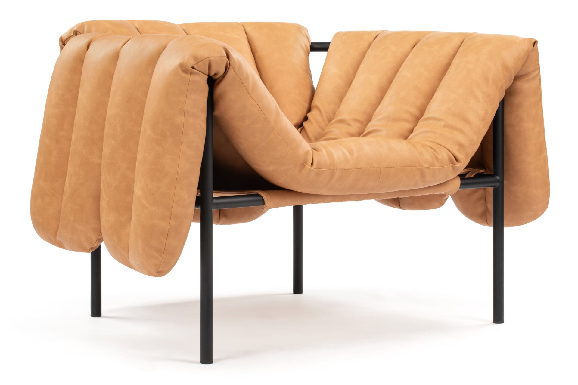 Experience ultimate comfort with the Puffy Lounge Chair, showcasing quilted cushioning in luxurious tan leather. The chair's soft, warm brown hue and inviting texture make it a perfect addition to any living space. The detachable upholstery allows for easy maintenance, ensuring your chair remains in pristine condition for years to come.