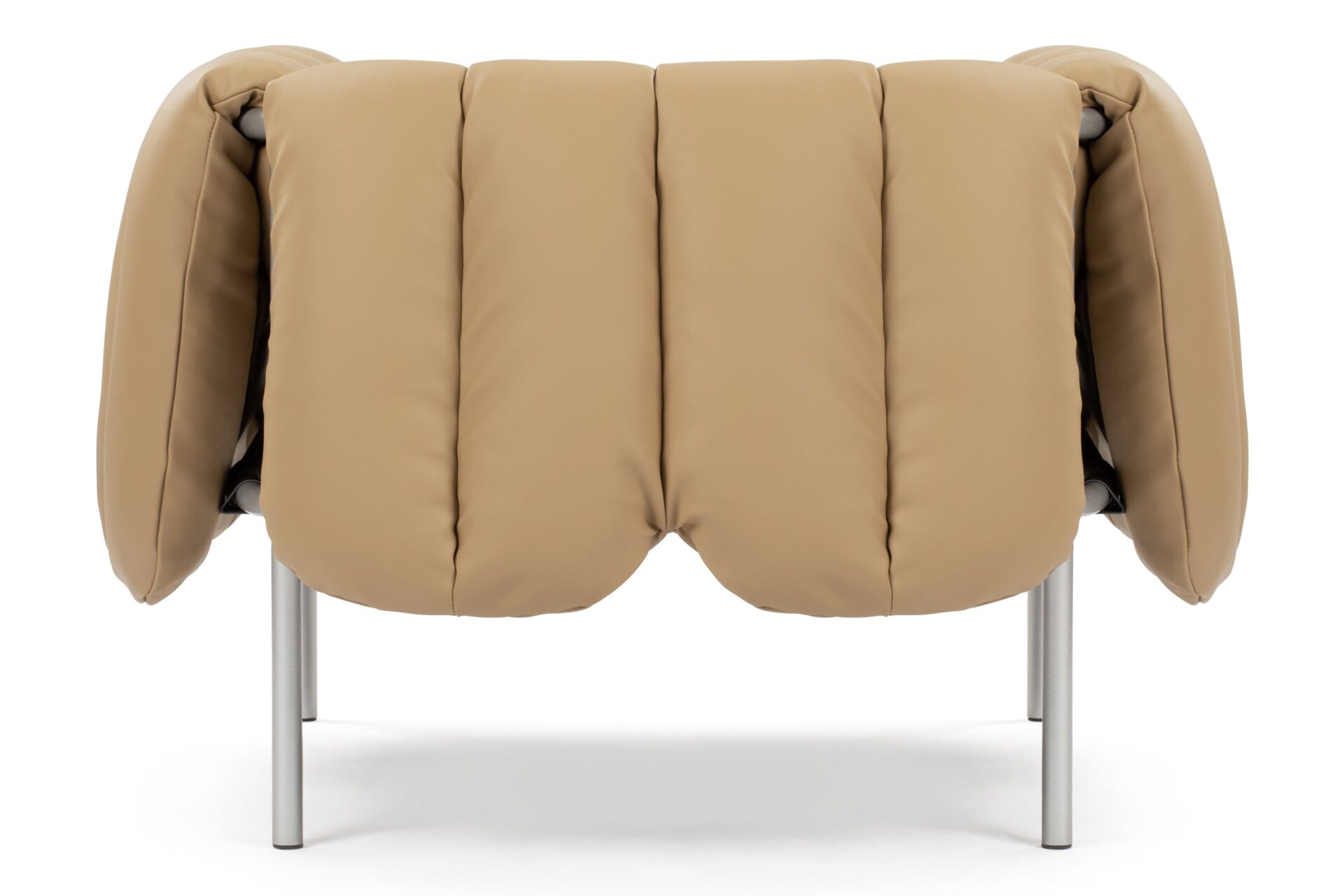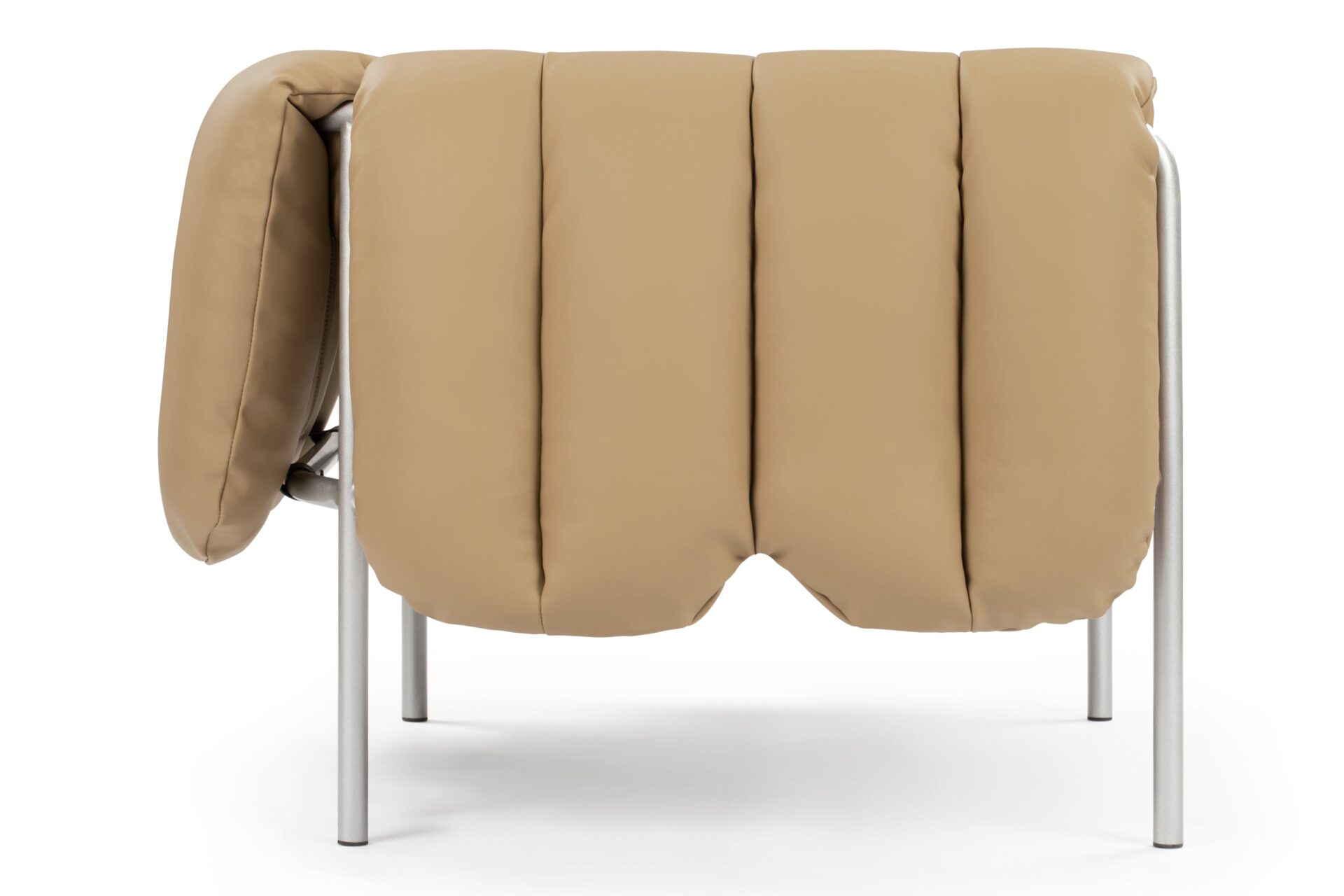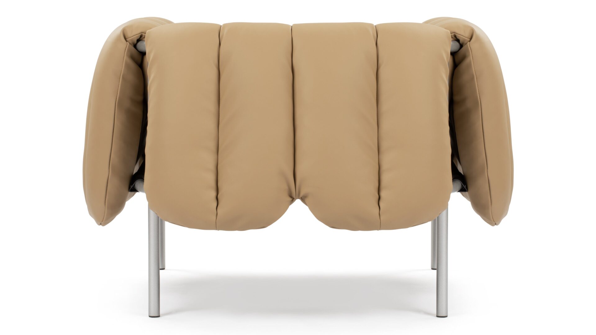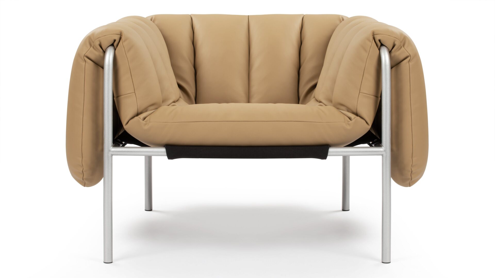 Experience the modernist charm of the Puffy Lounge Chair featuring a playful touch, distinguished by a Bauhaus-style frame and inviting quilted cushioning. The chair's tan leather upholstery and silver tubular frame deliver a captivating visual contrast.