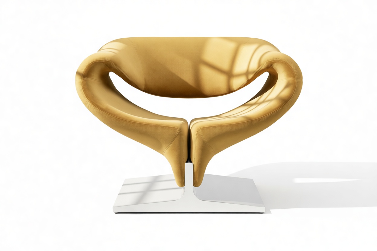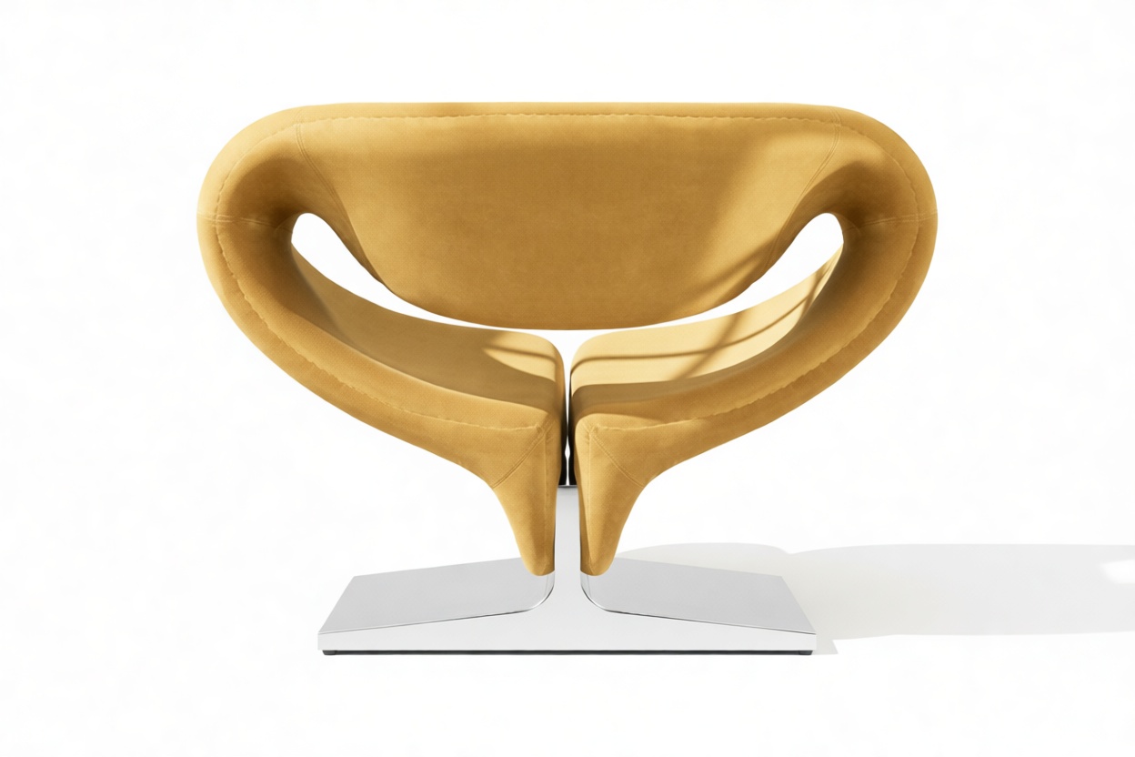 Experience the sleek sophistication of the Ribbon Chair, where futuristic design meets luxurious comfort. Crafted with a fiberglass frame that boasts sculptural fluidity, this chair features foam padding that seamlessly merges into the frame for ergonomic support. The sleek contrast of the polished steel base against the plush upholstery creates a striking visual aesthetic. With its curved, organic shape and minimal seams, the Ribbon Chair is a bold statement piece that exudes an avant-garde appeal.