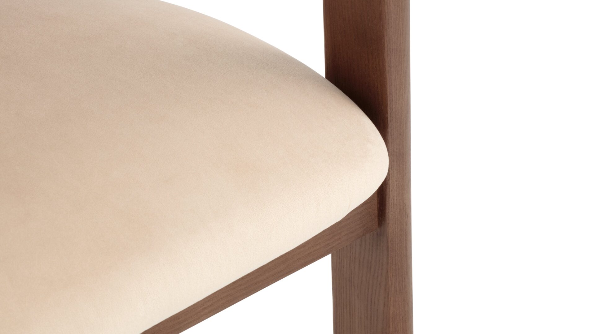 Wrapped in a luxurious beige-gray velvet upholstery, the Rose tantalizes with its lavish softness and inviting texture. The neutral tone of the velvet effortlessly harmonizes with the walnut frame, establishing a seamless blend of comfort and elegance.