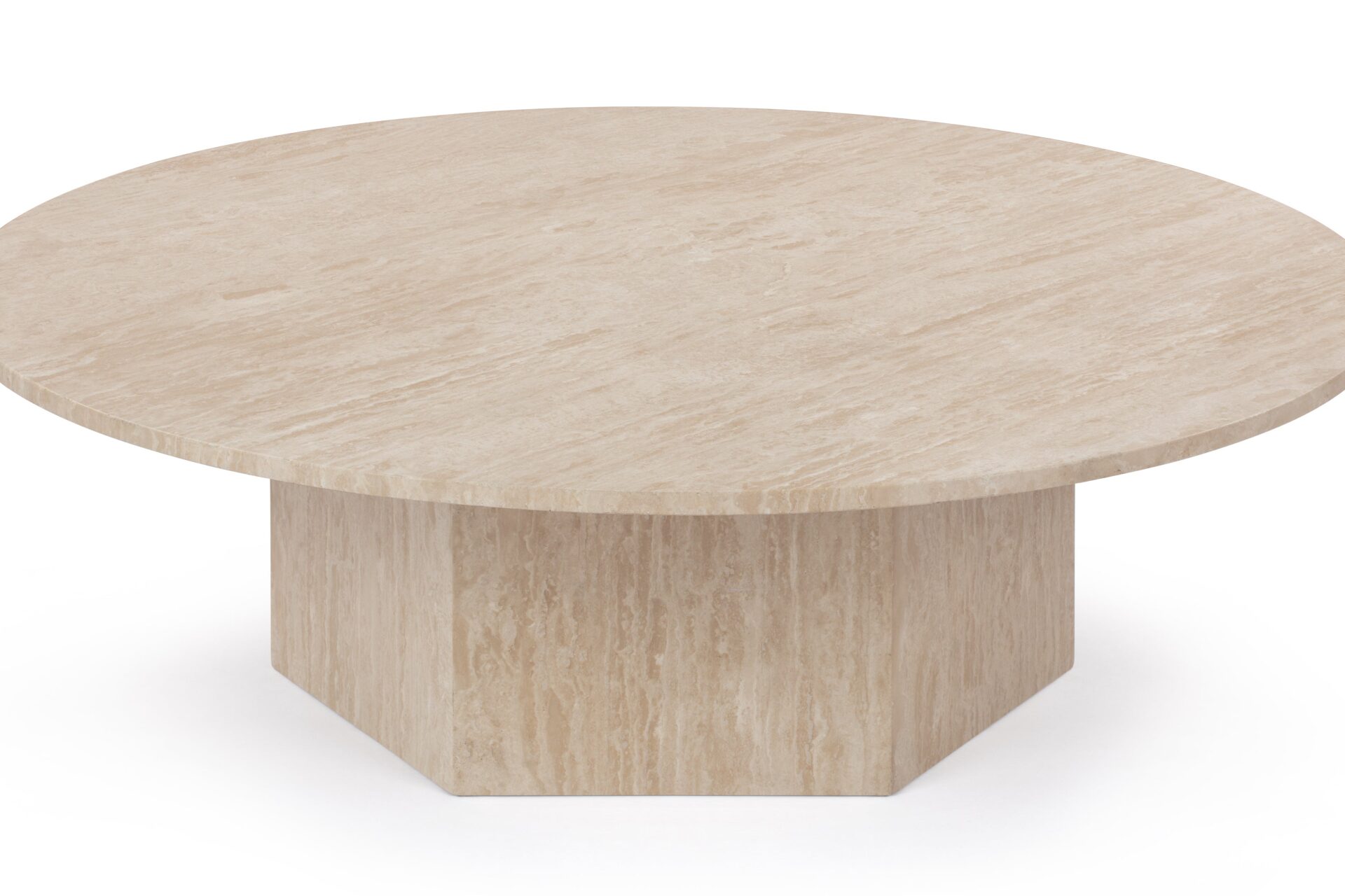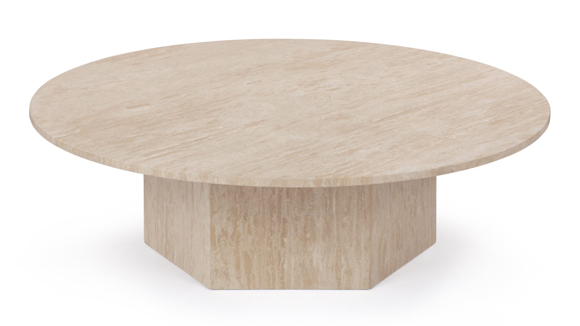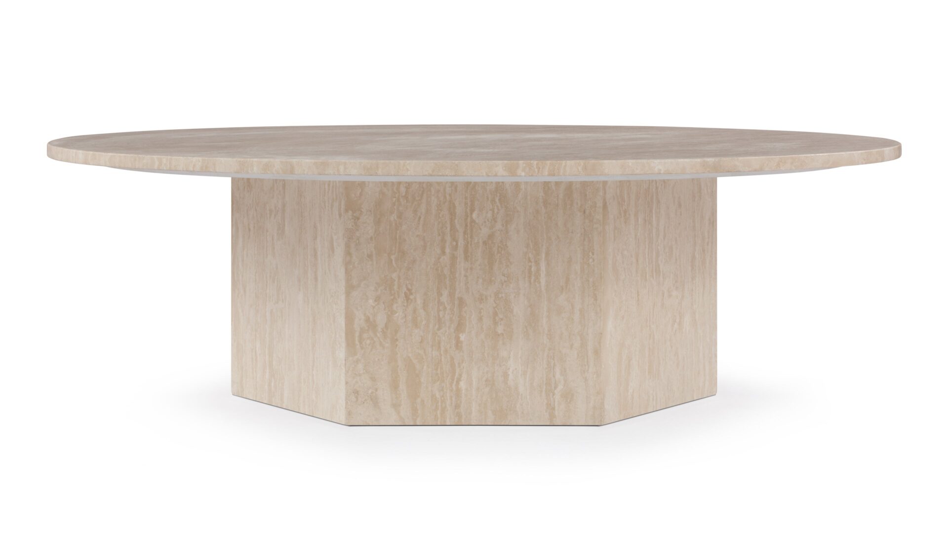 Inspired by ancient Roman architecture, the Saga Coffee Table seamlessly marries contemporary style with minimalist design. The smooth travertine top elegantly contrasts the angular base, showcasing the stone's rich texture, veining, and color variations. With a hexagonal plinth base providing ample room, this exquisite table celebrates the opulence of natural travertine, creating a versatile and sophisticated centerpiece.