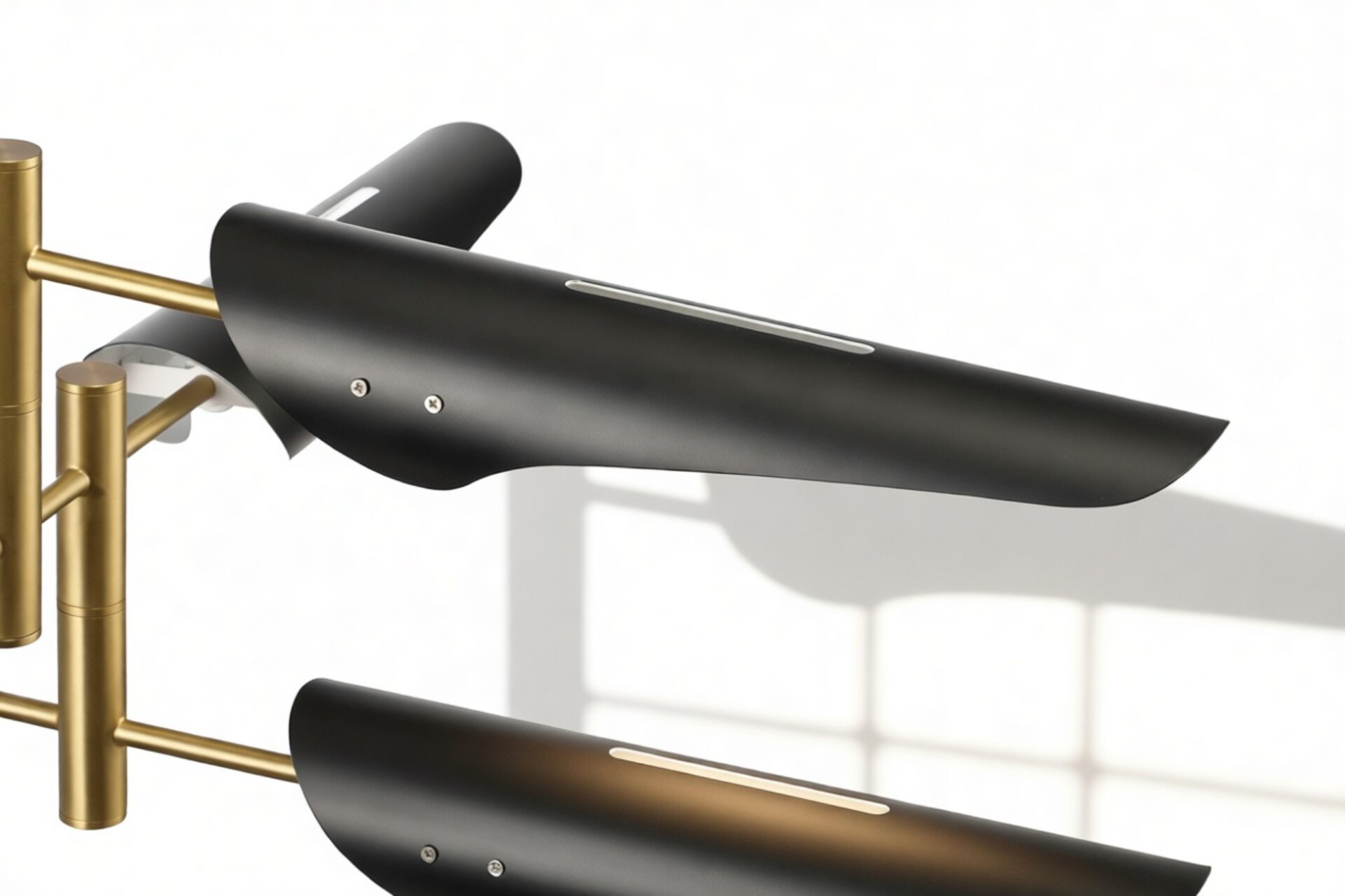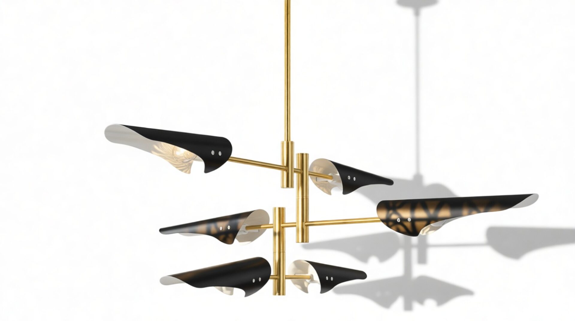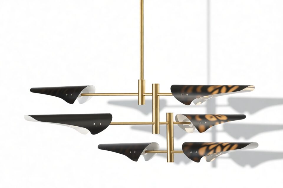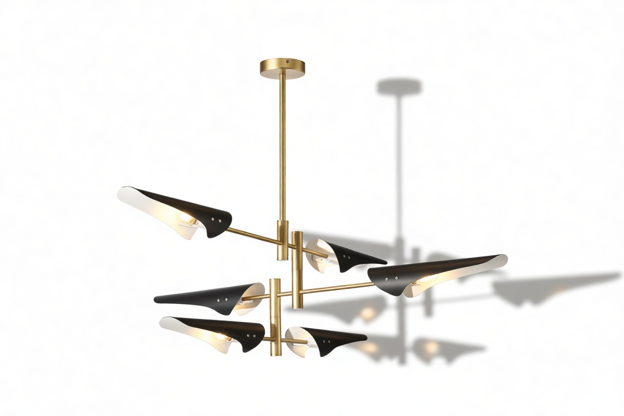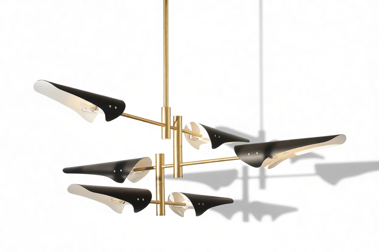 Introducing the Sano Pendant Light, showcasing adjustable brass arms topped with black shades, this fixture exudes timeless elegance. Ideal for both office and living spaces, this piece pays homage to traditional design.