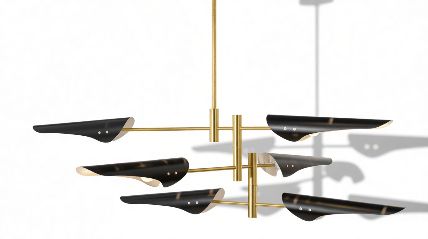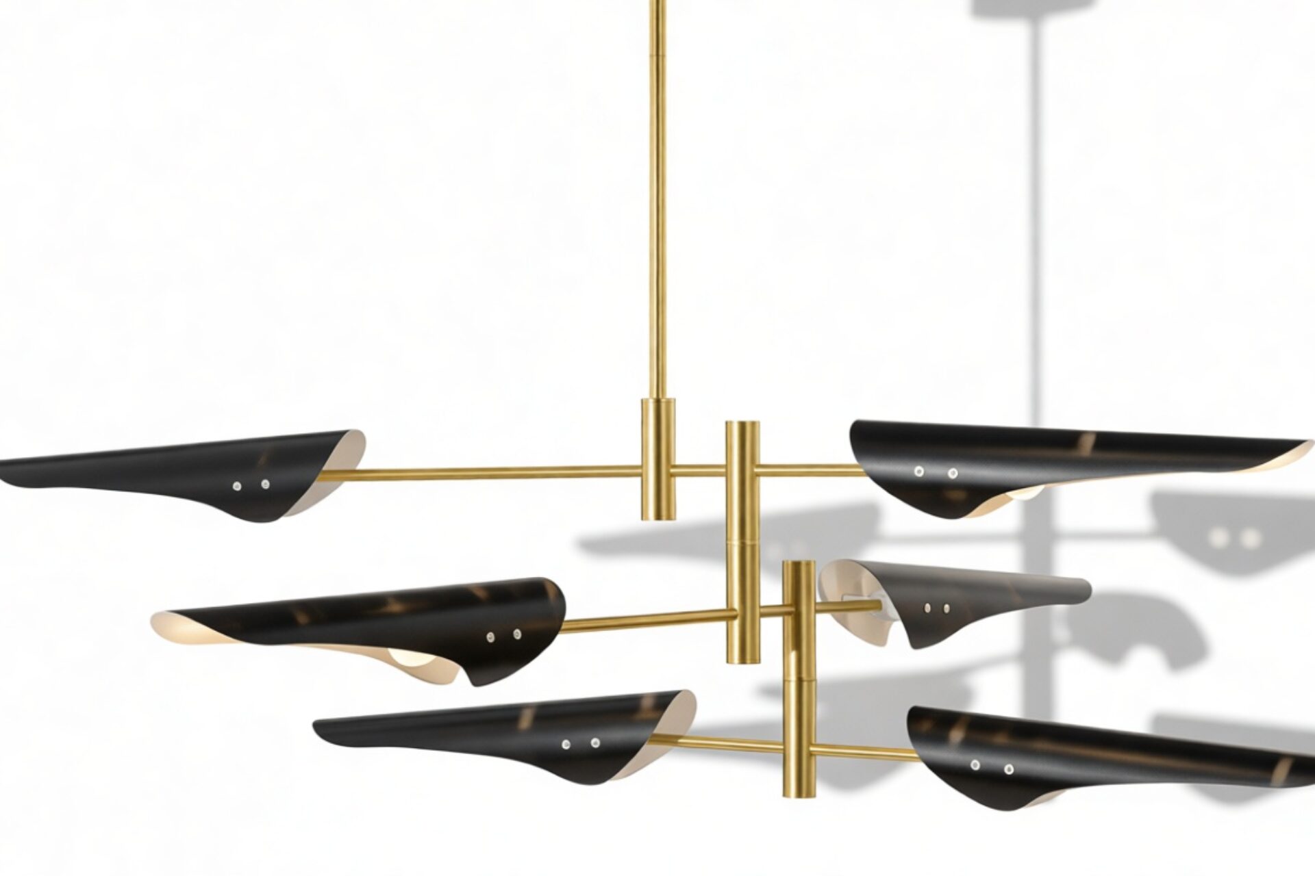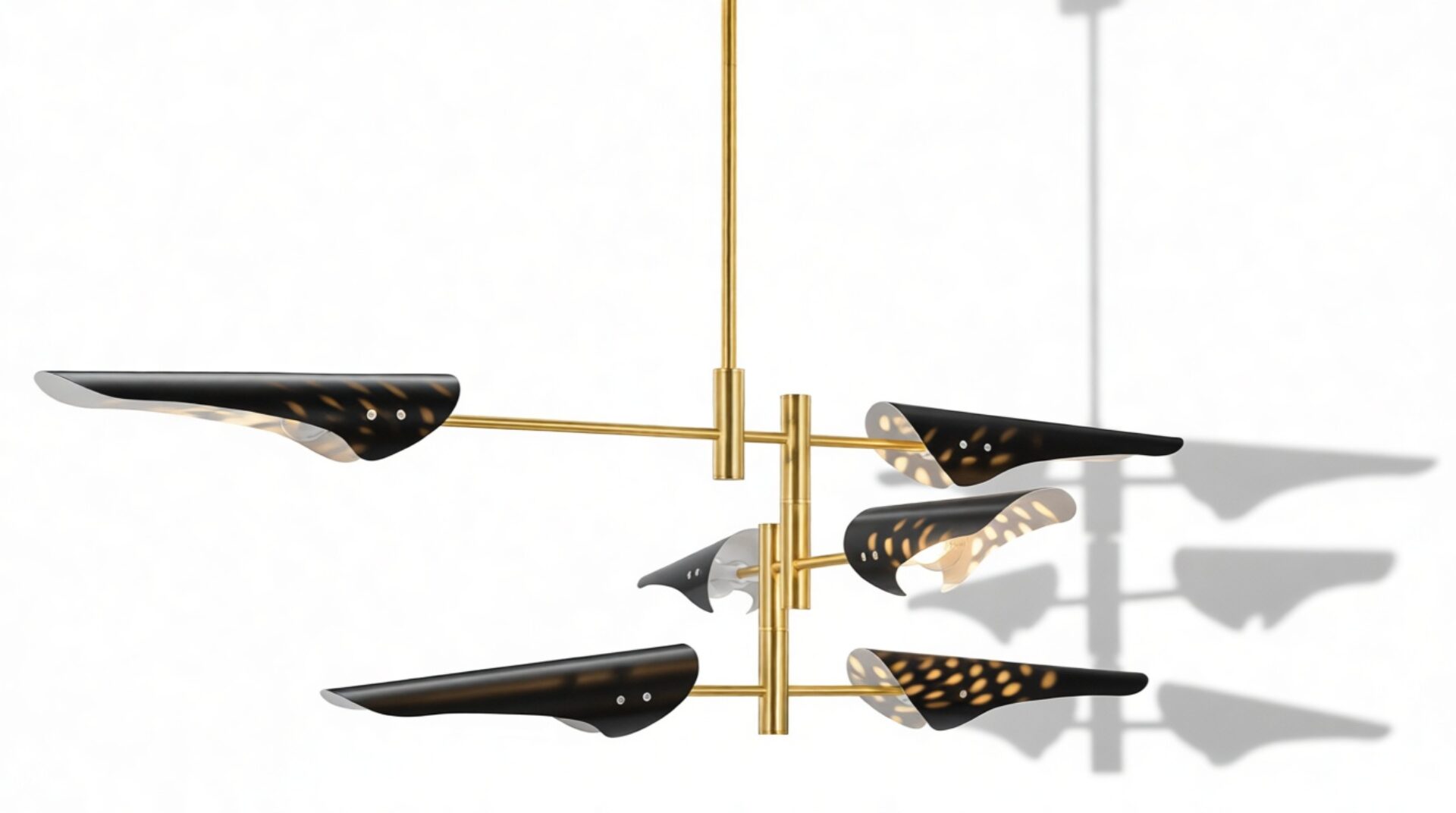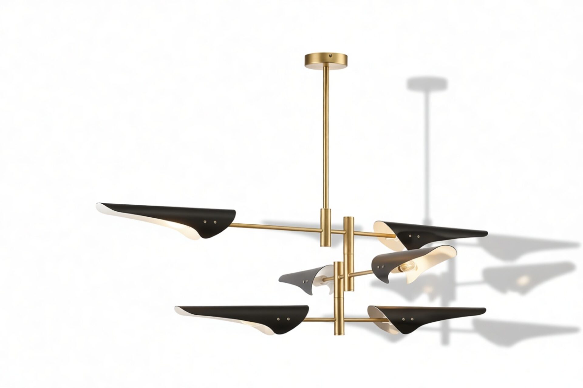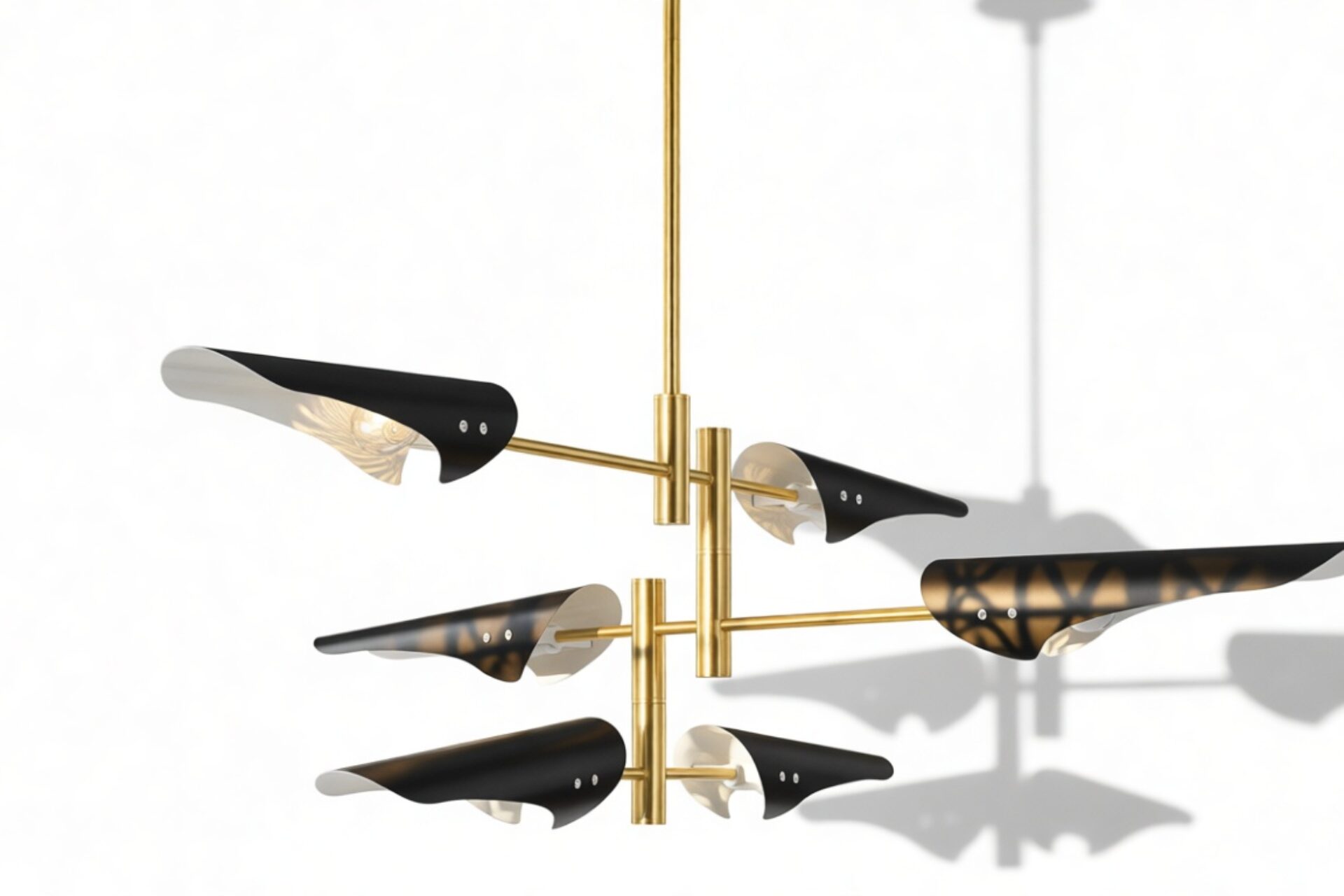 Introducing the Sano Pendant Light, showcasing adjustable brass arms topped with black shades, this fixture exudes timeless elegance. Ideal for both office and living spaces, this piece pays homage to traditional design.
