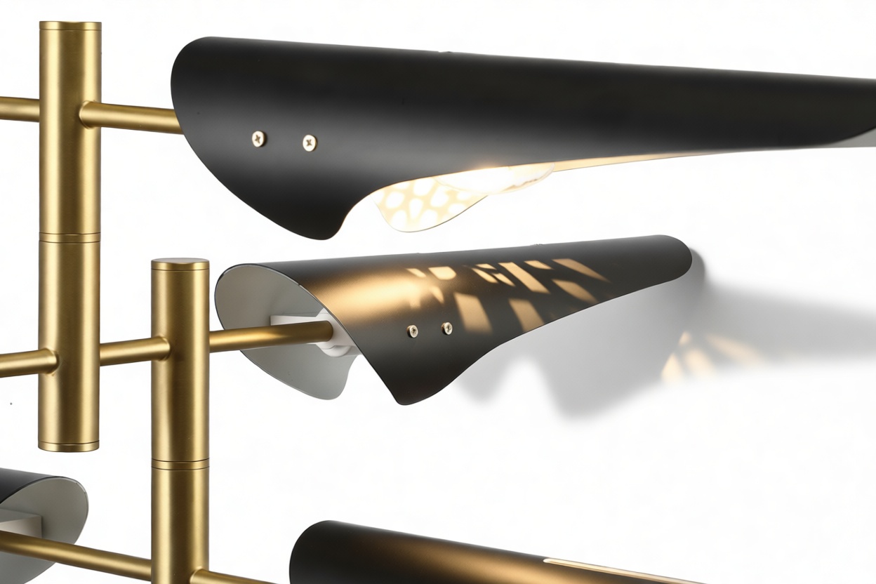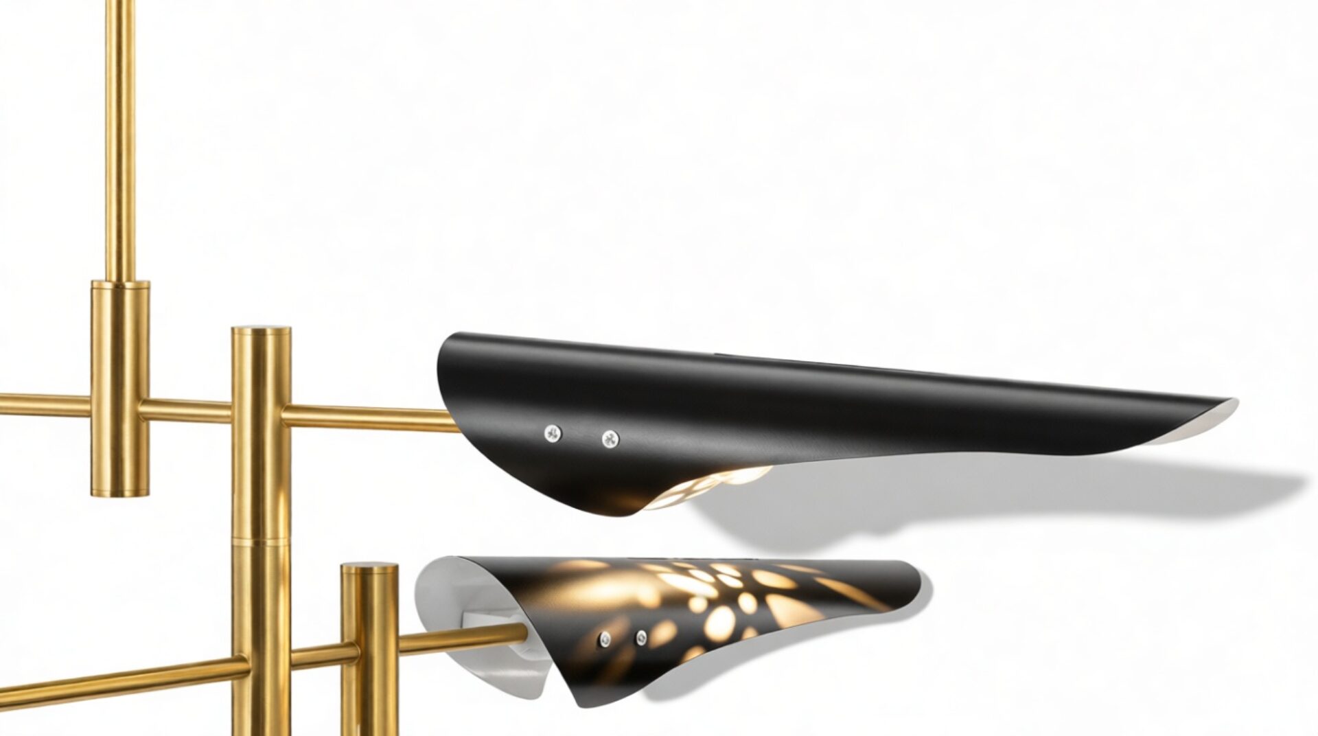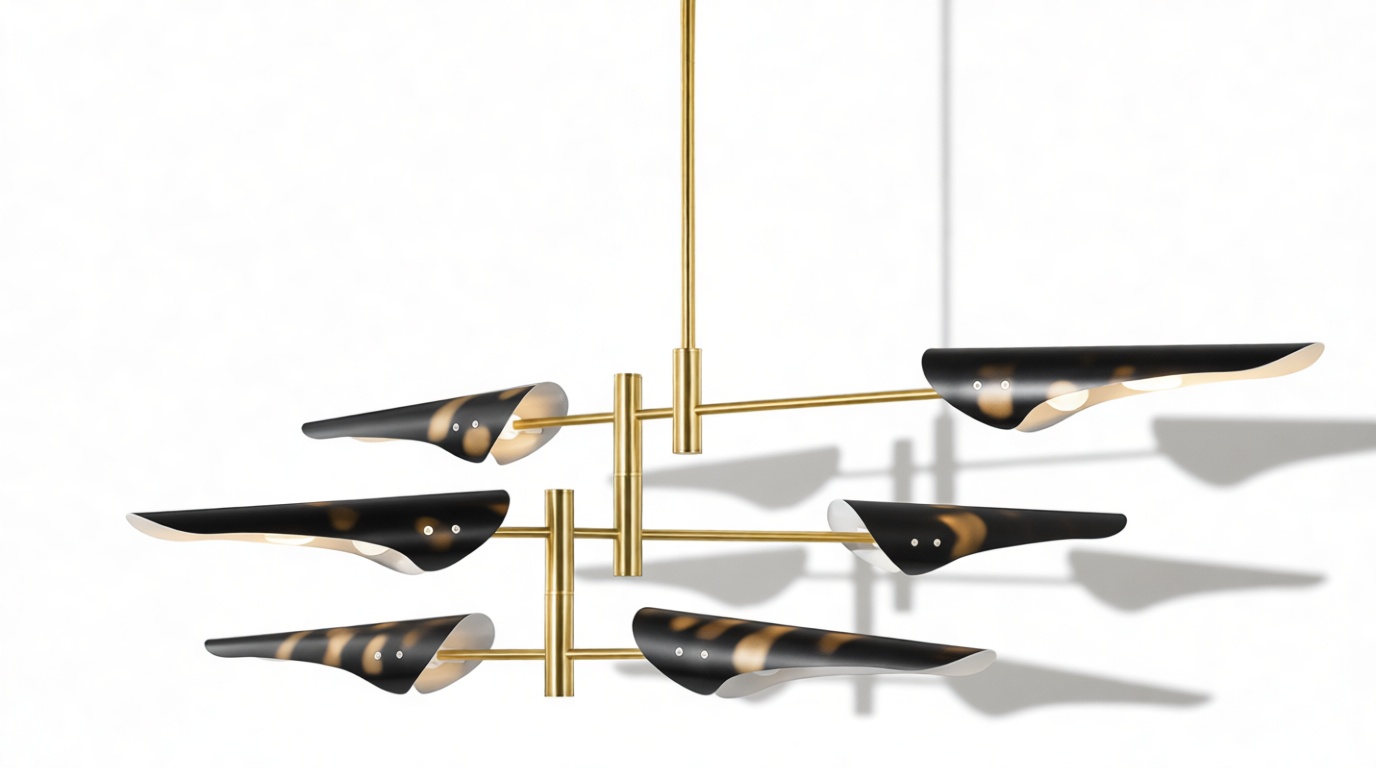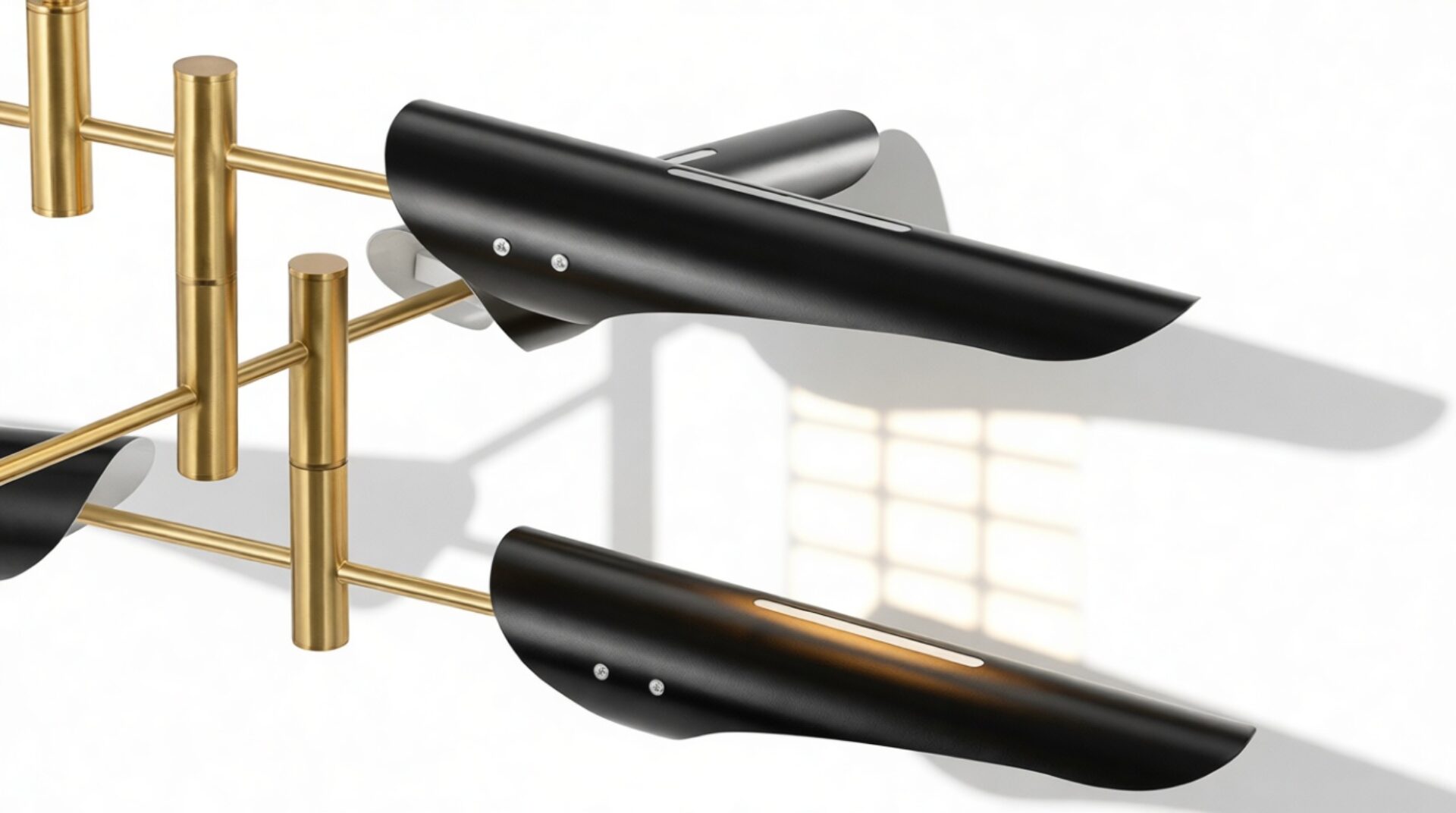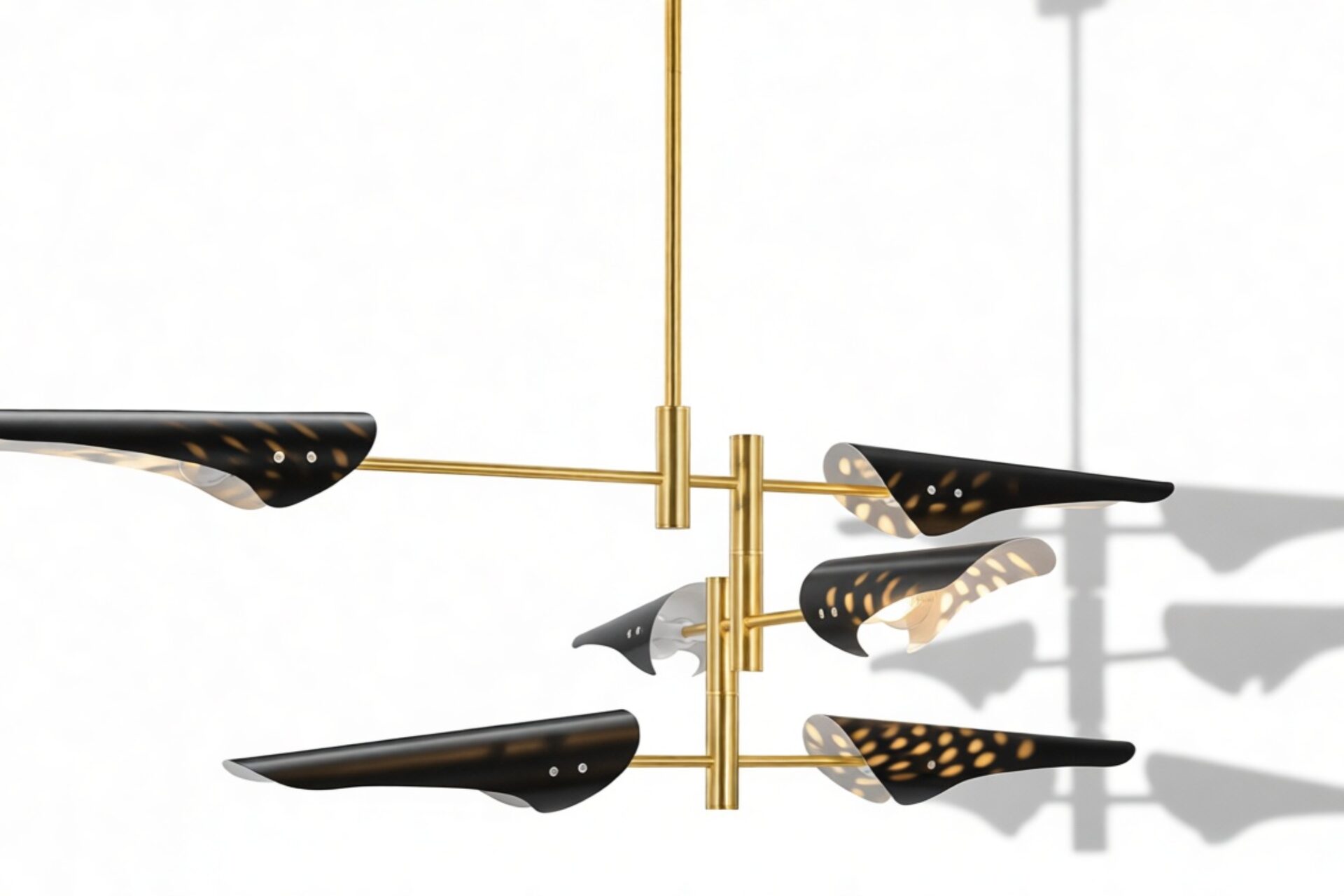 Introducing the Sano Pendant Light, showcasing adjustable brass arms topped with black shades, this fixture exudes timeless elegance. Ideal for both office and living spaces, this piece pays homage to traditional design.