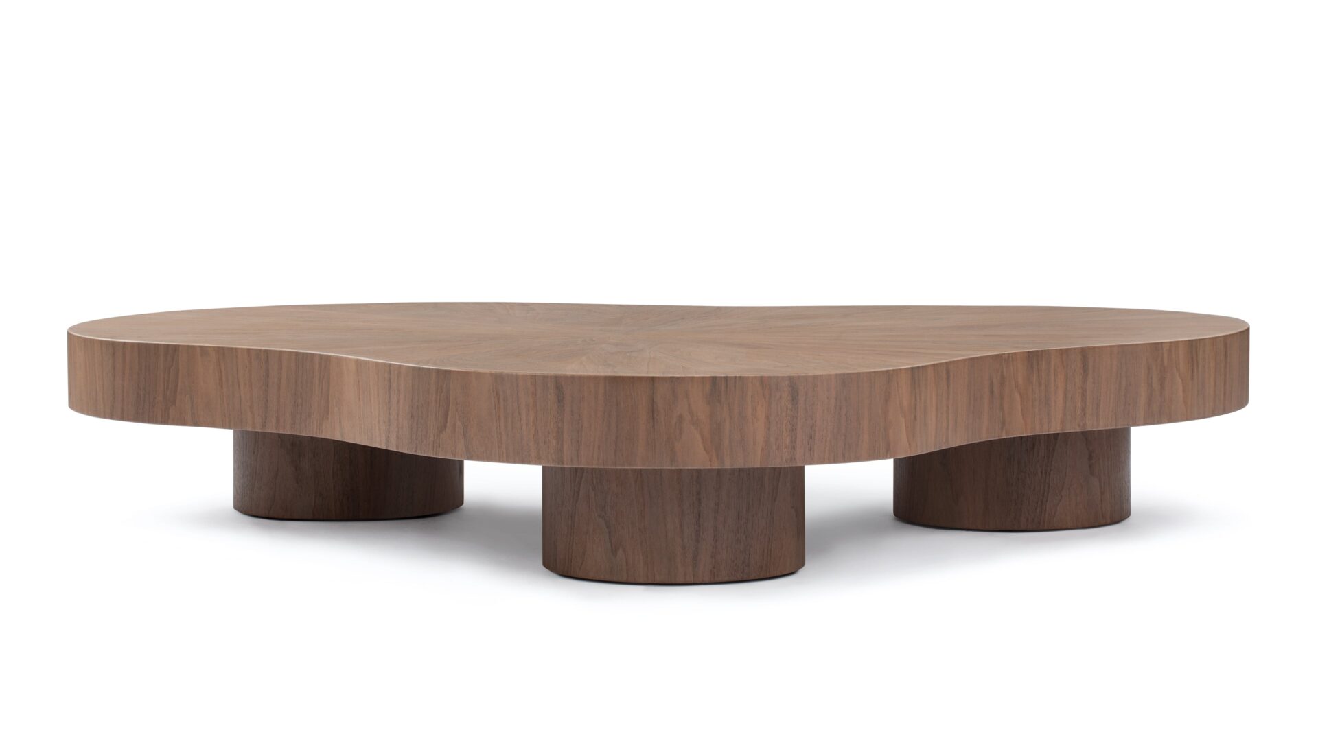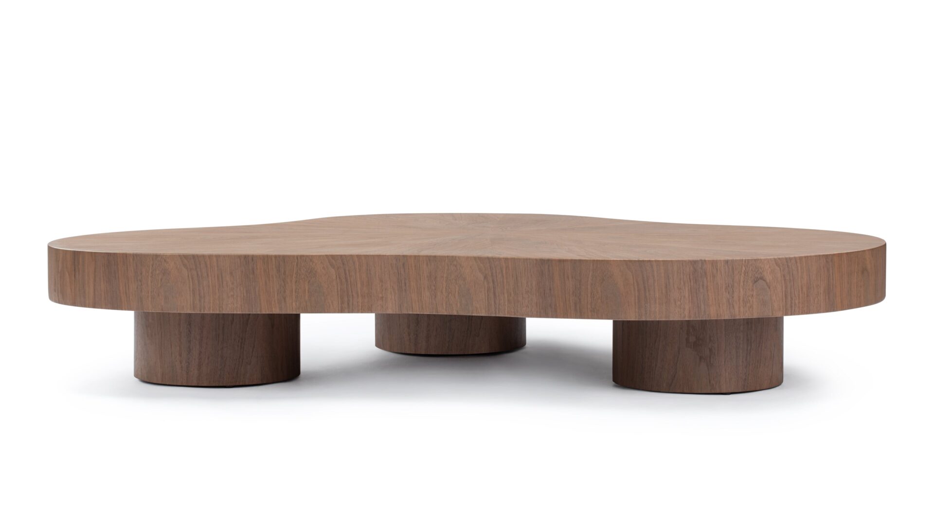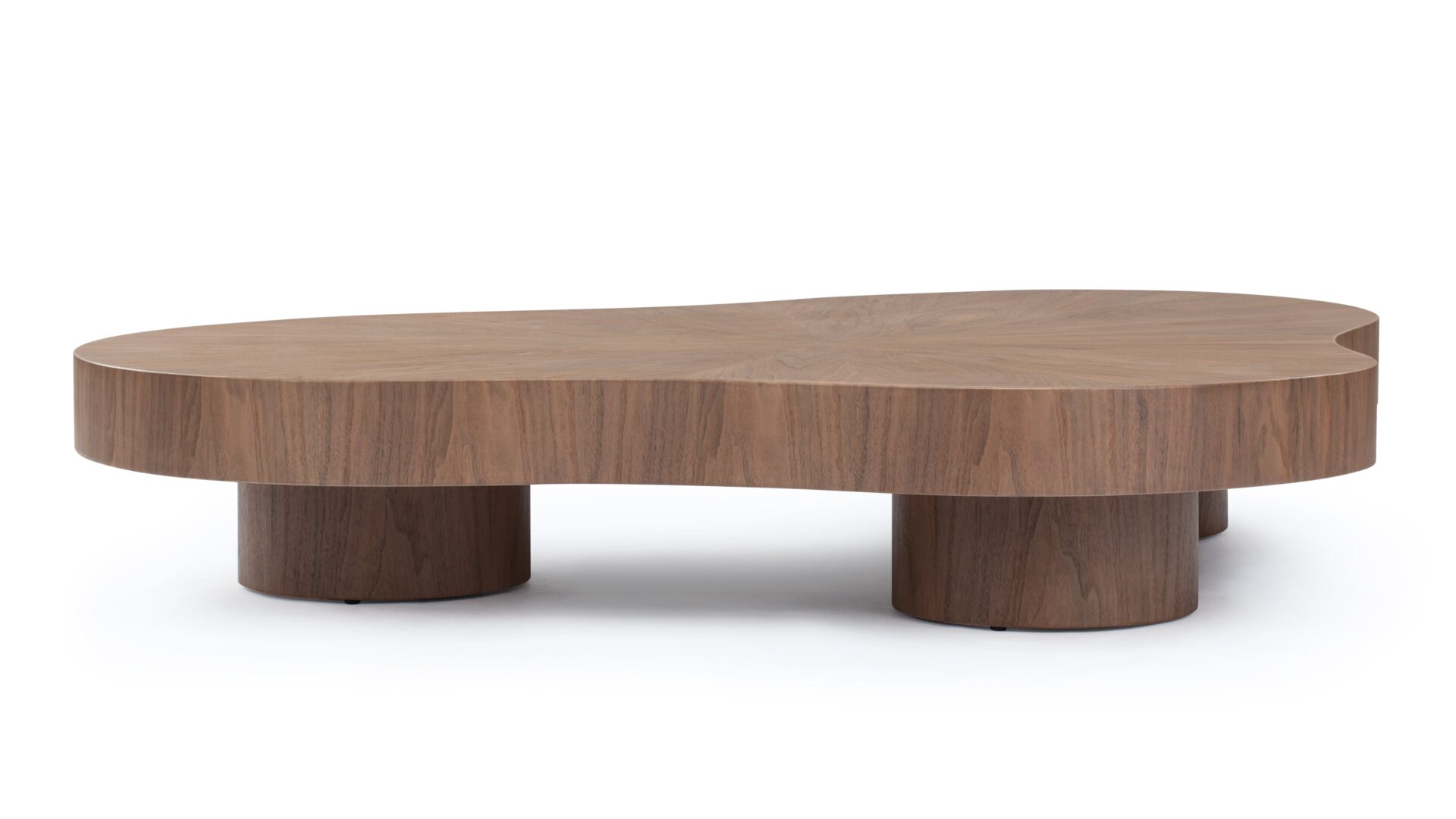 Discover the striking Santo Coffee Table featuring a stylish wavy-shaped tabletop and broad, low legs, crafting a visually captivating furnishing that effortlessly enhances any contemporary space. With its elegant walnut finish and distinctive design, it serves as a sophisticated statement piece for your home.