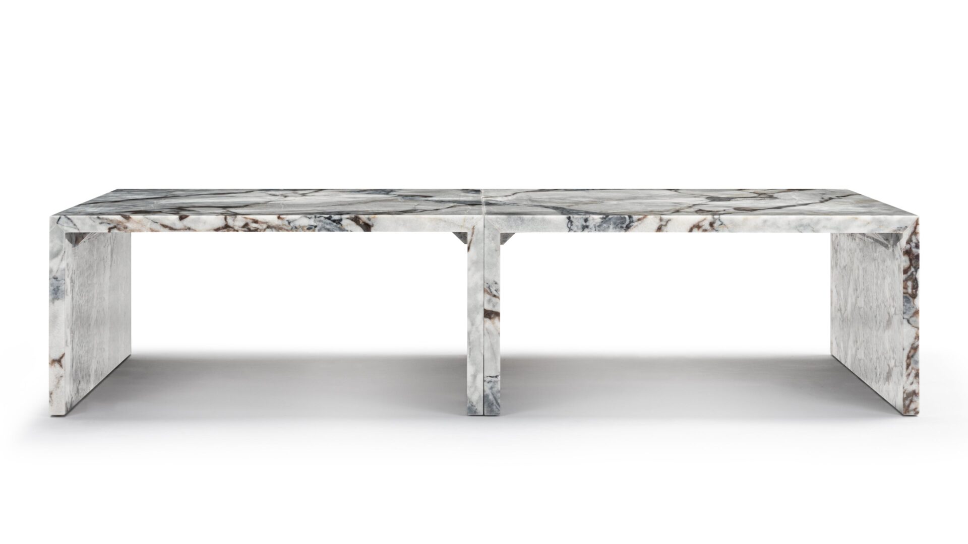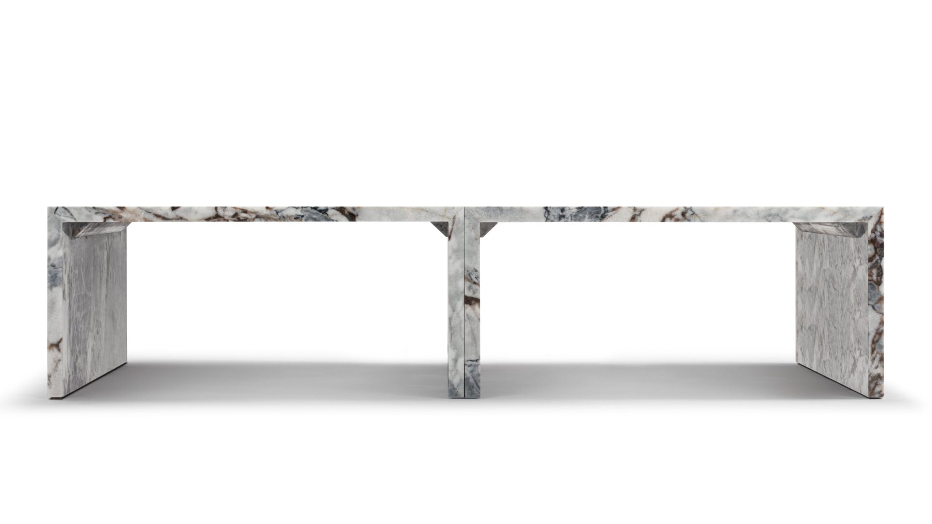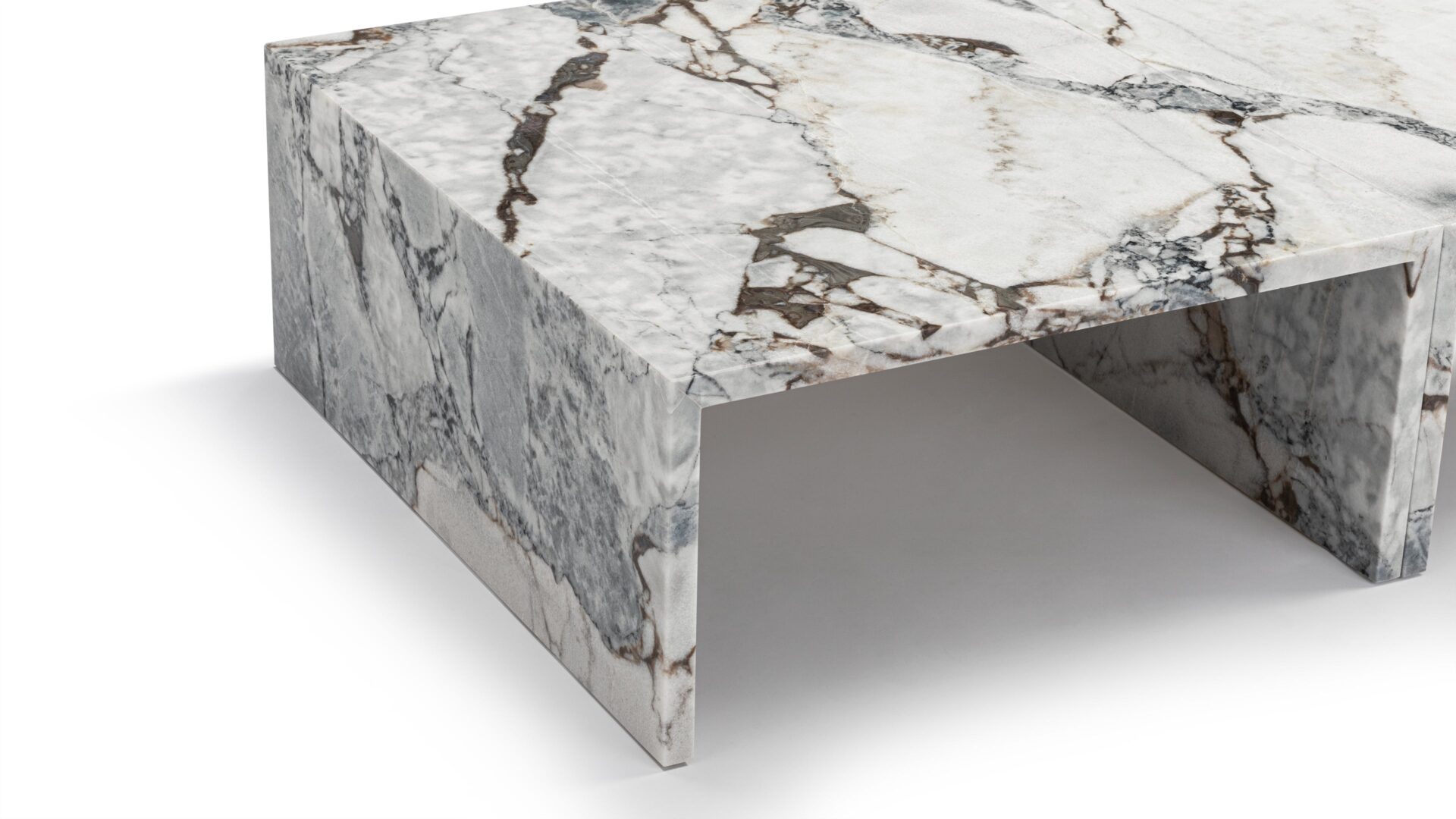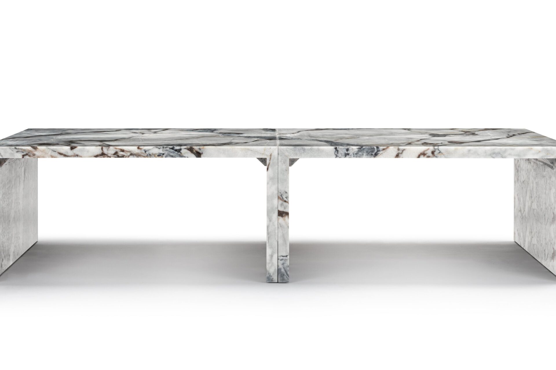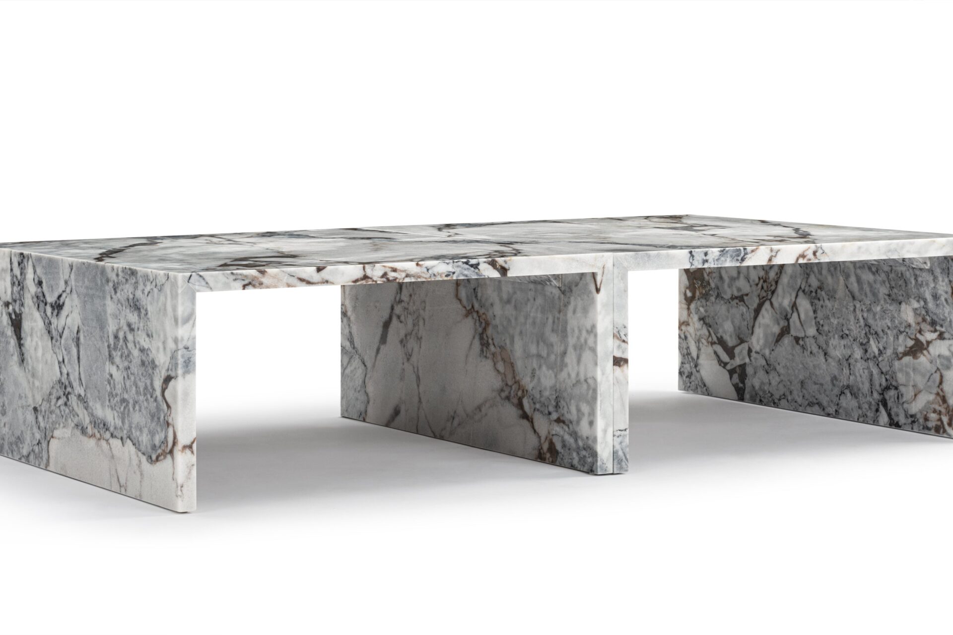 In spite of its generous surface area, the Selena Coffee Table radiates an airy and sophisticated aura. This visual lightness is accomplished through its intricately crafted silhouette. The slim marble slabs are expertly arranged to form a framework that exudes both fragility and robustness.