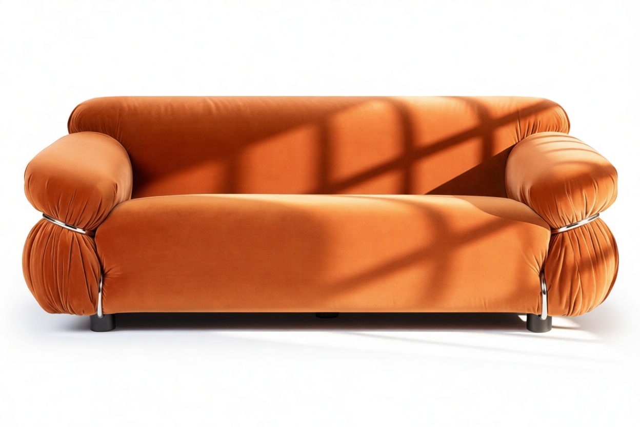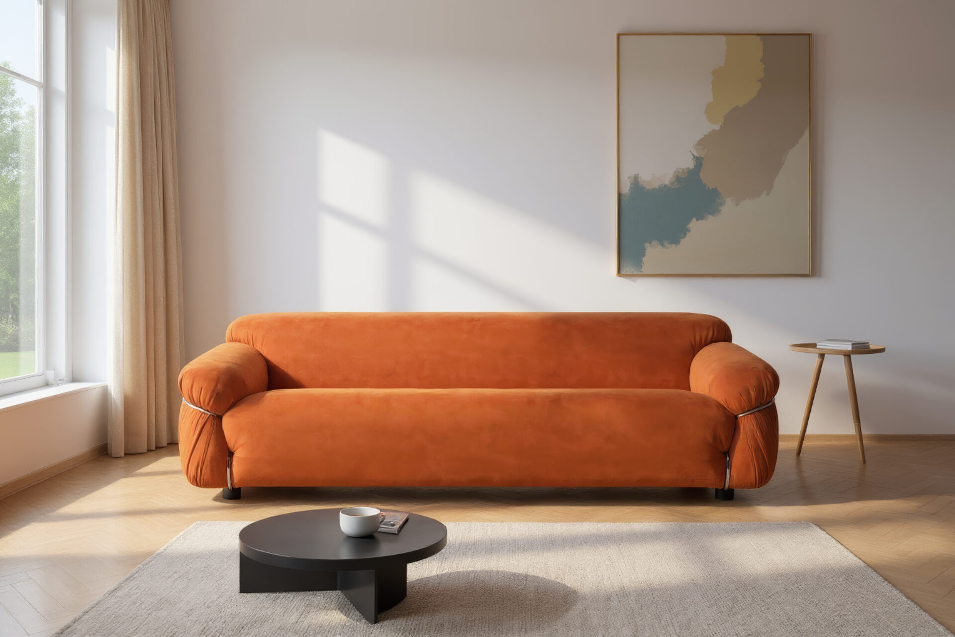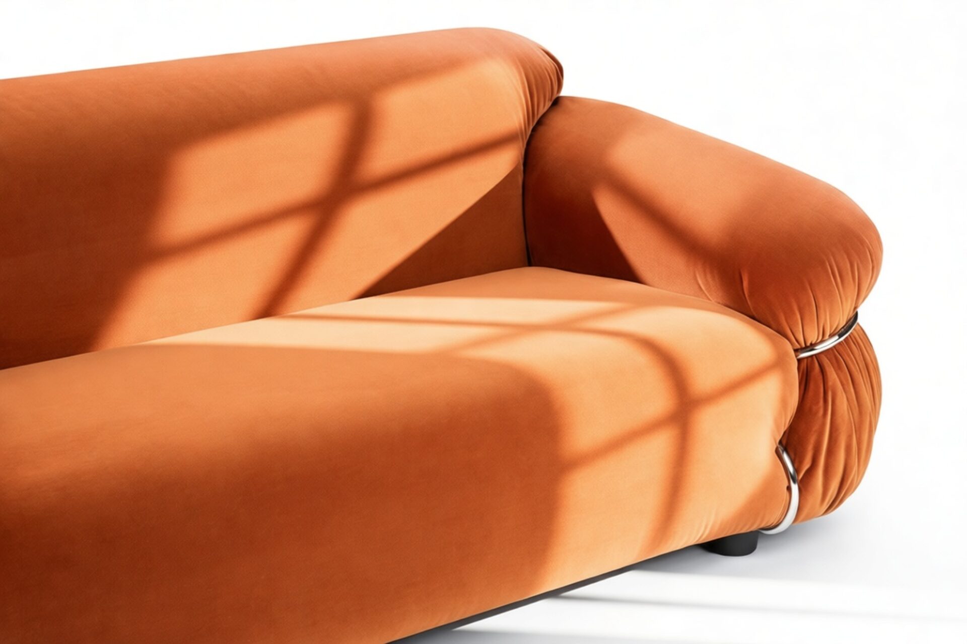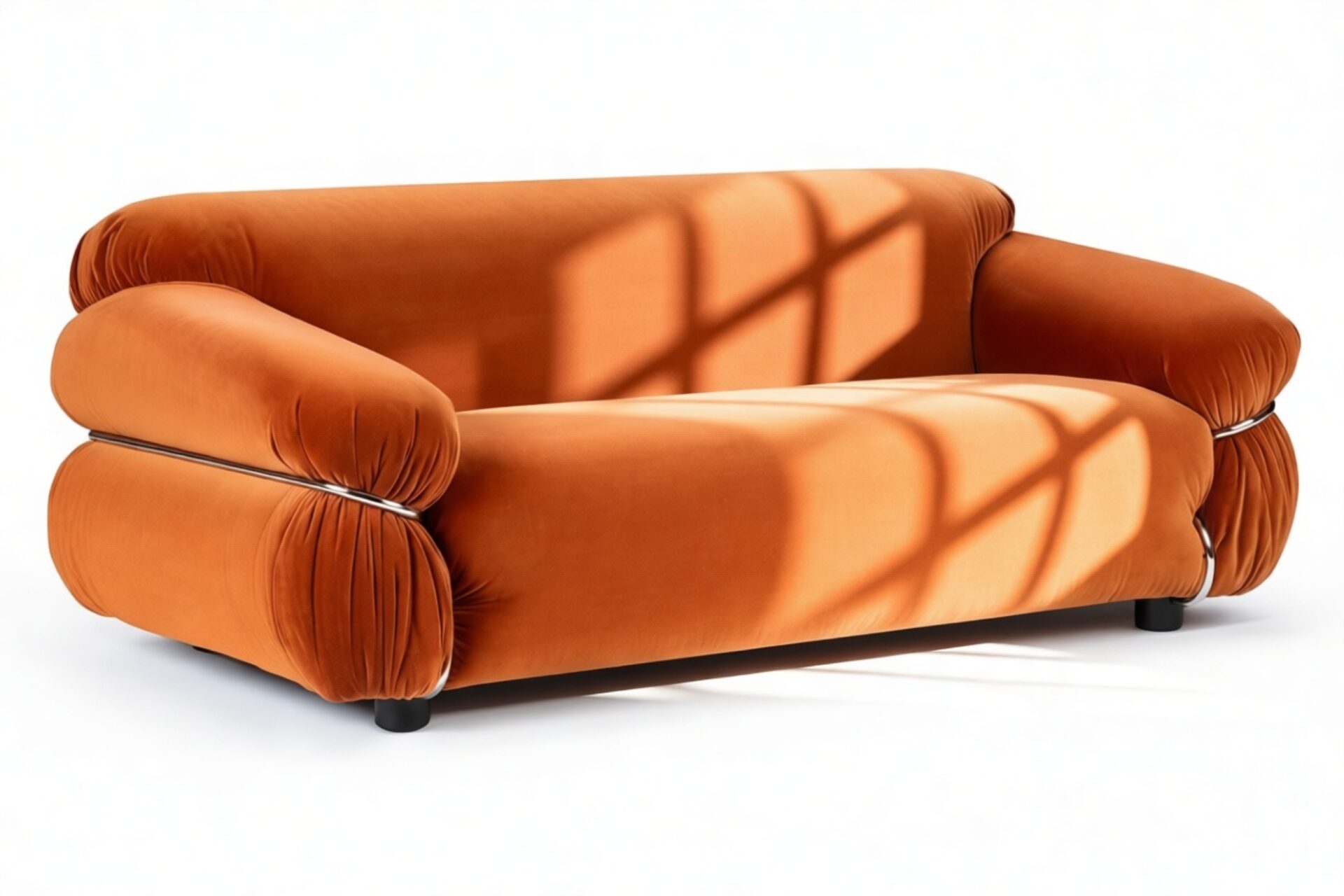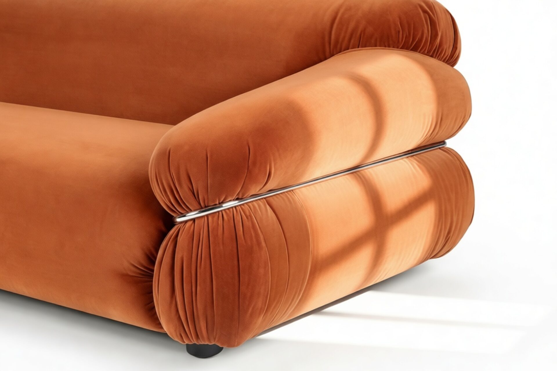 Elevate any space with the timeless elegance of the Sesann Sofa in Apricot Velvet. This iconic mid-century masterpiece combines artistry and comfort flawlessly. Crafted with precision, it boasts a sculptural design, elegant lines, and sumptuous cushions in luxurious apricot velvet, creating a captivating centerpiece that exudes sophistication and allure in any room.