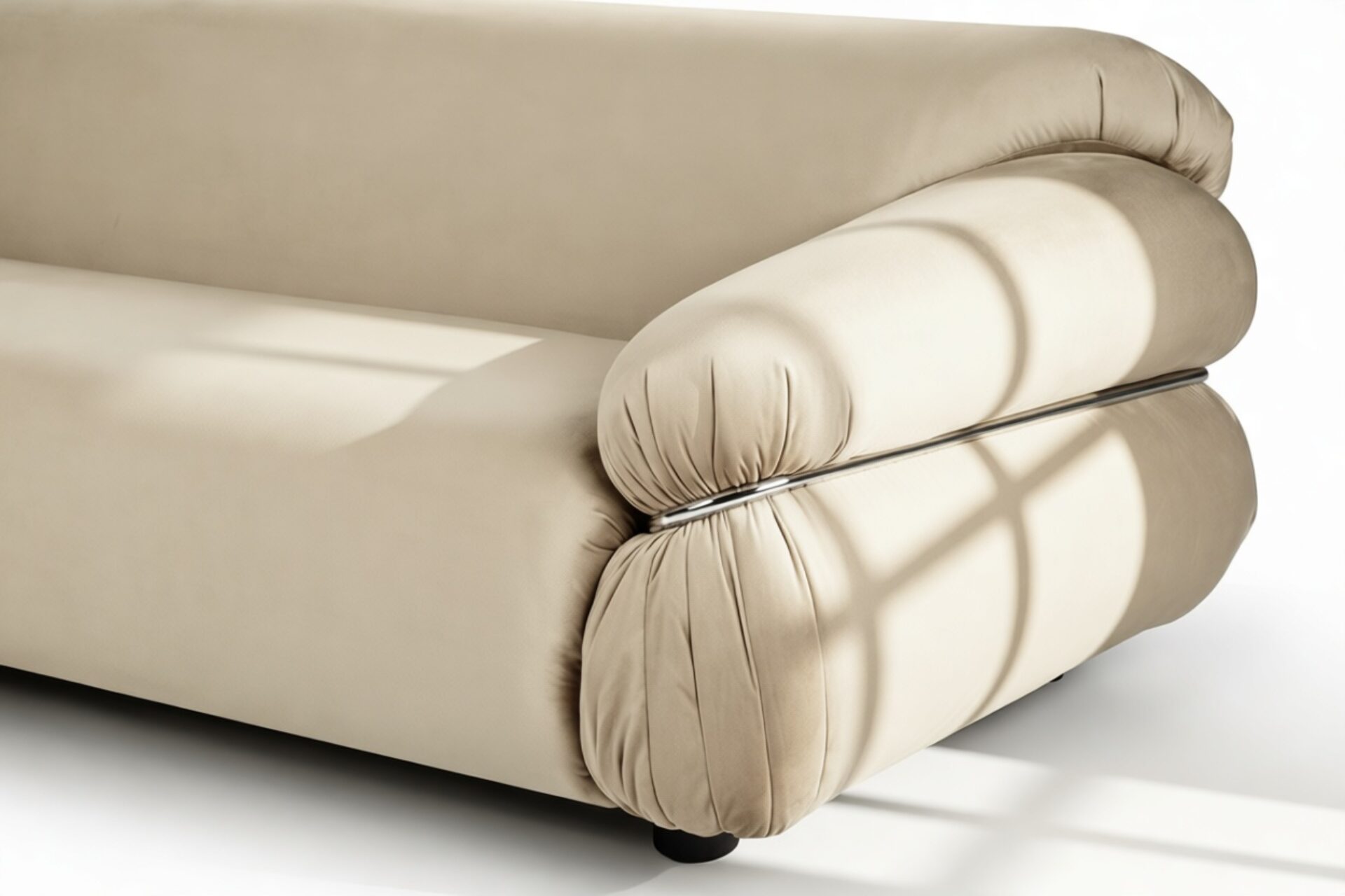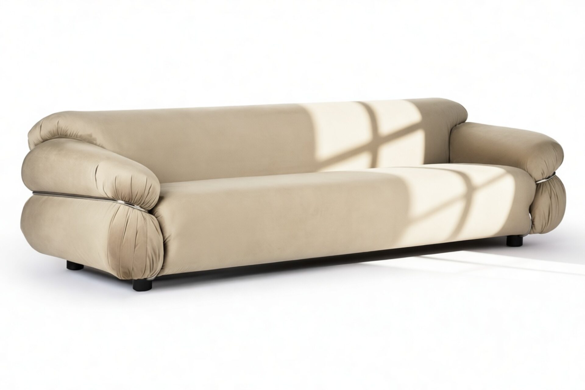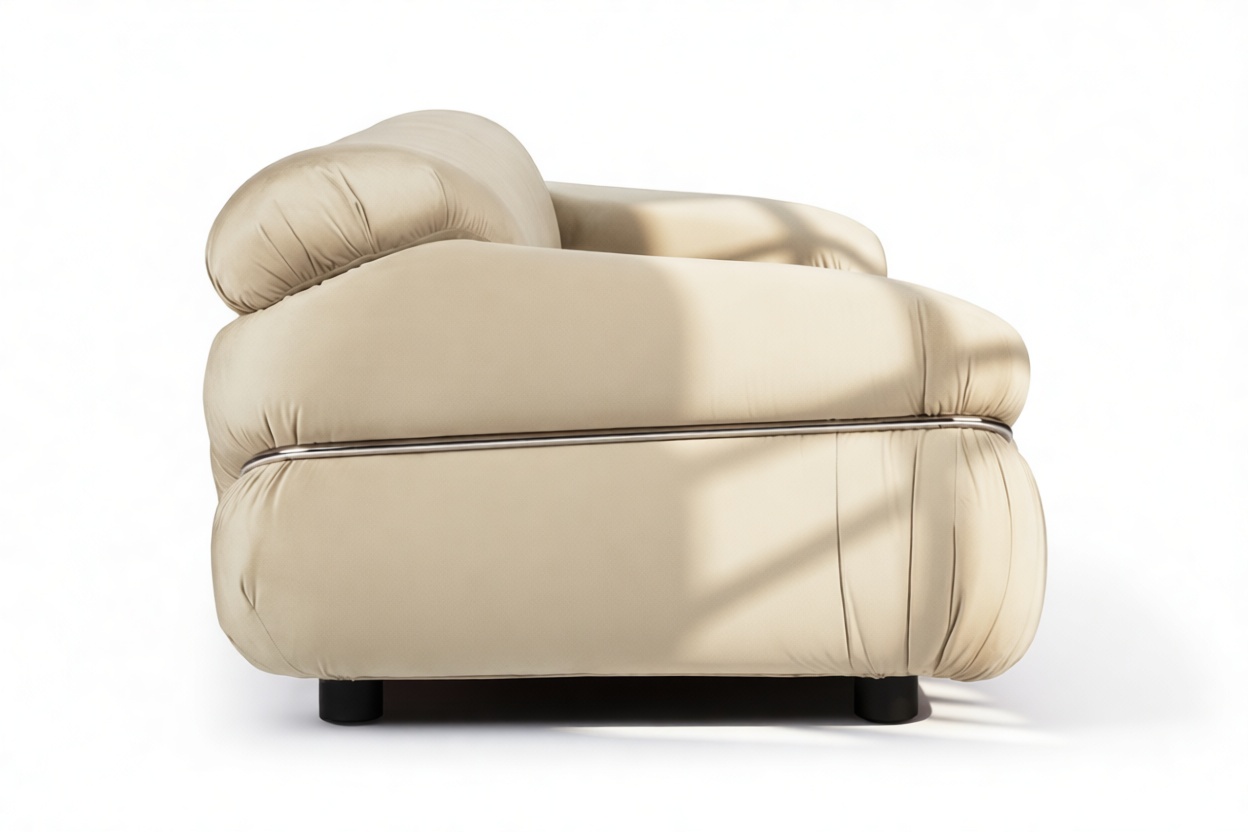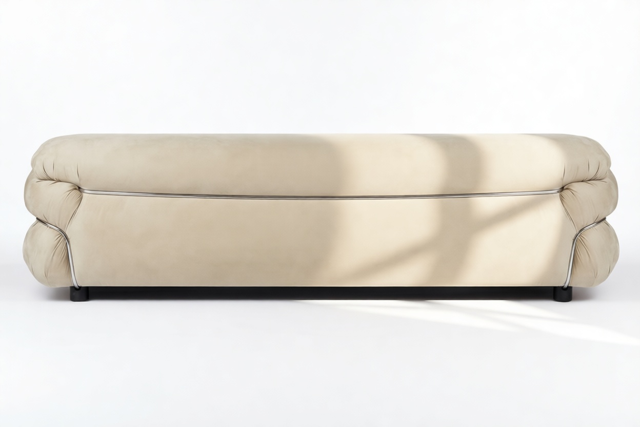 Elevate any space with the iconic Sesann Sofa in Eggshell Vegan Suede, a masterpiece blending mid-century modern aesthetics with timeless elegance. With sculptural design and elegant lines, this sofa exudes refined artistry, establishing itself as a captivating centerpiece, seamlessly merging architectural beauty, comfort, and craftsmanship. Immerse yourself in luxury and indulge in unparalleled style and refinement.