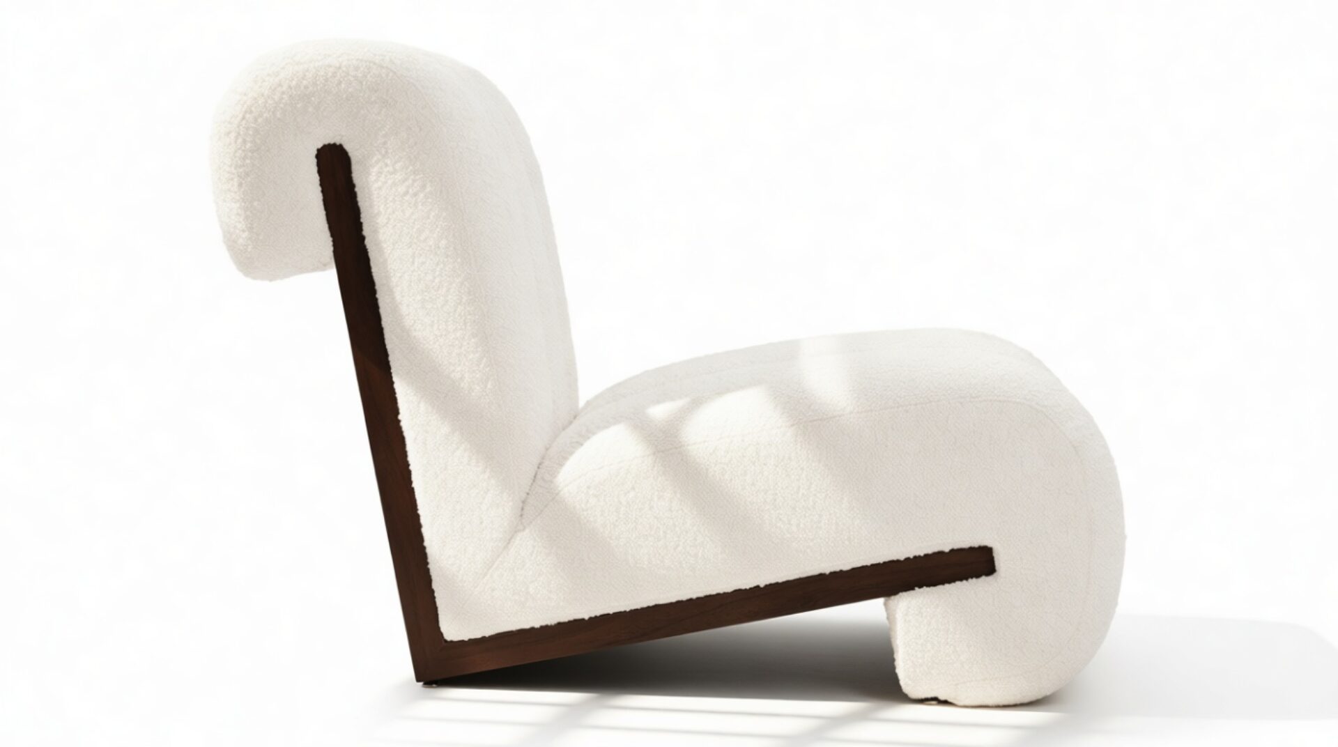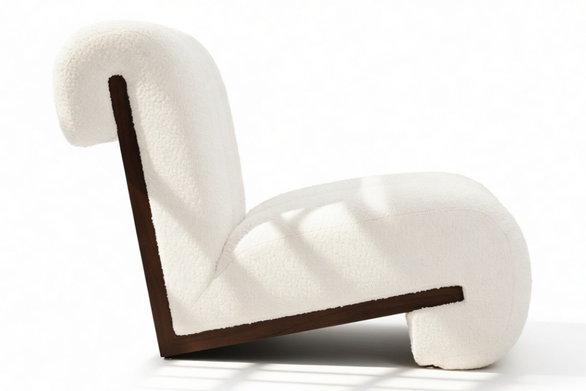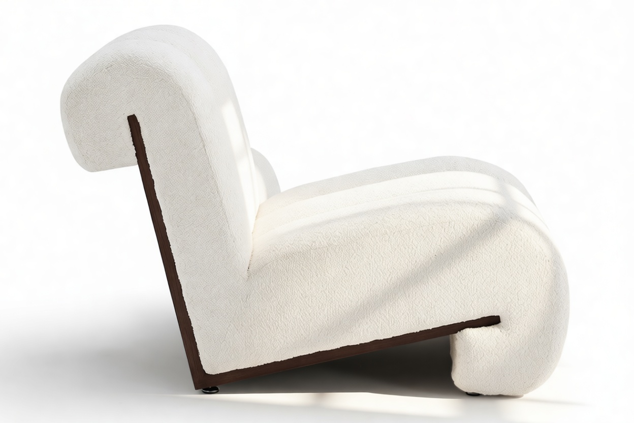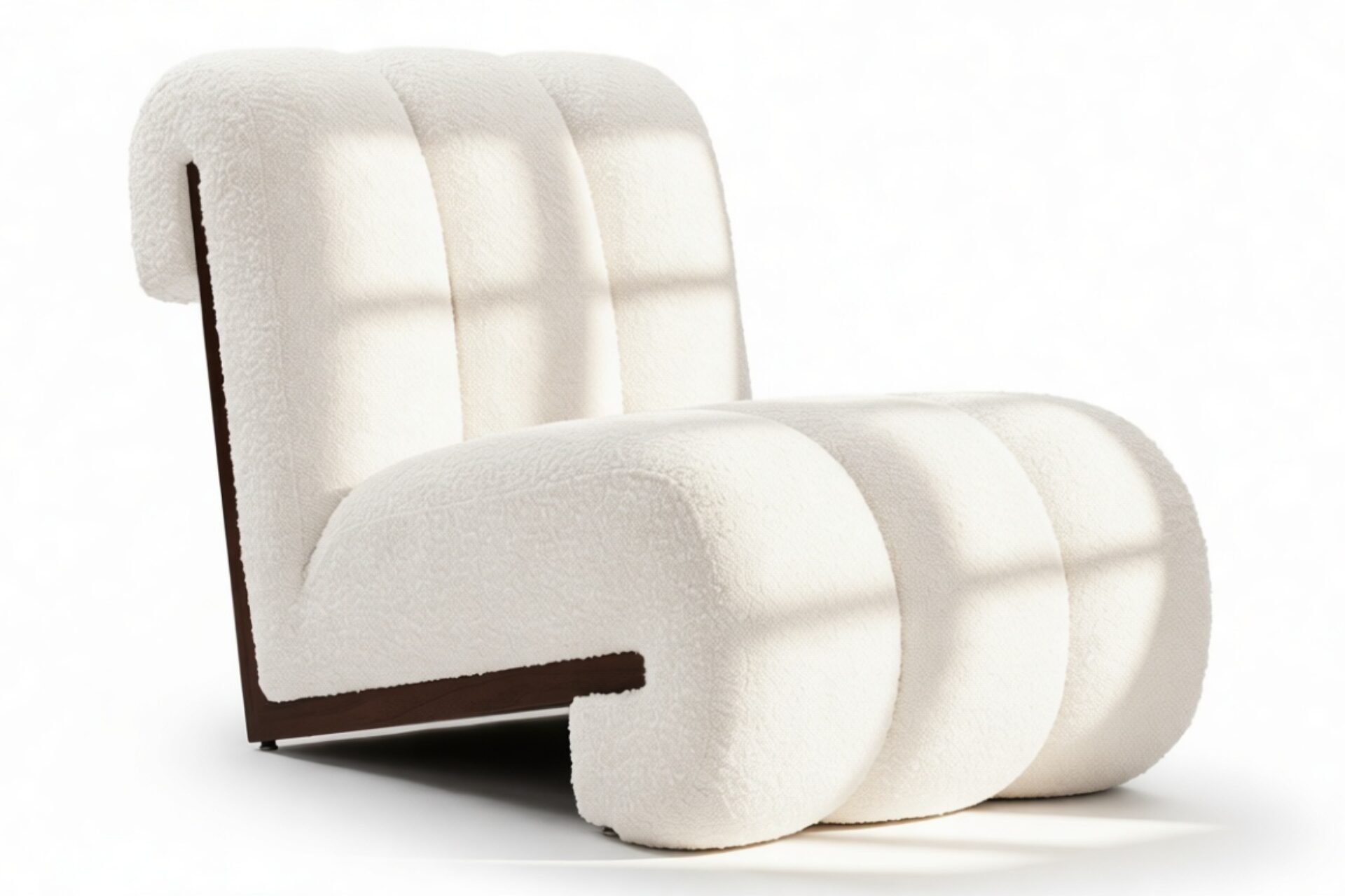 Unveil the captivating allure of the Siena Lounge Chair. Luxuriate in its sophisticated design featuring three sumptuously padded channels gracefully curving around a stunning walnut frame. This armless, contemporary piece not only captivates visually but also offers ample seating. Experience sumptuous relaxation as the dense tufted boucle fabric contrasts elegantly with the dark walnut frame for a modern and luxurious touch. Perfect for social spaces or as a statement piece, this chair exudes both style and comfort.