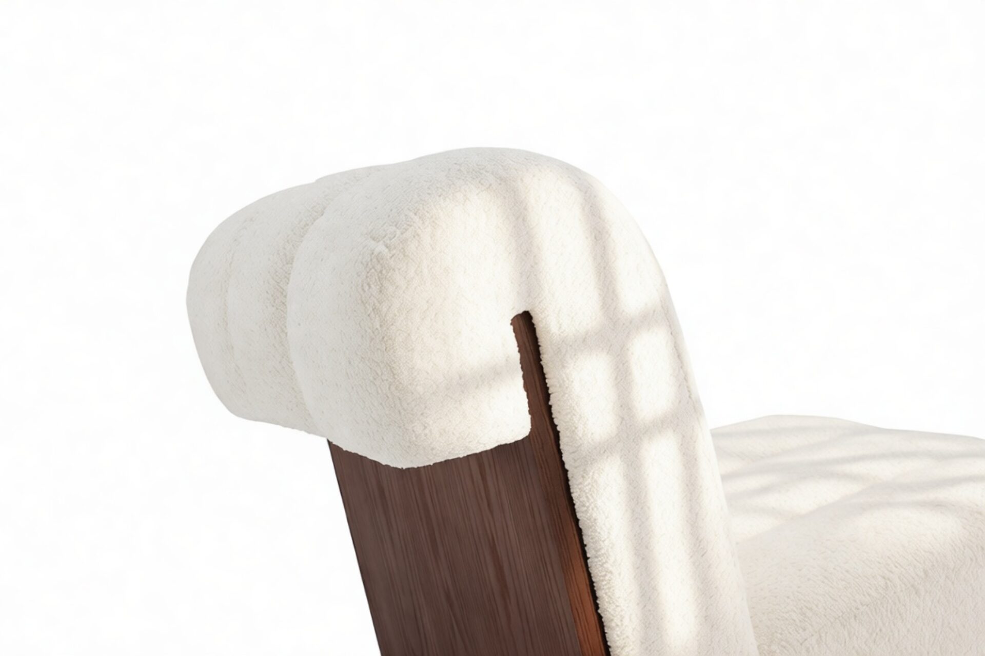 Indulge in the Siena Lounge Chair, showcasing a light-colored boucle upholstery adorned with dense tufting for a sumptuously comfortable experience. The chair's pale fabric stands out against its dark walnut frame, exuding an elegant and refined aesthetic. Its gracefully curved edges and ribbed profile, comprised of three channels of softly padded upholstery, deliver a visually appealing look coupled with ample seating comfort.