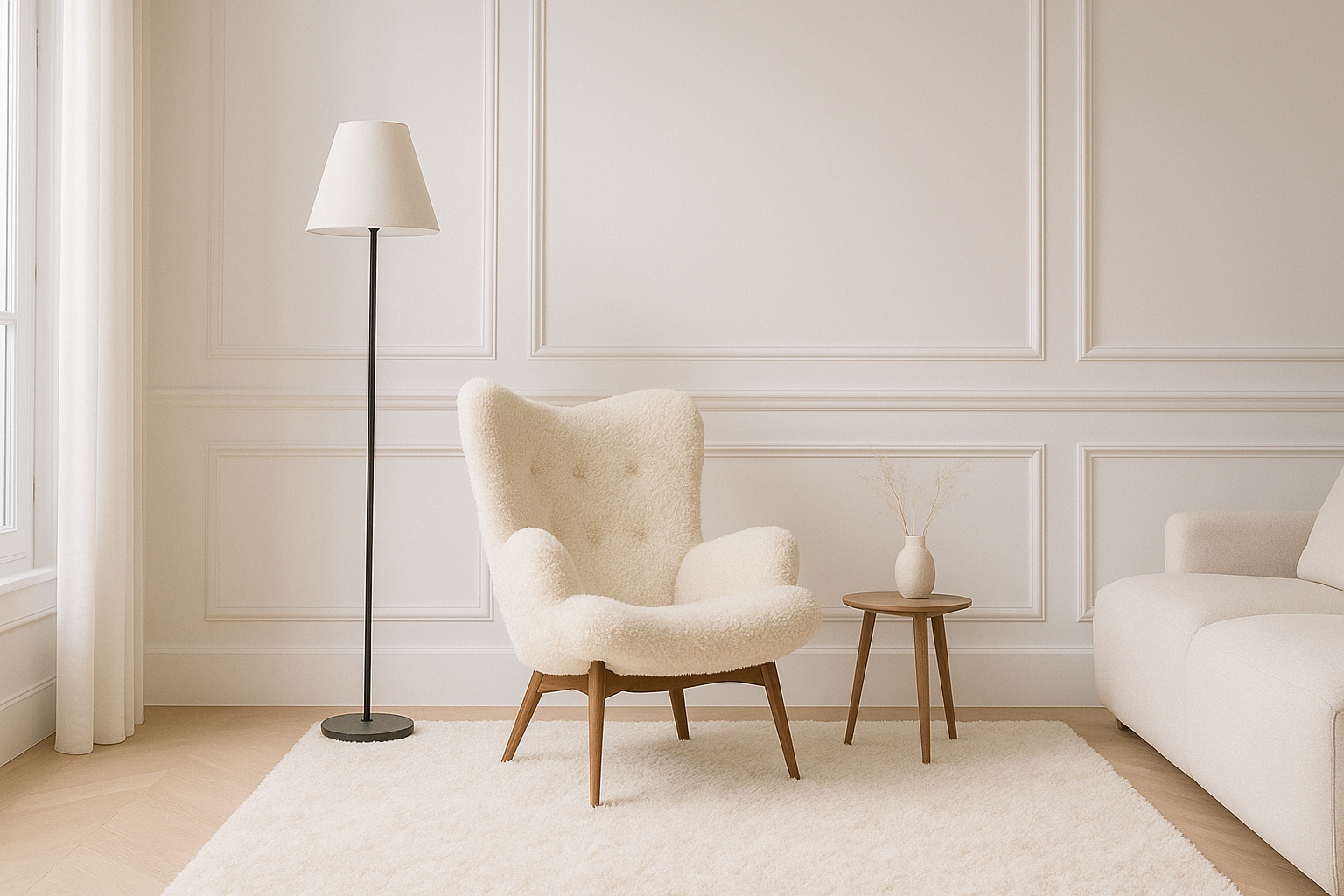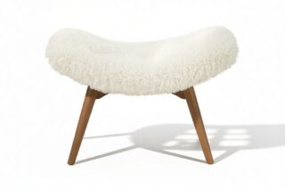 Indulge in the luxurious comfort of the Silhouet Armchair, adorned with faux fur upholstery that is plush and inviting to sink into. Available in a calming cream hue, this armchair is beautifully accented by the rich wood finish of its legs. Its aesthetic features a gently curved backrest and arms for a perfect balance of coziness and sophistication.