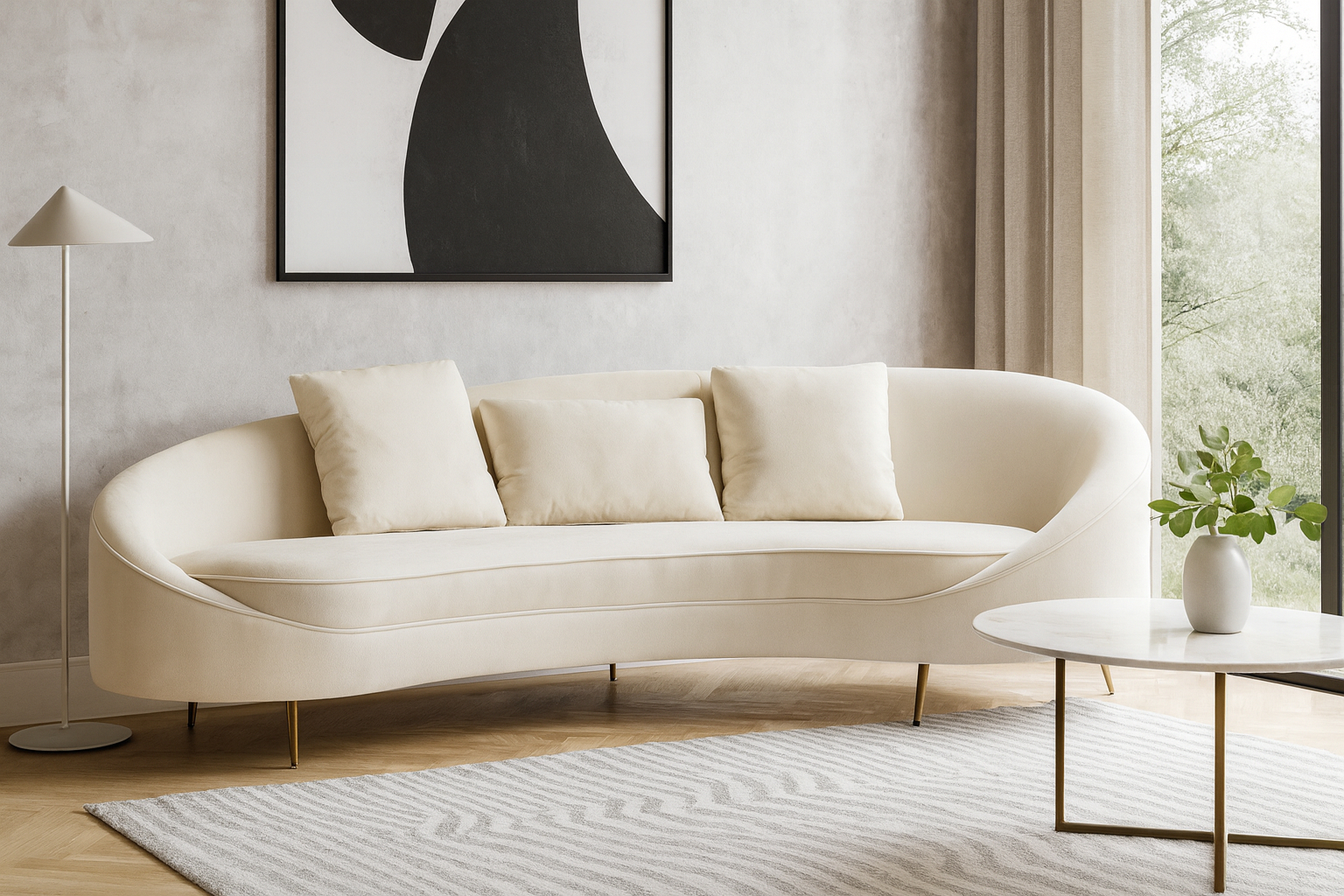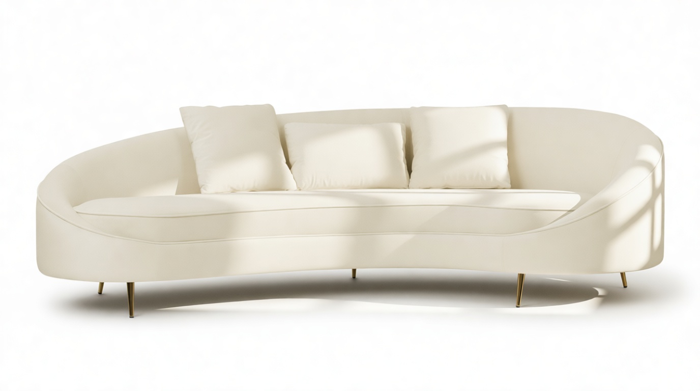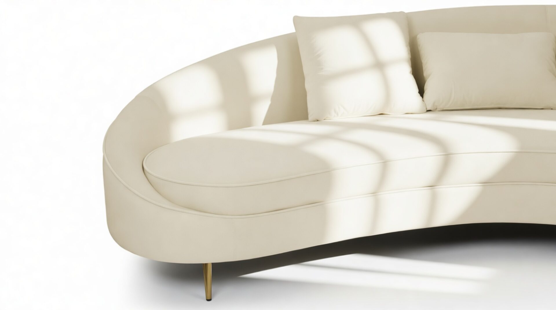 Indulge in sublime sophistication with the Sofia Sofa, featuring easy-care velvet upholstery in a cozy, neutral cream hue. This modern sofa showcases a unique asymmetric curved silhouette, accentuated by expert upholstery and piping detail, all perched on chic, brass-finished tapered legs. Crafted for lounging and socializing, the Sofia Sofa includes multiple scatter cushions for customizable comfort whether you're unwinding or conversing. Perfect for contemporary or minimalist decor, the Sofia Sofa delivers a blend of luxe style and relaxation. Enhance your refined living space by pairing it with a complementary colored occasional chair. Its distinctive island shape and contemporary styling will elevate the visual appeal of your home, creating a plush seating choice for yourself and visitors.