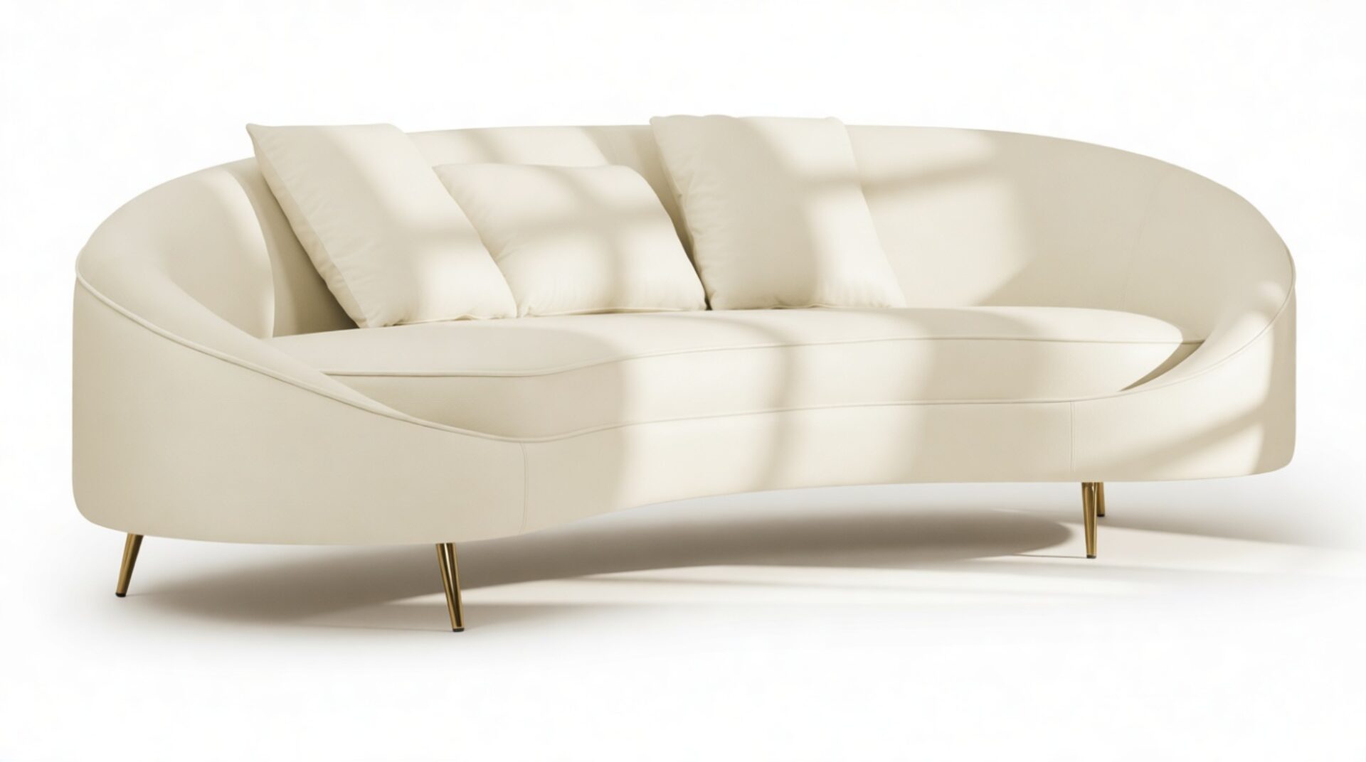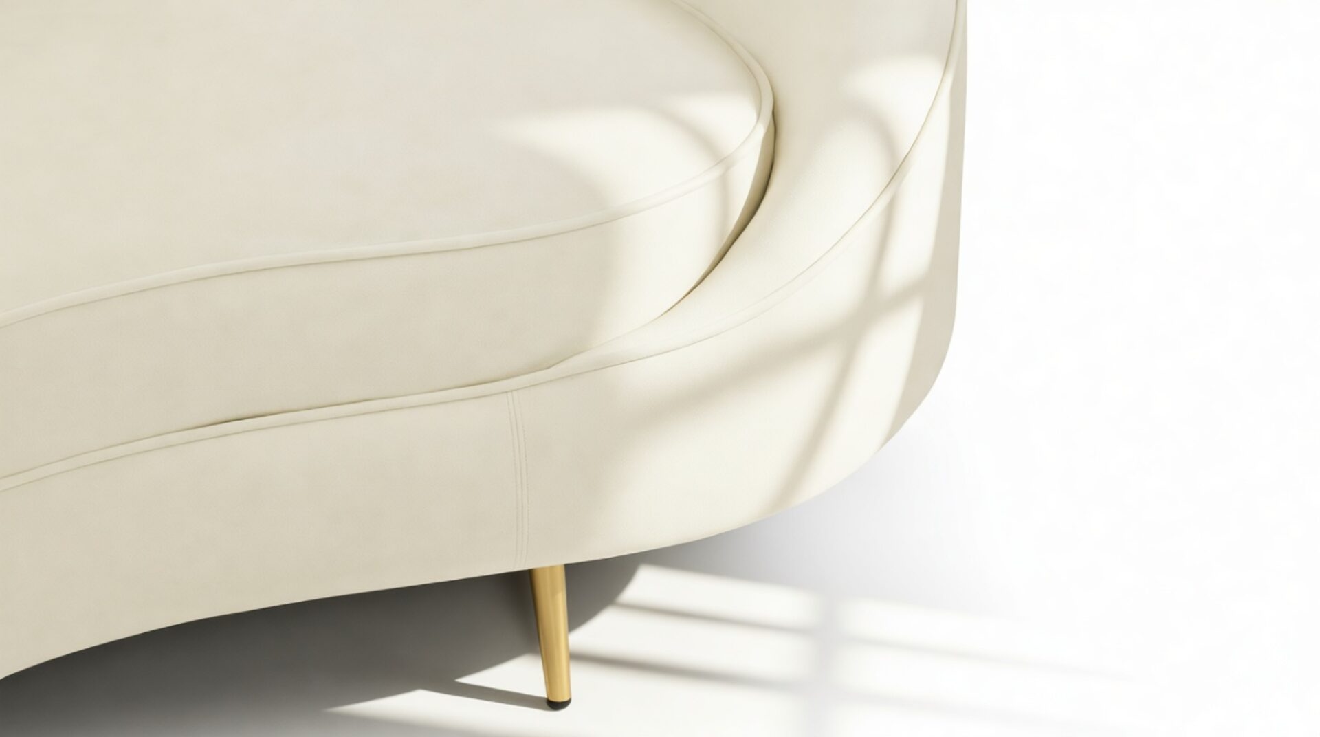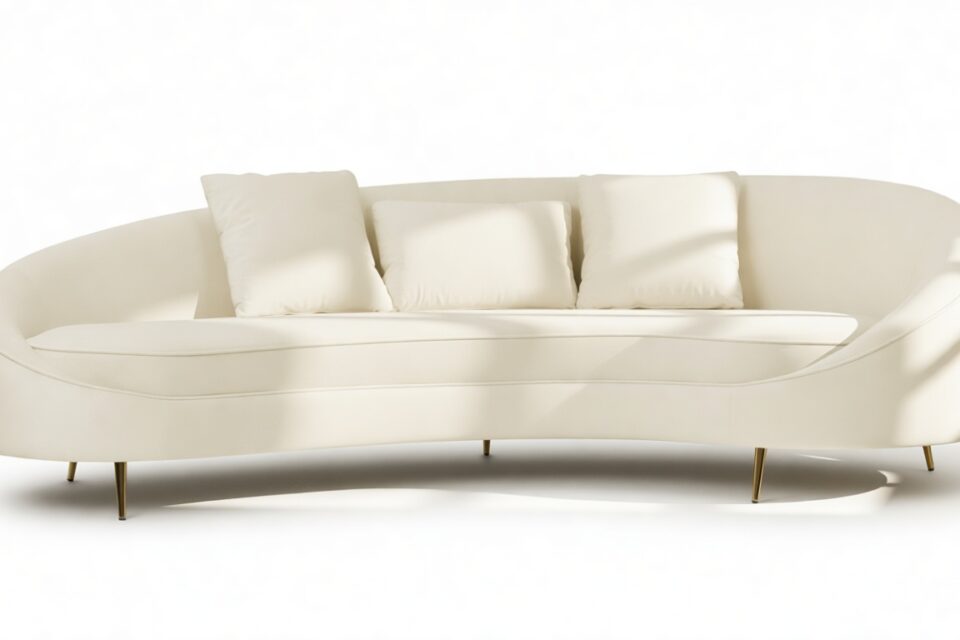 Introducing the Sofia Sofa, showcasing a modern, asymmetric curved design in a versatile cream hue, ideal for contemporary and minimalist decor. Enhancing its elegance are the piping accents and brass-finished tapered feet, elevating the style of any room.