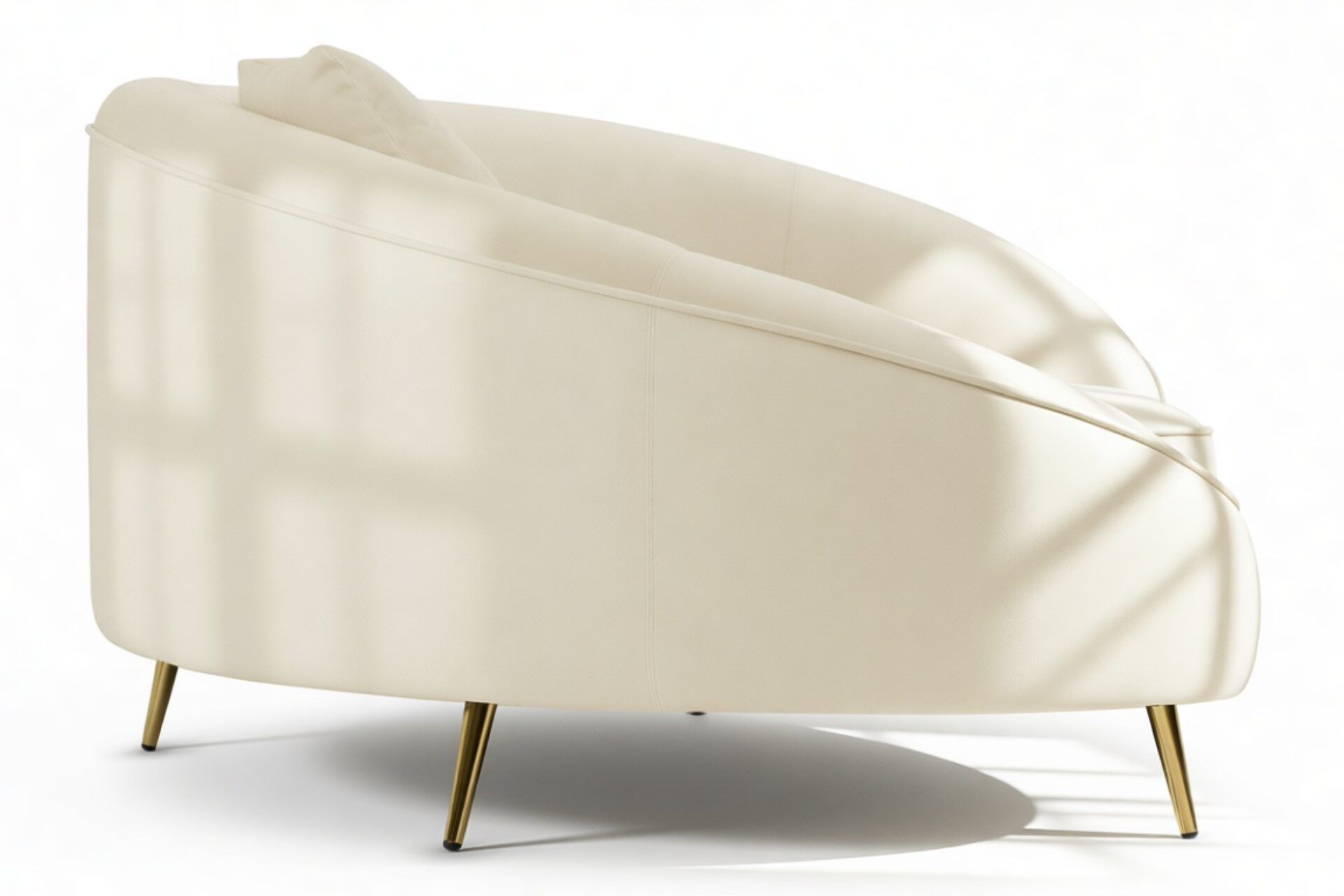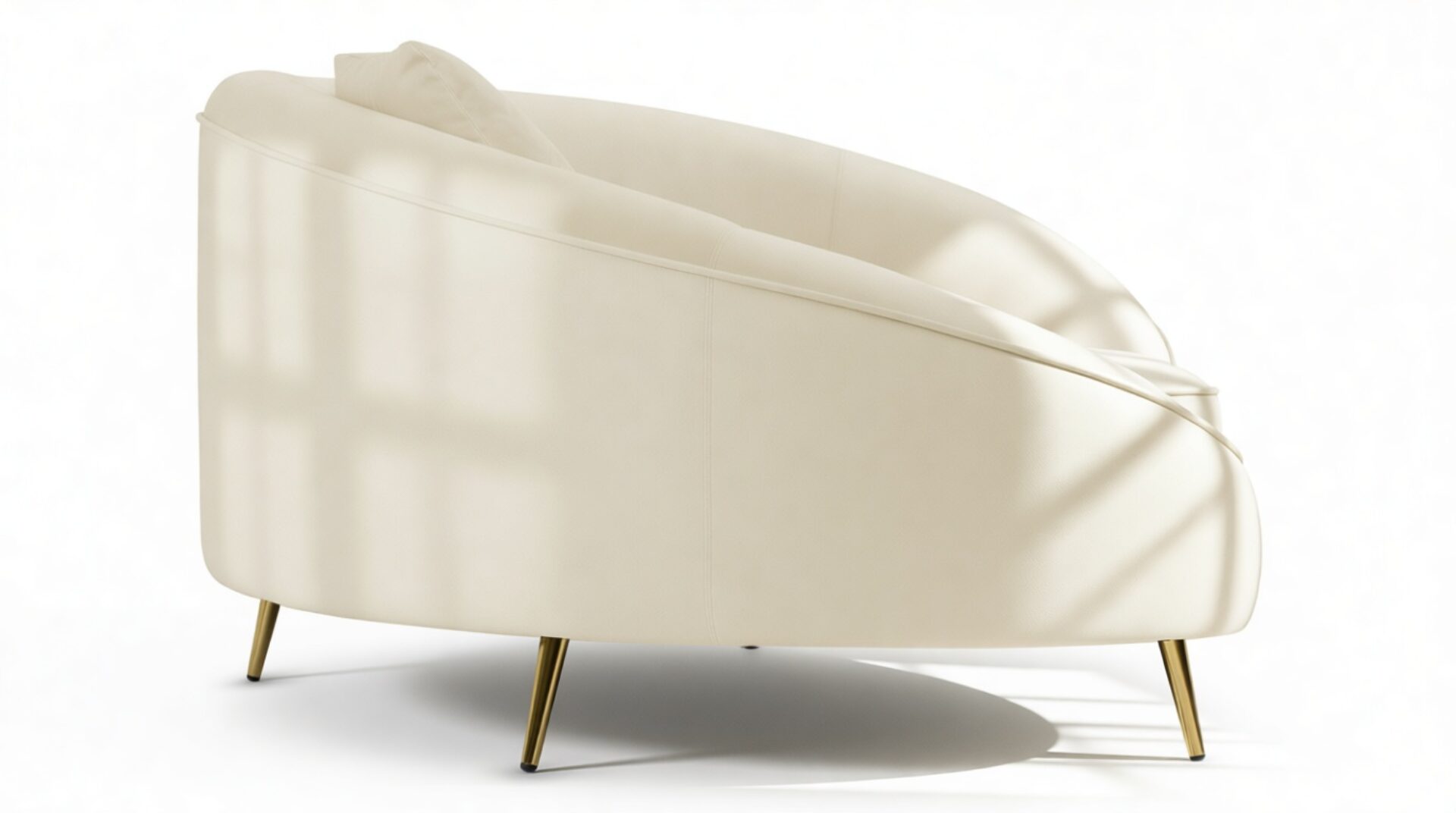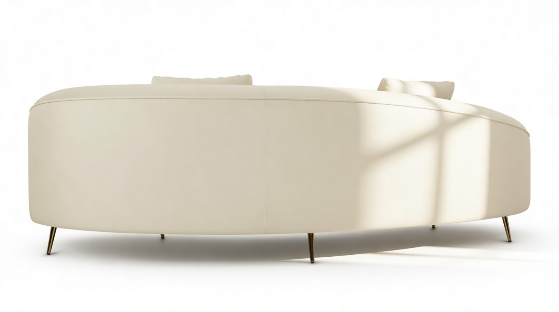Introducing the Sofia Sofa, showcasing a modern, asymmetric curved design in a versatile cream hue, ideal for contemporary and minimalist decor. Enhancing its elegance are the piping accents and brass-finished tapered feet, elevating the style of any room.