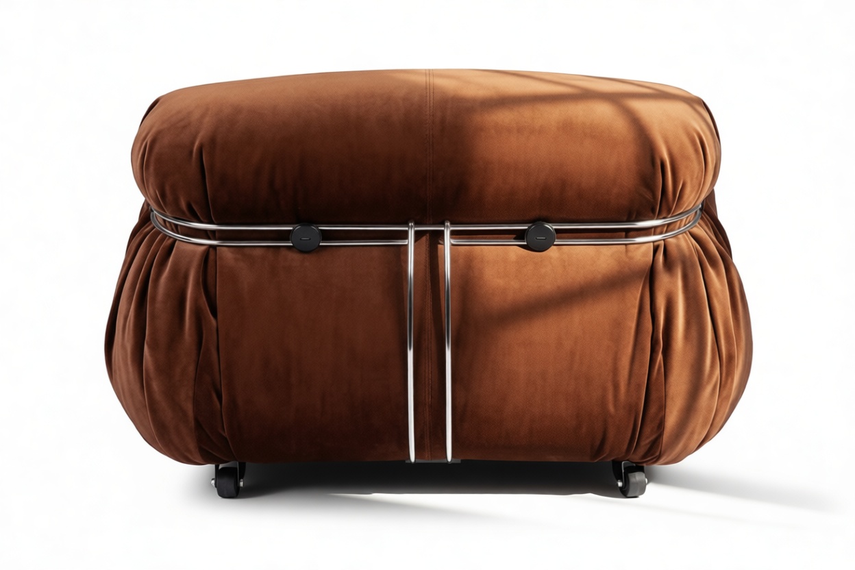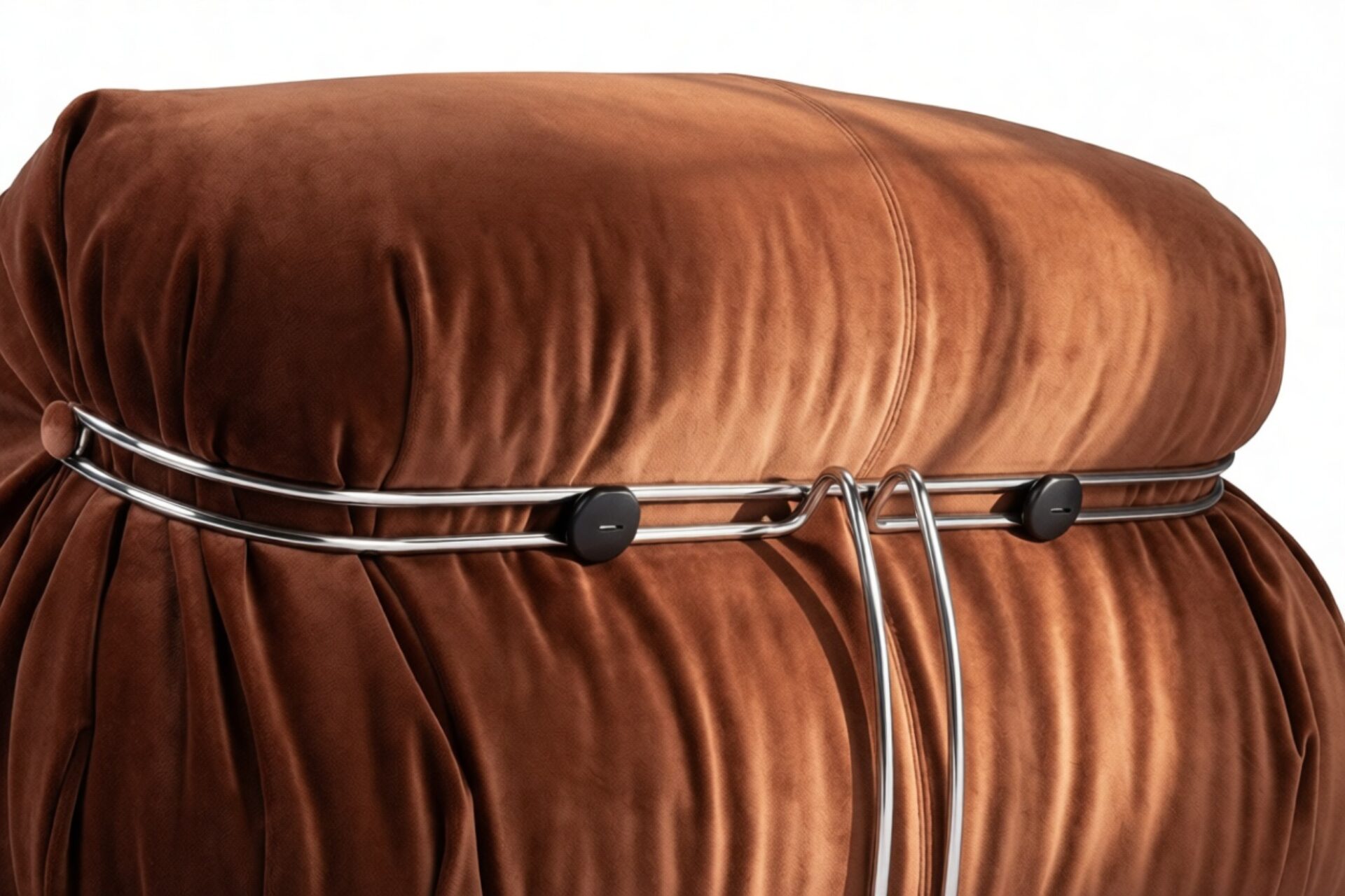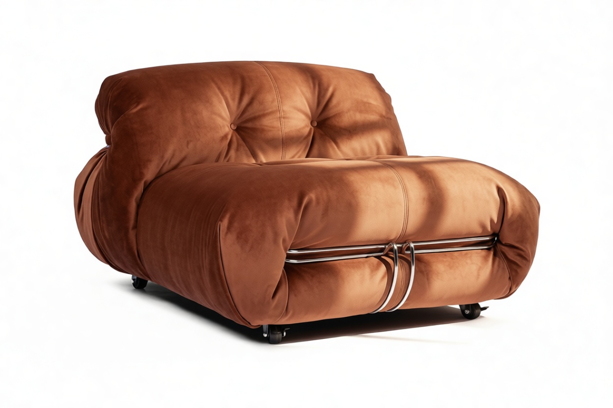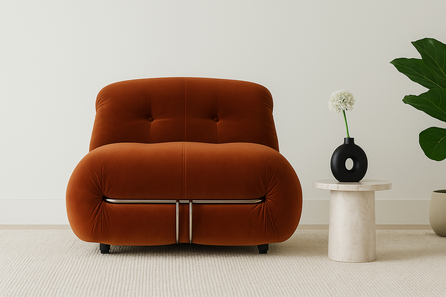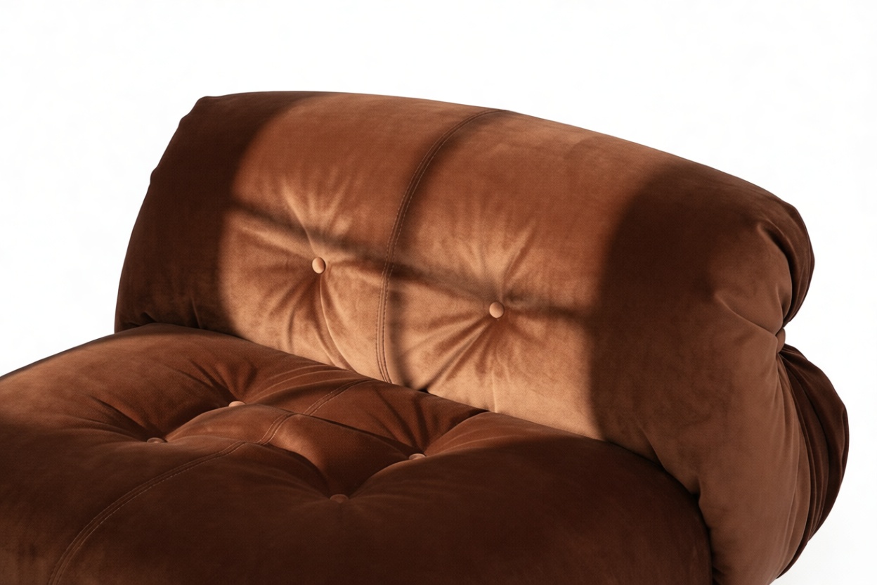 Elevate your space with the iconic 1970s style of the Soriana collection. Experience unparalleled relaxation and comfort with its plush spice velvet upholstery, making a chic statement perfect for any living room, playroom, or office. Embrace the laid-back charm and meticulous craftsmanship of this versatile range that includes coordinating pieces for a complete ensemble.