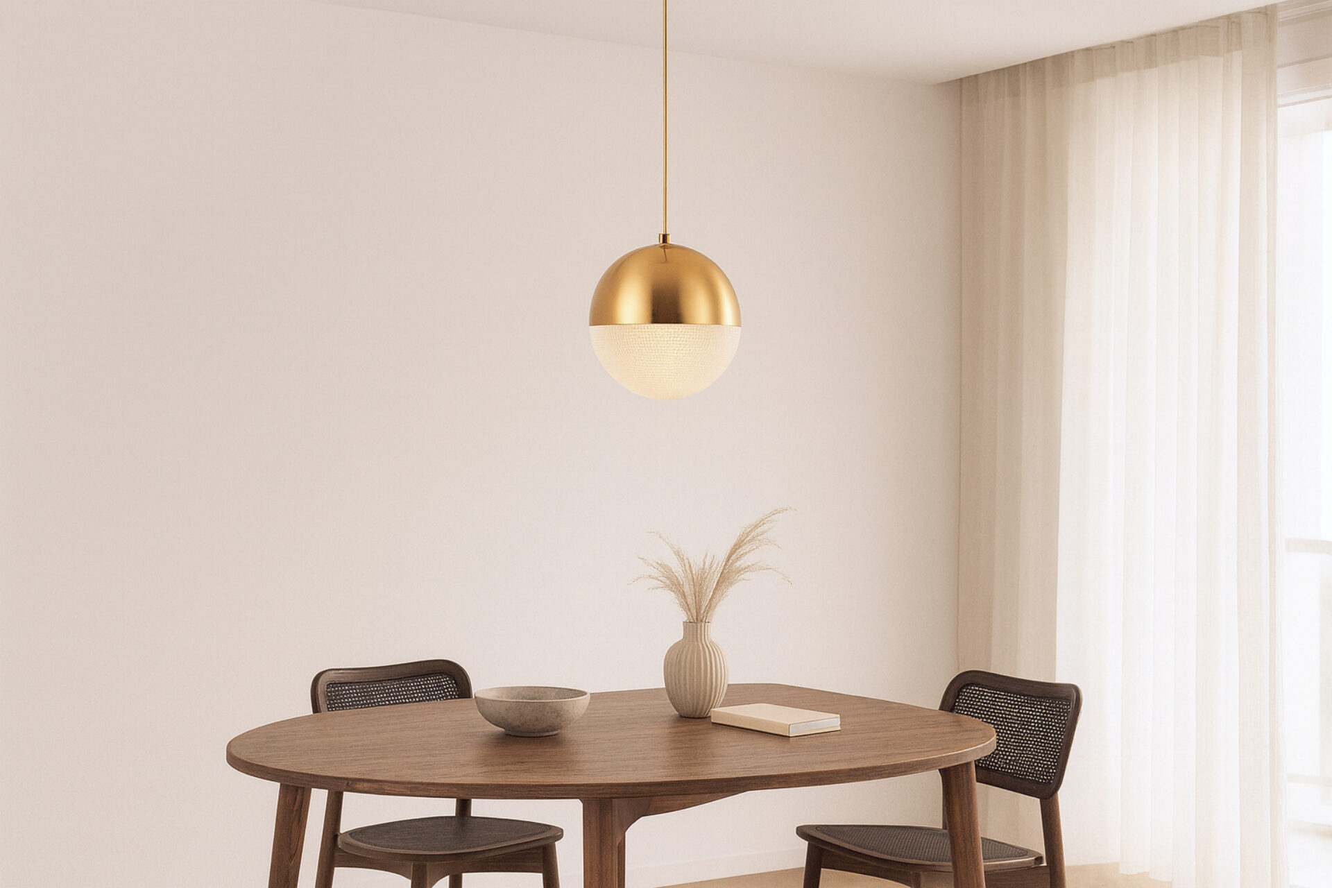 Introducing the exquisite and striking spherical silhouette of the Sunna Pendant Light, which emits light akin to a mini sun. Offered in timeless color options, this light fixture serves as a captivating centerpiece in any room.